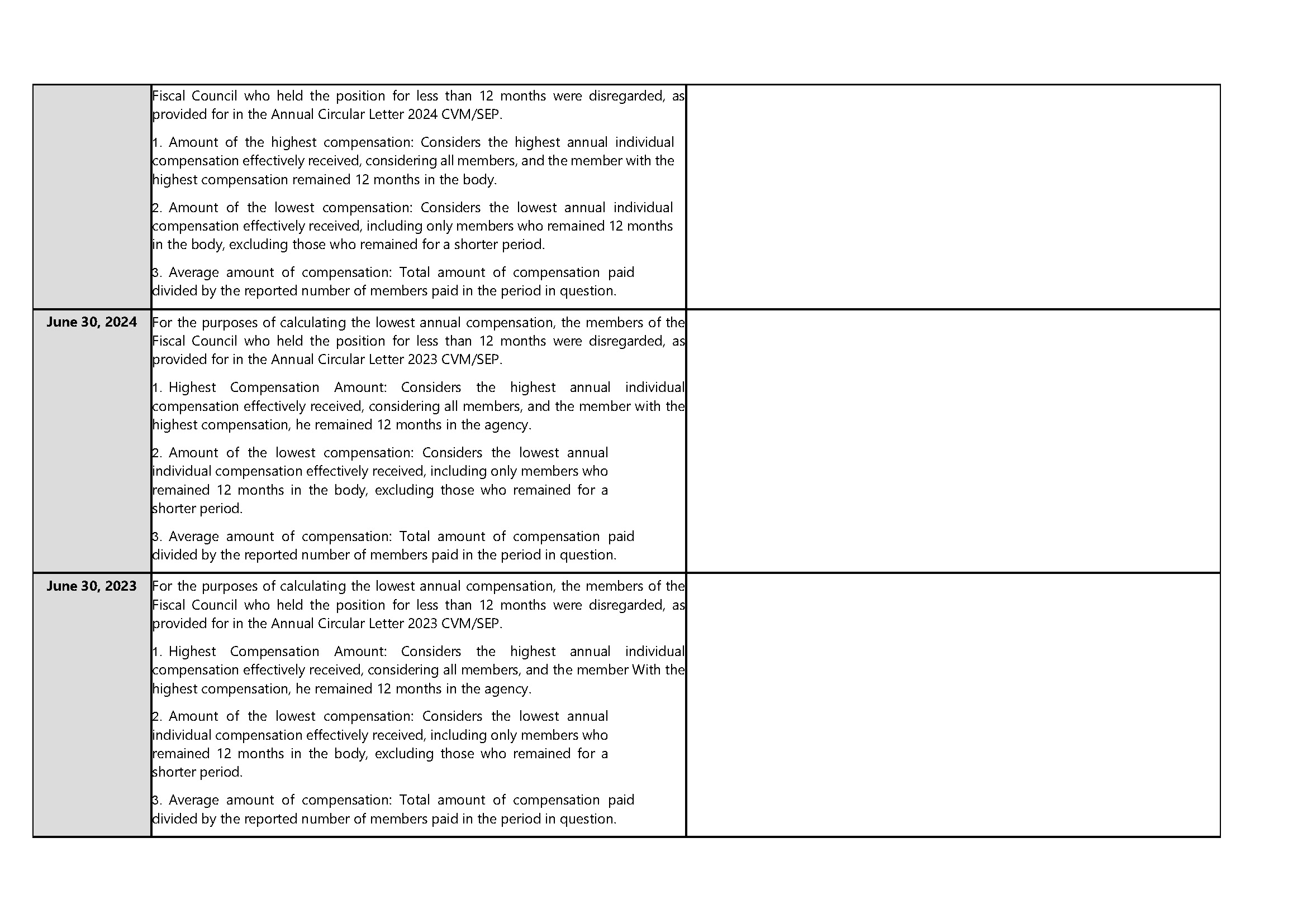 Fiscal Council who held the position for less than 12 months were disregarded, as provided for in the Annual Circular Letter 2024 CVM/SEP. 1. Amount of the highest compensation : Considers the highest annual individual compensation effectively received, considering all members, and the member with the highest compensation remained 12 months in the body . 2. Amount of the lowest compensation : Considers the lowest annual individual compensation effectively received, including only members who remained 12 months in the body, excluding those who remained for a shorter period . 3. Average amount of compensation : Total amount of compensation paid divided by the reported number of members paid in the period in question . For the purposes of calculating the lowest annual compensation, the members of the Fiscal Council who held the position for less than 12 months were disregarded, as provided for in the Annual Circular Letter 2023 CVM/SEP . 1. Highest Compensation Amount : Considers the highest annual individual compensation effectively received, considering all members, and the member with the highest compensation, he remained 12 months in the agency . 2. Amount of the lowest compensation : Considers the lowest annual individual compensation effectively received, including only members who remained 12 months in the body, excluding those who remained for a shorter period . 3. Average amount of compensation : Total amount of compensation paid divided by the reported number of members paid in the period in question . June 30, 2024 For the purposes of calculating the lowest annual compensation, the members of the Fiscal Council who held the position for less than 12 months were disregarded, as provided for in the Annual Circular Letter 2023 CVM/SEP . 1. Highest Compensation Amount : Considers the highest annual individual compensation effectively received, considering all members, and the member With the highest compensation, he remained 12 months in the agency . 2. Amount of the lowest compensation : Considers the lowest annual individual compensation effectively received, including only members who remained 12 months in the body, excluding those who remained for a shorter period . 3. Average amount of compensation : Total amount of compensation paid divided by the reported number of members paid in the period in question . June 30, 2023