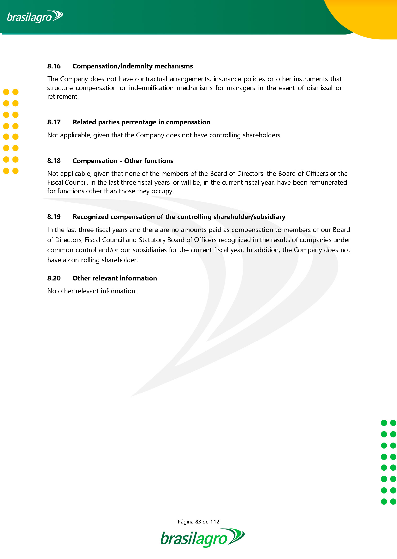 16. Compensation/indemnity mechanisms The Company does not have contractual arrangements, insurance policies or other instruments that structure compensation or indemnification mechanisms for managers in the event of dismissal or retirement . 17. Related parties percentage in compensation Not applicable, given that the Company does not have controlling shareholders . 18. Compensation - Other functions Not applicable, given that none of the members of the Board of Directors, the Board of Officers or the Fiscal Council, in the last three fiscal years, or will be, in the current fiscal year, have been remunerated for functions other than those they occupy . 19. Recognized compensation of the controlling shareholder/subsidiary In the last three fiscal years and there are no amounts paid as compensation to members of our Board of Directors, Fiscal Council and Statutory Board of Officers recognized in the results of companies under common control and/or our subsidiaries for the current fiscal year . In addition, the Company does not have a controlling shareholder . 20. Other relevant information No other relevant information . Página 83 de 112