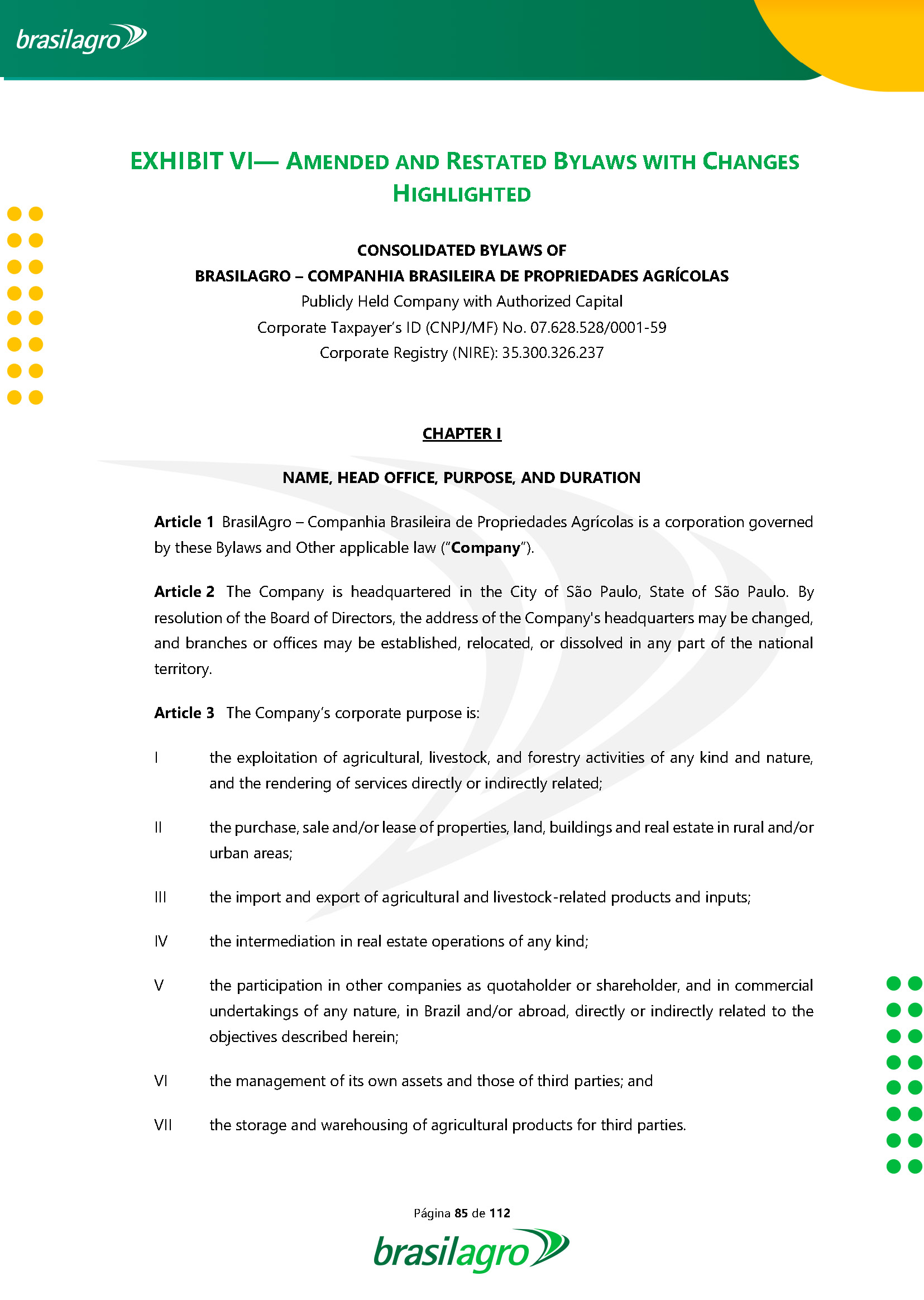 EXHIBIT VI — A MENDED AND R ESTATED B YLAWS WITH C HANGES H IGHLIGHTED CONSOLIDATED BYLAWS OF BRASILAGRO – COMPANHIA BRASILEIRA DE PROPRIEDADES AGRÍCOLAS Publicly Held Company with Authorized Capital Corporate Taxpayer’s ID (CNPJ/MF) No. 07.628.528/0001 - 59 Corporate Registry (NIRE): 35.300.326.237 Página 85 de 112 CHAPTER I NAME, HEAD OFFICE, PURPOSE, AND DURATION Article 1 BrasilAgro – Companhia Brasileira de Propriedades Agrícolas is a corporation governed by these Bylaws and Other applicable law (“ Company ”). Article 2 The Company is headquartered in the City of São Paulo, State of São Paulo . By resolution of the Board of Directors, the address of the Company's headquarters may be changed, and branches or offices may be established, relocated, or dissolved in any part of the national territory . Article 3 The Company’s corporate purpose is: I the exploitation of agricultural, livestock, and forestry activities of any kind and nature, and the rendering of services directly or indirectly related; II the purchase, sale and/or lease of properties, land, buildings and real estate in rural and/or urban areas; III the import and export of agricultural and livestock - related products and inputs; IV the intermediation in real estate operations of any kind; V the participation in other companies as quotaholder or shareholder, and in commercial undertakings of any nature, in Brazil and/or abroad, directly or indirectly related to the objectives described herein ; VI the management of its own assets and those of third parties; and VII the storage and warehousing of agricultural products for third parties.