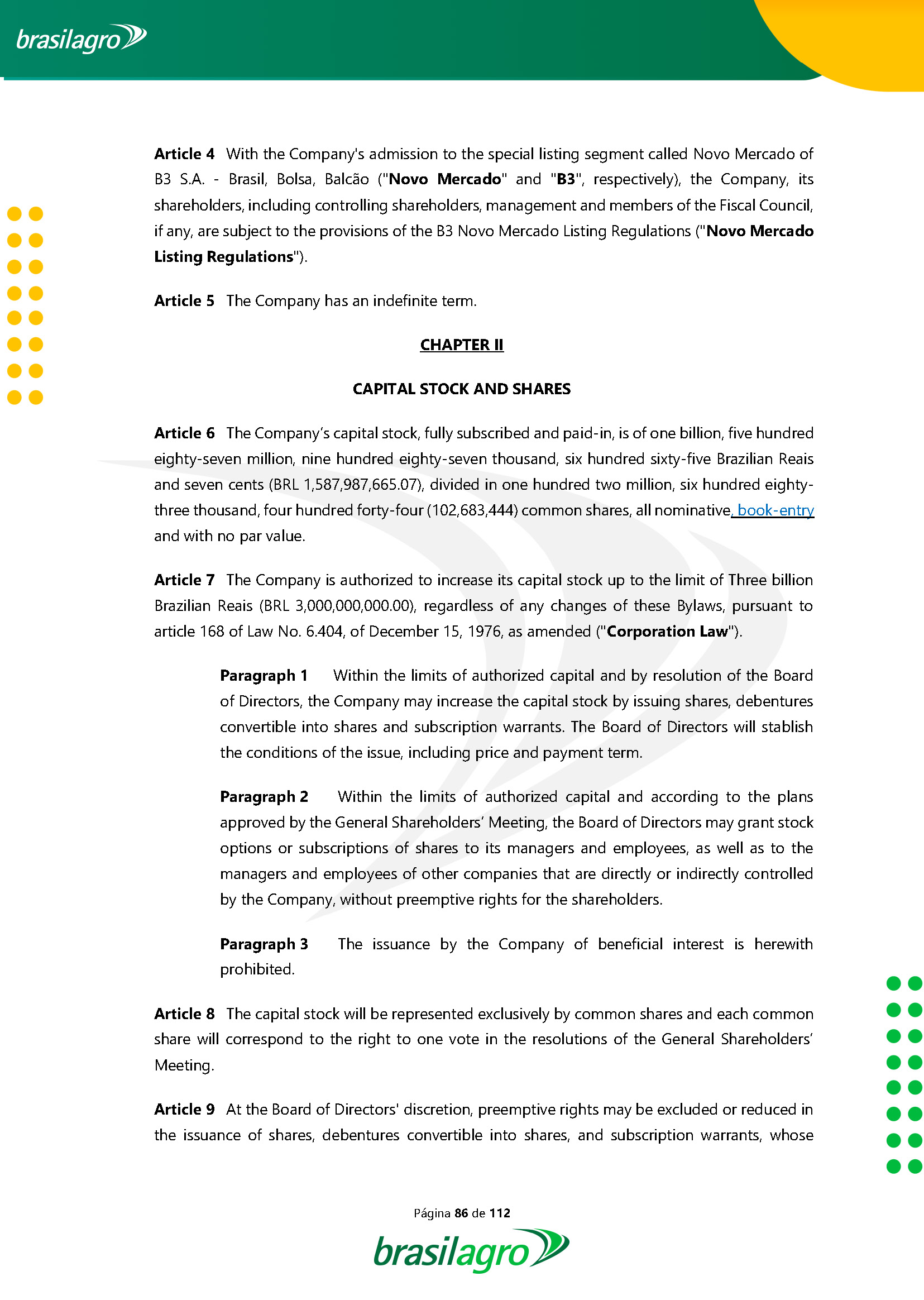 Article 4 With the Company's admission to the special listing segment called Novo Mercado of B 3 S . A . - Brasil, Bolsa, Balcão (" Novo Mercado " and " B 3 ", respectively), the Company, its shareholders, including controlling shareholders, management and members of the Fiscal Council, if any, are subject to the provisions of the B 3 Novo Mercado Listing Regulations (" Novo Mercado Listing Regulations ") . Article 5 The Company has an indefinite term . CHAPTER II CAPITAL STOCK AND SHARES Article 6 The Company’s capital stock, fully subscribed and paid - in, is of one billion, five hundred eighty - seven million, nine hundred eighty - seven thousand, six hundred sixty - five Brazilian Reais and seven cents (BRL 1 , 587 , 987 , 665 . 07 ), divided in one hundred two million, six hundred eighty - three thousand, four hundred forty - four ( 102 , 683 , 444 ) common shares, all nominative , book - entry and with no par value . Article 7 The Company is authorized to increase its capital stock up to the limit of Three billion Brazilian Reais (BRL 3 , 000 , 000 , 000 . 00 ), regardless of any changes of these Bylaws, pursuant to article 168 of Law No . 6 . 404 , of December 15 , 1976 , as amended (" Corporation Law ") . Paragraph 1 Within the limits of authorized capital and by resolution of the Board of Directors, the Company may increase the capital stock by issuing shares, debentures convertible into shares and subscription warrants . The Board of Directors will stablish the conditions of the issue, including price and payment term . Paragraph 2 Within the limits of authorized capital and according to the plans approved by the General Shareholders’ Meeting, the Board of Directors may grant stock options or subscriptions of shares to its managers and employees, as well as to the managers and employees of other companies that are directly or indirectly controlled by the Company, without preemptive rights for the shareholders . Paragraph 3 The issuance by the Company of beneficial interest is herewith prohibited . Article 8 The capital stock will be represented exclusively by common shares and each common share will correspond to the right to one vote in the resolutions of the General Shareholders’ Meeting . Article 9 At the Board of Directors' discretion, preemptive rights may be excluded or reduced in the issuance of shares, debentures convertible into shares, and subscription warrants, whose Página 86 de 112