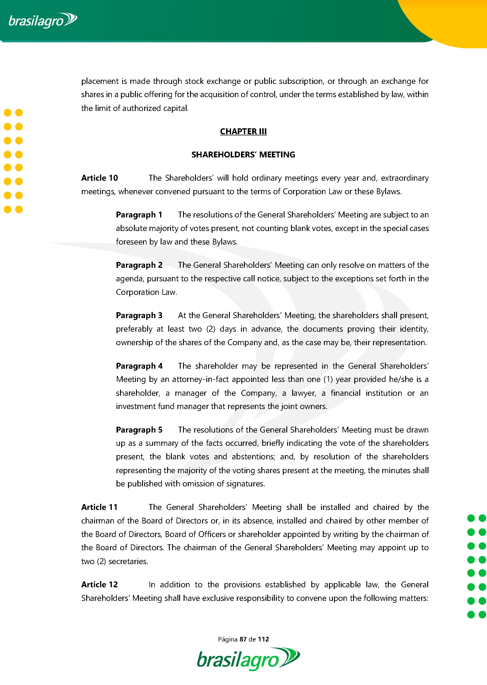 placement is made through stock exchange or public subscription, or through an exchange for shares in a public offering for the acquisition of control, under the terms established by law, within the limit of authorized capital . CHAPTER III SHAREHOLDERS’ MEETING Article 10 The Shareholders’ will hold ordinary meetings every year and, extraordinary meetings, whenever convened pursuant to the terms of Corporation Law or these Bylaws. Paragraph 1 The resolutions of the General Shareholders’ Meeting are subject to an absolute majority of votes present, not counting blank votes, except in the special cases foreseen by law and these Bylaws . Paragraph 2 The General Shareholders’ Meeting can only resolve on matters of the agenda, pursuant to the respective call notice, subject to the exceptions set forth in the Corporation Law . Paragraph 3 At the General Shareholders’ Meeting, the shareholders shall present, preferably at least two ( 2 ) days in advance, the documents proving their identity, ownership of the shares of the Company and, as the case may be, their representation . Paragraph 4 The shareholder may be represented in the General Shareholders’ Meeting by an attorney - in - fact appointed less than one ( 1 ) year provided he/she is a shareholder, a manager of the Company, a lawyer, a financial institution or an investment fund manager that represents the joint owners . Paragraph 5 The resolutions of the General Shareholders’ Meeting must be drawn up as a summary of the facts occurred, briefly indicating the vote of the shareholders present, the blank votes and abstentions ; and, by resolution of the shareholders representing the majority of the voting shares present at the meeting, the minutes shall be published with omission of signatures . Article 11 The General Shareholders’ Meeting shall be installed and chaired by the chairman of the Board of Directors or, in its absence, installed and chaired by other member of the Board of Directors, Board of Officers or shareholder appointed by writing by the chairman of the Board of Directors . The chairman of the General Shareholders’ Meeting may appoint up to two ( 2 ) secretaries . Article 12 In addition to the provisions established by applicable law, the General Shareholders’ Meeting shall have exclusive responsibility to convene upon the following matters: Página 87 de 112