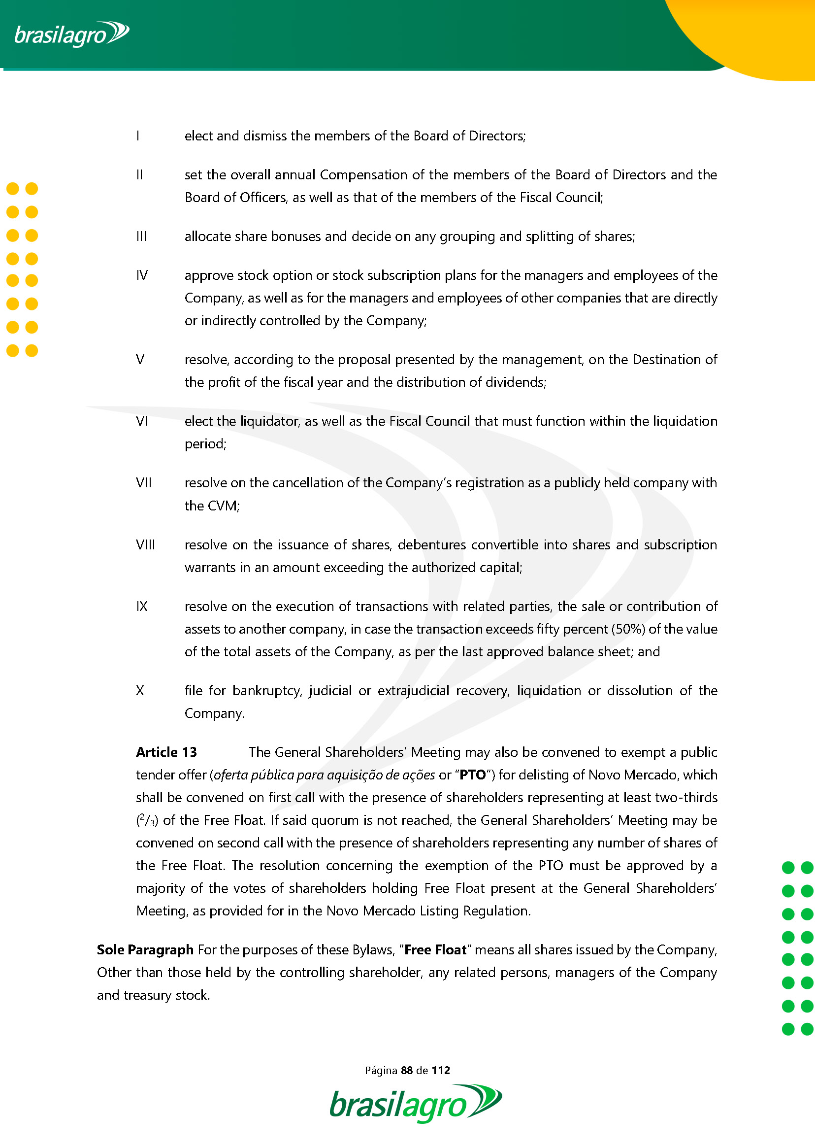 I Página 88 de 112 elect and dismiss the members of the Board of Directors; II set the overall annual Compensation of the members of the Board of Directors and the Board of Officers, as well as that of the members of the Fiscal Council; III allocate share bonuses and decide on any grouping and splitting of shares; IV approve stock option or stock subscription plans for the managers and employees of the Company, as well as for the managers and employees of other companies that are directly or indirectly controlled by the Company ; V resolve, according to the proposal presented by the management, on the Destination of the profit of the fiscal year and the distribution of dividends; VI elect the liquidator, as well as the Fiscal Council that must function within the liquidation period; VII resolve on the cancellation of the Company’s registration as a publicly held company with the CVM; VIII resolve on the issuance of shares, debentures convertible into shares and subscription warrants in an amount exceeding the authorized capital; IX resolve on the execution of transactions with related parties, the sale or contribution of assets to another company, in case the transaction exceeds fifty percent ( 50 % ) of the value of the total assets of the Company, as per the last approved balance sheet ; and X file for bankruptcy, judicial or extrajudicial recovery, liquidation or dissolution of the Company. Article 13 The General Shareholders’ Meeting may also be convened to exempt a public tender offer ( oferta pública para aquisição de ações or “ PTO ”) for delisting of Novo Mercado, which shall be convened on first call with the presence of shareholders representing at least two - thirds ( 2 / 3 ) of the Free Float . If said quorum is not reached, the General Shareholders’ Meeting may be convened on second call with the presence of shareholders representing any number of shares of the Free Float . The resolution concerning the exemption of the PTO must be approved by a majority of the votes of shareholders holding Free Float present at the General Shareholders’ Meeting, as provided for in the Novo Mercado Listing Regulation . Sole Paragraph For the purposes of these Bylaws, “ Free Float ” means all shares issued by the Company, Other than those held by the controlling shareholder, any related persons, managers of the Company and treasury stock .