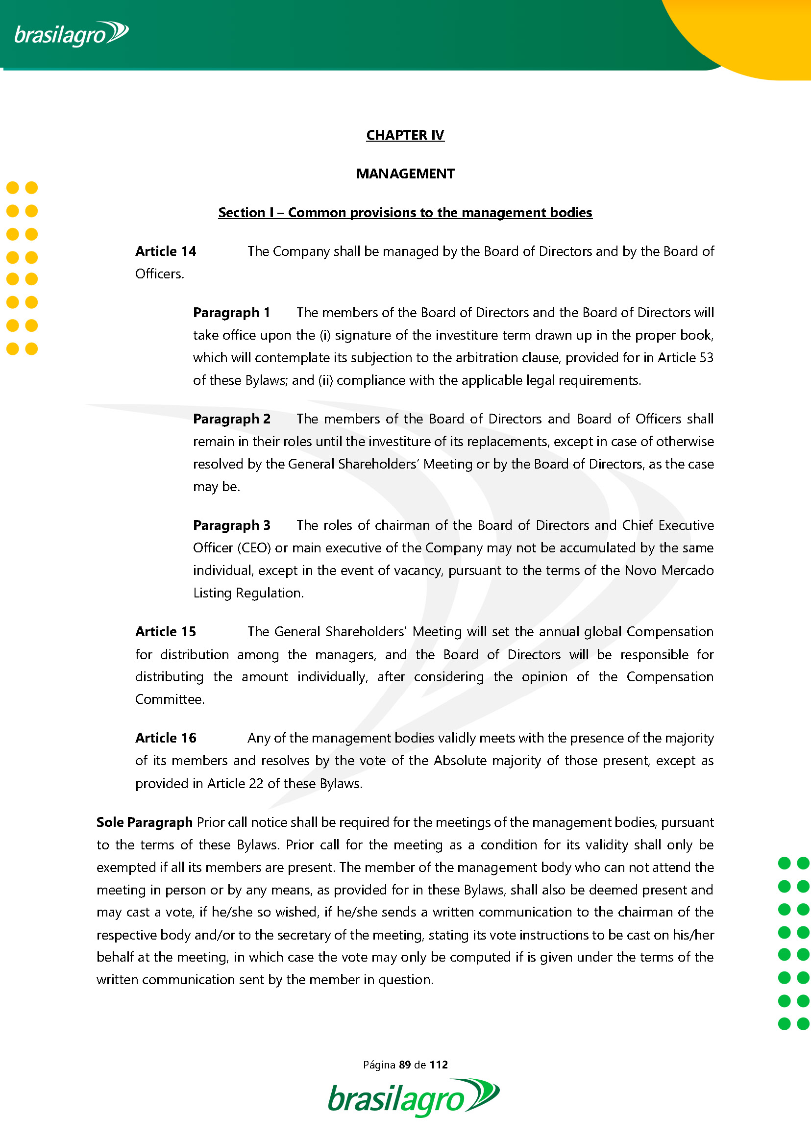 CHAPTER IV MANAGEMENT Section I – Common provisions to the management bodies Página 89 de 112 The Company shall be managed by the Board of Directors and by the Board of Article 14 Officers. Paragraph 1 The members of the Board of Directors and the Board of Directors will take office upon the (i) signature of the investiture term drawn up in the proper book, which will contemplate its subjection to the arbitration clause, provided for in Article 53 of these Bylaws ; and (ii) compliance with the applicable legal requirements . Paragraph 2 The members of the Board of Directors and Board of Officers shall remain in their roles until the investiture of its replacements, except in case of otherwise resolved by the General Shareholders’ Meeting or by the Board of Directors, as the case may be . Paragraph 3 The roles of chairman of the Board of Directors and Chief Executive Officer (CEO) or main executive of the Company may not be accumulated by the same individual, except in the event of vacancy, pursuant to the terms of the Novo Mercado Listing Regulation . Article 15 The General Shareholders’ Meeting will set the annual global Compensation for distribution among the managers, and the Board of Directors will be responsible for distributing the amount individually, after considering the opinion of the Compensation Committee . Article 16 Any of the management bodies validly meets with the presence of the majority of its members and resolves by the vote of the Absolute majority of those present, except as provided in Article 22 of these Bylaws . Sole Paragraph Prior call notice shall be required for the meetings of the management bodies, pursuant to the terms of these Bylaws . Prior call for the meeting as a condition for its validity shall only be exempted if all its members are present . The member of the management body who can not attend the meeting in person or by any means, as provided for in these Bylaws, shall also be deemed present and may cast a vote, if he/she so wished, if he/she sends a written communication to the chairman of the respective body and/or to the secretary of the meeting, stating its vote instructions to be cast on his/her behalf at the meeting, in which case the vote may only be computed if is given under the terms of the written communication sent by the member in question .