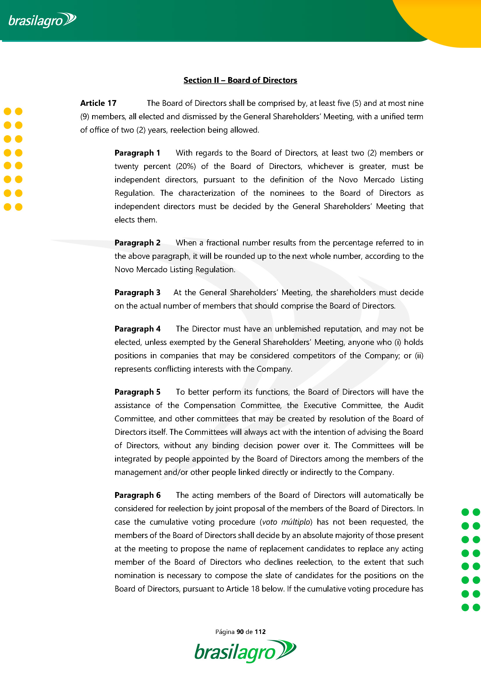 Section II – Board of Directors Article 17 The Board of Directors shall be comprised by, at least five (5) and at most nine (9) members, all elected and dismissed by the General Shareholders’ Meeting, with a unified term of office of two (2) years, reelection being allowed. Paragraph 1 With regards to the Board of Directors, at least two ( 2 ) members or twenty percent ( 20 % ) of the Board of Directors, whichever is greater, must be independent directors, pursuant to the definition of the Novo Mercado Listing Regulation . The characterization of the nominees to the Board of Directors as independent directors must be decided by the General Shareholders’ Meeting that elects them . Paragraph 2 When a fractional number results from the percentage referred to in the above paragraph, it will be rounded up to the next whole number, according to the Novo Mercado Listing Regulation . Paragraph 3 At the General Shareholders’ Meeting, the shareholders must decide on the actual number of members that should comprise the Board of Directors . Paragraph 4 The Director must have an unblemished reputation, and may not be elected, unless exempted by the General Shareholders’ Meeting, anyone who (i) holds positions in companies that may be considered competitors of the Company ; or (ii) represents conflicting interests with the Company . Paragraph 5 To better perform its functions, the Board of Directors will have the assistance of the Compensation Committee, the Executive Committee, the Audit Committee, and other committees that may be created by resolution of the Board of Directors itself . The Committees will always act with the intention of advising the Board of Directors, without any binding decision power over it . The Committees will be integrated by people appointed by the Board of Directors among the members of the management and/or other people linked directly or indirectly to the Company . Paragraph 6 The acting members of the Board of Directors will automatically be considered for reelection by joint proposal of the members of the Board of Directors . In case the cumulative voting procedure ( voto múltiplo ) has not been requested, the members of the Board of Directors shall decide by an absolute majority of those present at the meeting to propose the name of replacement candidates to replace any acting member of the Board of Directors who declines reelection, to the extent that such nomination is necessary to compose the slate of candidates for the positions on the Board of Directors, pursuant to Article 18 below . If the cumulative voting procedure has Página 90 de 112