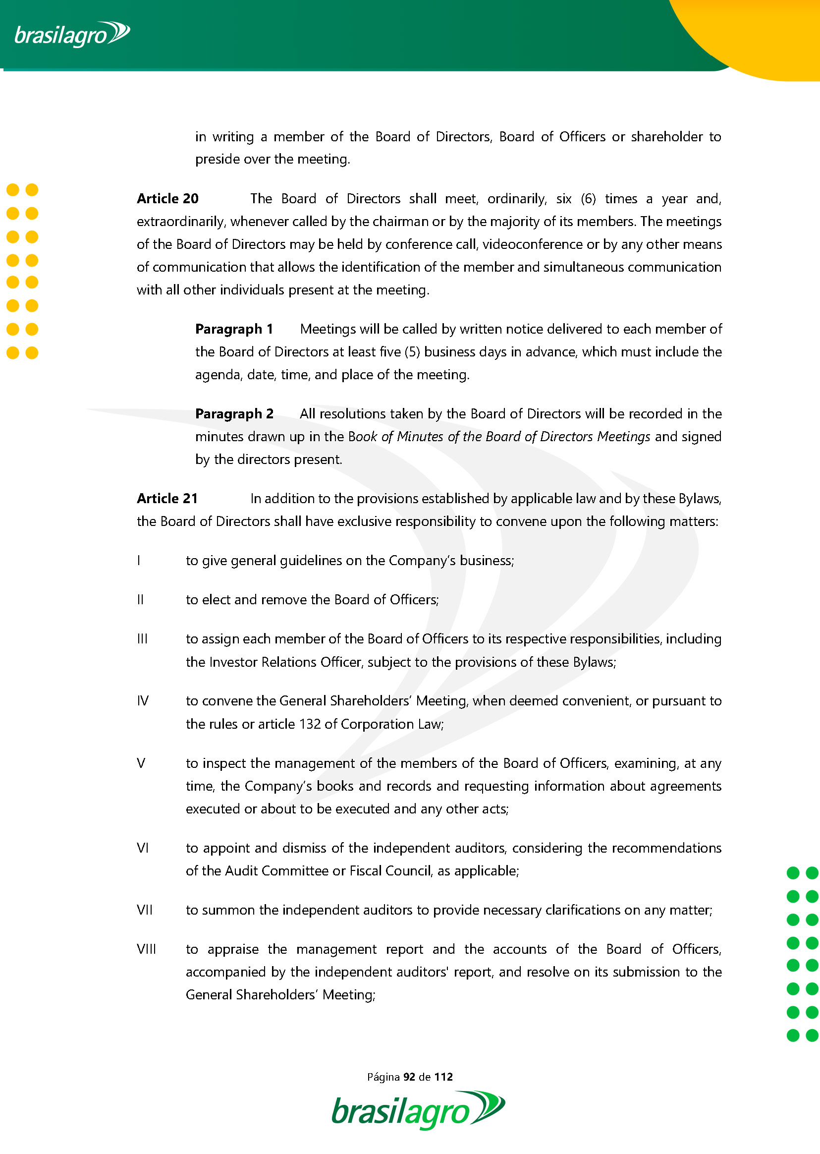 in writing a member of the Board of Directors, Board of Officers or shareholder to preside over the meeting . Article 20 The Board of Directors shall meet, ordinarily, six ( 6 ) times a year and, extraordinarily, whenever called by the chairman or by the majority of its members . The meetings of the Board of Directors may be held by conference call, videoconference or by any other means of communication that allows the identification of the member and simultaneous communication with all other individuals present at the meeting . Paragraph 1 Meetings will be called by written notice delivered to each member of the Board of Directors at least five ( 5 ) business days in advance, which must include the agenda, date, time, and place of the meeting . Paragraph 2 All resolutions taken by the Board of Directors will be recorded in the minutes drawn up in the B ook of Minutes of the Board of Directors Meetings and signed by the directors present . Article 21 In addition to the provisions established by applicable law and by these Bylaws, the Board of Directors shall have exclusive responsibility to convene upon the following matters : I. to give general guidelines on the Company’s business ; II. to elect and remove the Board of Officers; Página 92 de 112 III to assign each member of the Board of Officers to its respective responsibilities, including the Investor Relations Officer, subject to the provisions of these Bylaws; IV to convene the General Shareholders’ Meeting, when deemed convenient, or pursuant to the rules or article 132 of Corporation Law; V to inspect the management of the members of the Board of Officers, examining, at any time, the Company’s books and records and requesting information about agreements executed or about to be executed and any other acts ; VI to appoint and dismiss of the independent auditors, considering the recommendations of the Audit Committee or Fiscal Council, as applicable; VII to summon the independent auditors to provide necessary clarifications on any matter; VIII to appraise the management report and the accounts of the Board of Officers, accompanied by the independent auditors' report, and resolve on its submission to the General Shareholders’ Meeting ;