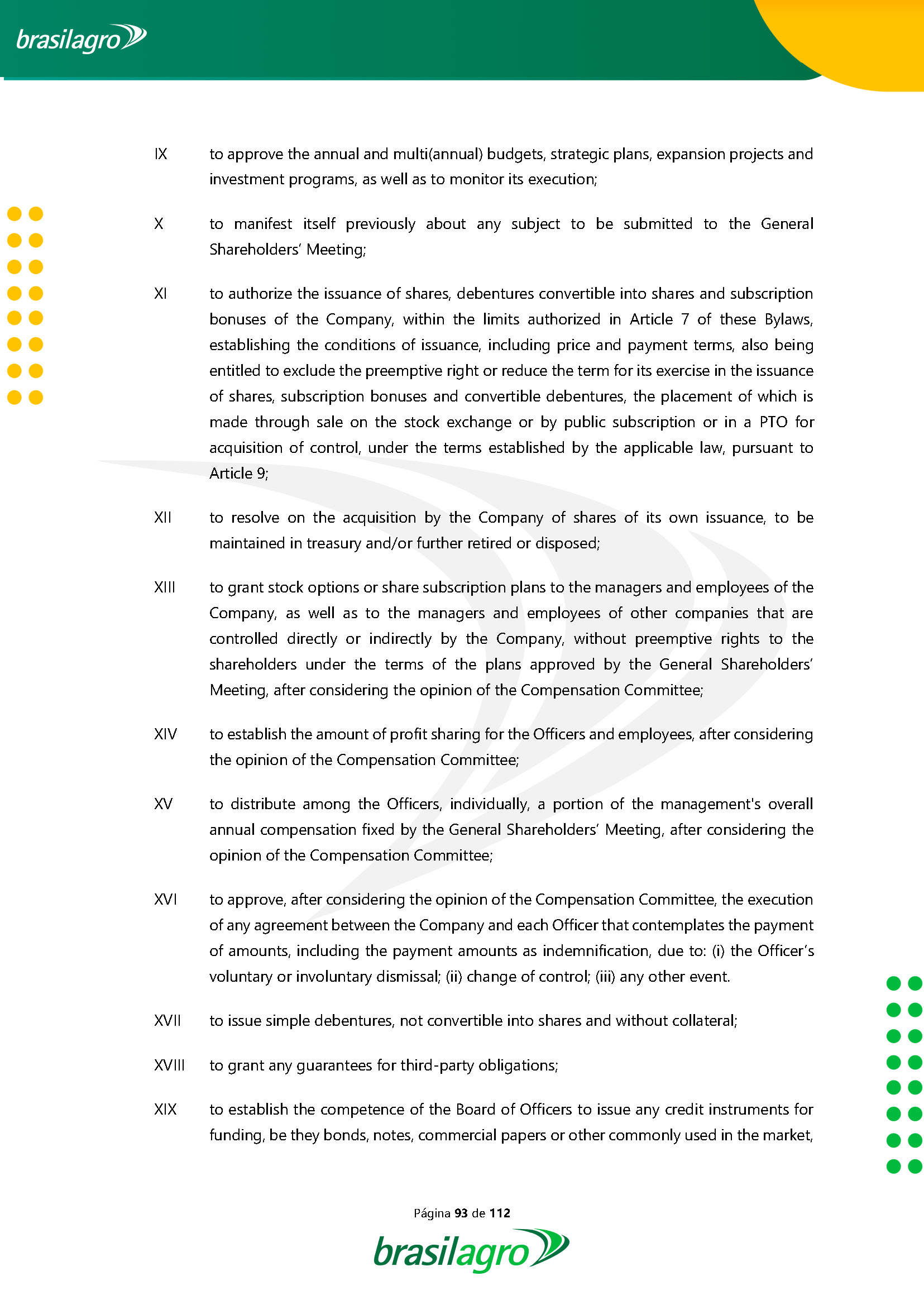 IX Página 93 de 112 to approve the annual and multi(annual) budgets, strategic plans, expansion projects and investment programs, as well as to monitor its execution; X to manifest itself previously about any subject to be submitted to the General Shareholders’ Meeting; XI to authorize the issuance of shares, debentures convertible into shares and subscription bonuses of the Company, within the limits authorized in Article 7 of these Bylaws, establishing the conditions of issuance, including price and payment terms, also being entitled to exclude the preemptive right or reduce the term for its exercise in the issuance of shares, subscription bonuses and convertible debentures, the placement of which is made through sale on the stock exchange or by public subscription or in a PTO for acquisition of control, under the terms established by the applicable law, pursuant to Article 9 ; XII to resolve on the acquisition by the Company of shares of its own issuance, to be maintained in treasury and/or further retired or disposed; XIII to grant stock options or share subscription plans to the managers and employees of the Company, as well as to the managers and employees of other companies that are controlled directly or indirectly by the Company, without preemptive rights to the shareholders under the terms of the plans approved by the General Shareholders’ Meeting, after considering the opinion of the Compensation Committee ; XIV to establish the amount of profit sharing for the Officers and employees, after considering the opinion of the Compensation Committee; XV to distribute among the Officers, individually, a portion of the management's overall annual compensation fixed by the General Shareholders’ Meeting, after considering the opinion of the Compensation Committee ; XVI to approve, after considering the opinion of the Compensation Committee, the execution of any agreement between the Company and each Officer that contemplates the payment of amounts, including the payment amounts as indemnification, due to : (i) the Officer’s voluntary or involuntary dismissal ; (ii) change of control ; (iii) any other event . XVII to issue simple debentures, not convertible into shares and without collateral; XVIII to grant any guarantees for third - party obligations; XIX to establish the competence of the Board of Officers to issue any credit instruments for funding, be they bonds, notes, commercial papers or other commonly used in the market,
