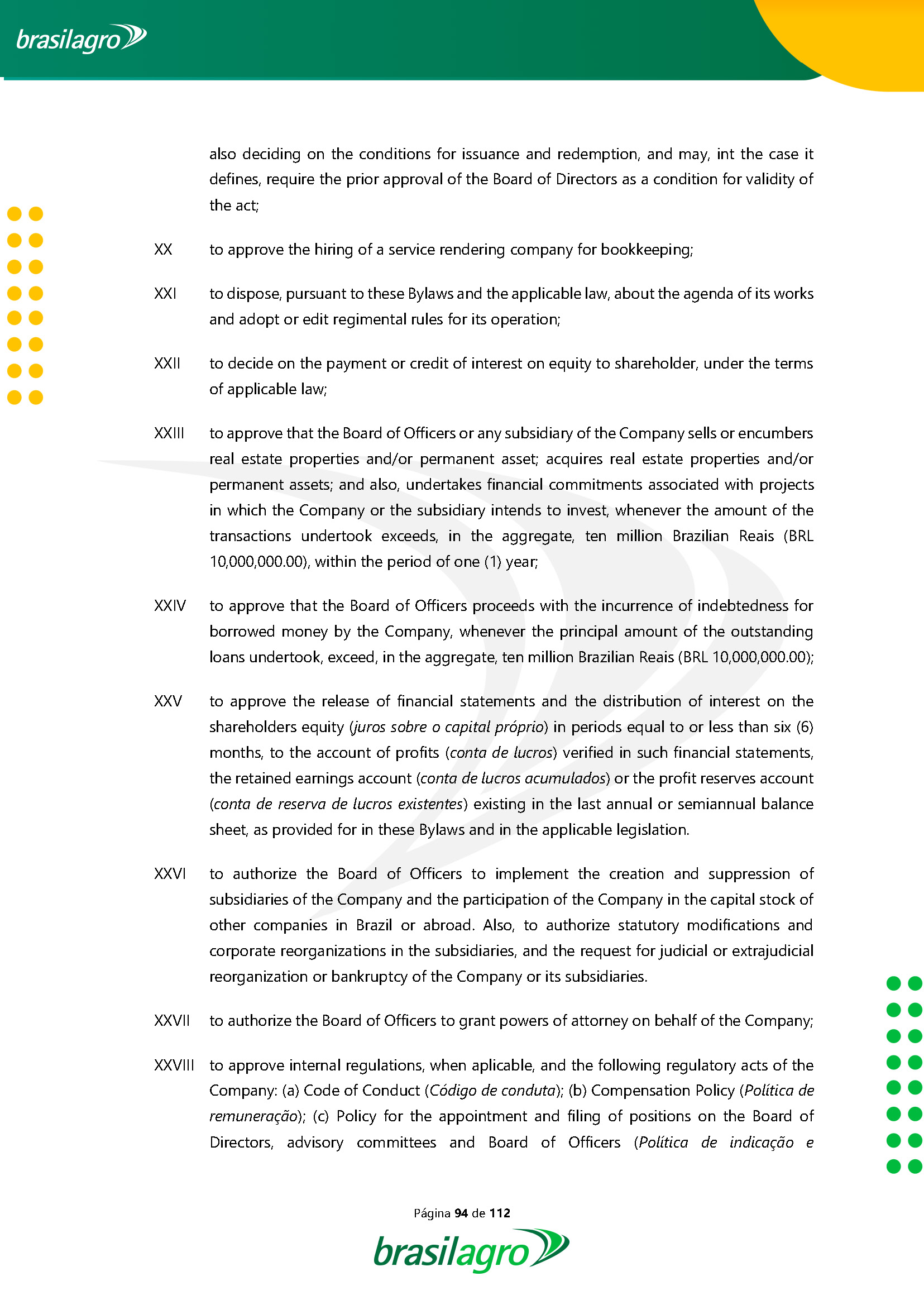 also deciding on the conditions for issuance and redemption, and may, int the case it defines, require the prior approval of the Board of Directors as a condition for validity of the act ; Página 94 de 112 XX to approve the hiring of a service rendering company for bookkeeping; XXI to dispose, pursuant to these Bylaws and the applicable law, about the agenda of its works and adopt or edit regimental rules for its operation; XXII to decide on the payment or credit of interest on equity to shareholder, under the terms of applicable law; XXIII to approve that the Board of Officers or any subsidiary of the Company sells or encumbers real estate properties and/or permanent asset ; acquires real estate properties and/or permanent assets ; and also, undertakes financial commitments associated with projects in which the Company or the subsidiary intends to invest, whenever the amount of the transactions undertook exceeds, in the aggregate, ten million Brazilian Reais (BRL 10 , 000 , 000 . 00 ), within the period of one ( 1 ) year ; XXIV to approve that the Board of Officers proceeds with the incurrence of indebtedness for borrowed money by the Company, whenever the principal amount of the outstanding loans undertook, exceed, in the aggregate, ten million Brazilian Reais (BRL 10 , 000 , 000 . 00 ) ; XXV to approve the release of financial statements and the distribution of interest on the shareholders equity ( juros sobre o capital próprio ) in periods equal to or less than six ( 6 ) months, to the account of profits ( conta de lucros ) verified in such financial statements, the retained earnings account ( conta de lucros acumulados ) or the profit reserves account ( conta de reserva de lucros existentes ) existing in the last annual or semiannual balance sheet, as provided for in these Bylaws and in the applicable legislation . XXVI to authorize the Board of Officers to implement the creation and suppression of subsidiaries of the Company and the participation of the Company in the capital stock of other companies in Brazil or abroad . Also, to authorize statutory modifications and corporate reorganizations in the subsidiaries, and the request for judicial or extrajudicial reorganization or bankruptcy of the Company or its subsidiaries . XXVII to authorize the Board of Officers to grant powers of attorney on behalf of the Company; XXVIII to approve internal regulations, when aplicable, and the following regulatory acts of the Company : (a) Code of Conduct ( Código de conduta ) ; (b) Compensation Policy ( Política de remuneração ) ; (c) Policy for the appointment and filing of positions on the Board of Directors, advisory committees and Board of Officers ( Política de indicação e