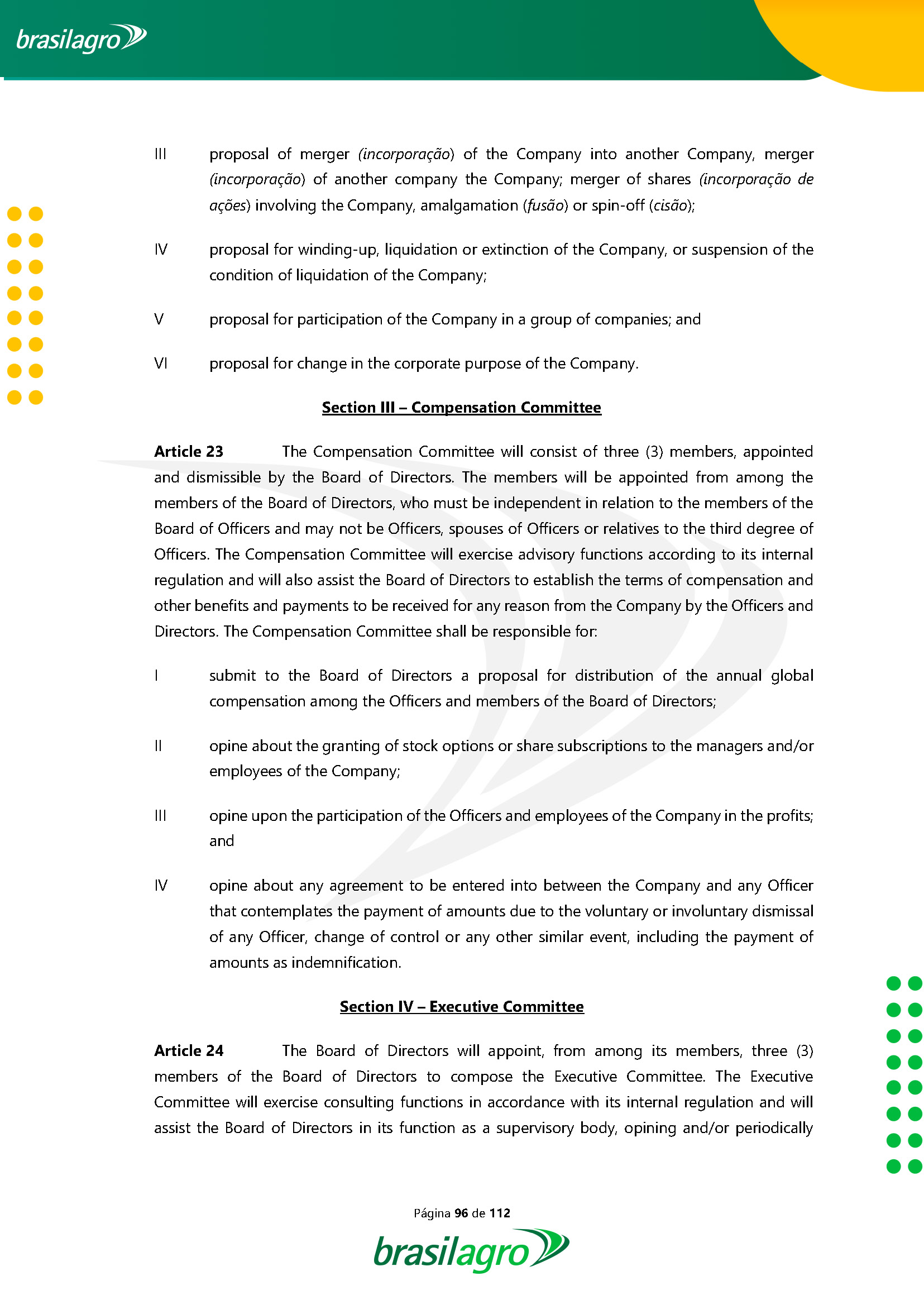 III Página 96 de 112 proposal of merger (incorporação ) of the Company into another Company, merger (incorporação ) of another company the Company ; merger of shares (incorporação de ações ) involving the Company, amalgamation ( fusão ) or spin - off ( cisão ) ; IV proposal for winding - up, liquidation or extinction of the Company, or suspension of the condition of liquidation of the Company; V proposal for participation of the Company in a group of companies; and VI proposal for change in the corporate purpose of the Company. Section III – Compensation Committee Article 23 The Compensation Committee will consist of three ( 3 ) members, appointed and dismissible by the Board of Directors . The members will be appointed from among the members of the Board of Directors, who must be independent in relation to the members of the Board of Officers and may not be Officers, spouses of Officers or relatives to the third degree of Officers . The Compensation Committee will exercise advisory functions according to its internal regulation and will also assist the Board of Directors to establish the terms of compensation and other benefits and payments to be received for any reason from the Company by the Officers and Directors . The Compensation Committee shall be responsible for : I submit to the Board of Directors a proposal for distribution of the annual global compensation among the Officers and members of the Board of Directors; II opine about the granting of stock options or share subscriptions to the managers and/or employees of the Company; III opine upon the participation of the Officers and employees of the Company in the profits; and IV opine about any agreement to be entered into between the Company and any Officer that contemplates the payment of amounts due to the voluntary or involuntary dismissal of any Officer, change of control or any other similar event, including the payment of amounts as indemnification . Section IV – Executive Committee Article 24 The Board of Directors will appoint, from among its members, three ( 3 ) members of the Board of Directors to compose the Executive Committee . The Executive Committee will exercise consulting functions in accordance with its internal regulation and will assist the Board of Directors in its function as a supervisory body, opining and/or periodically