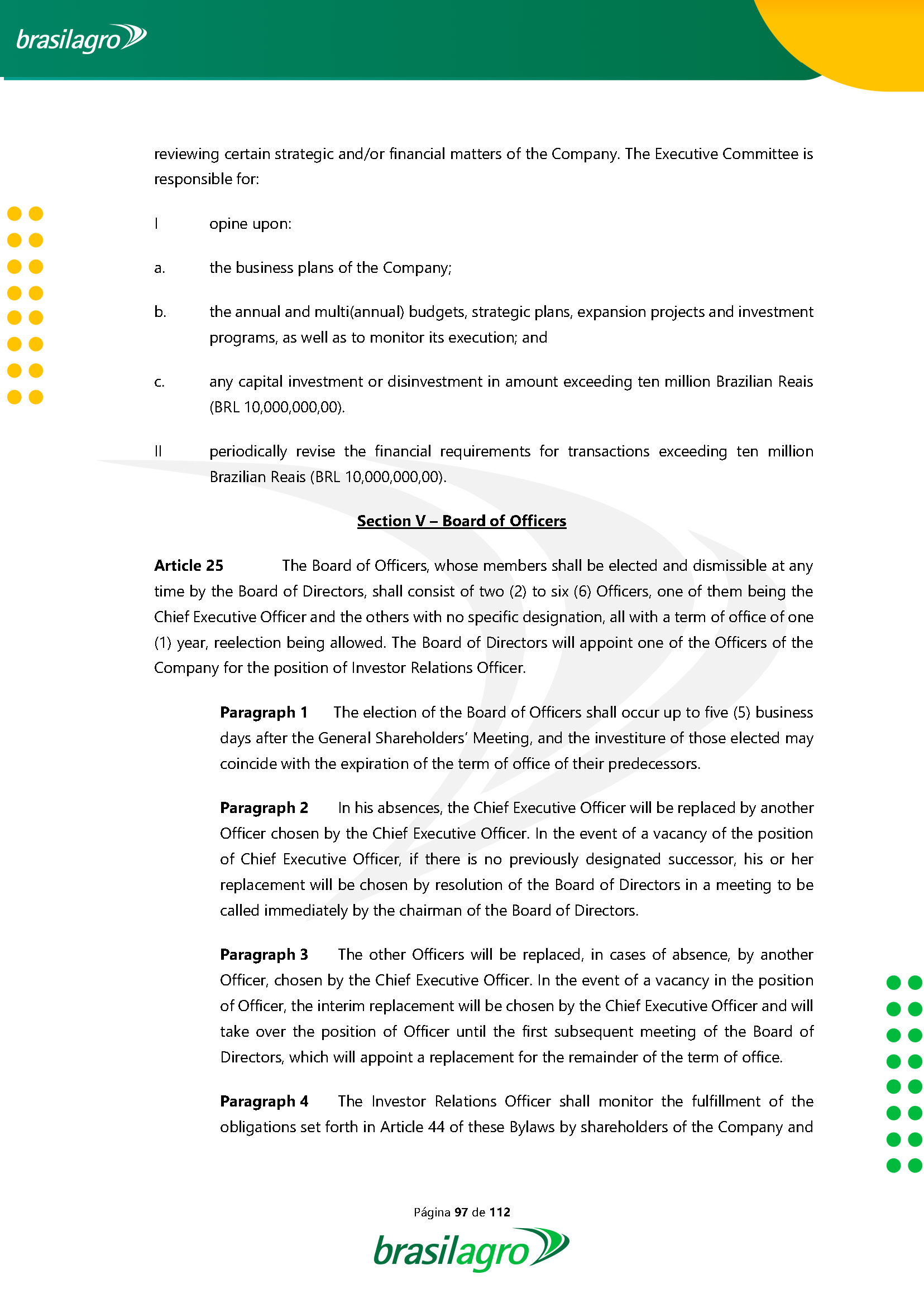 reviewing certain strategic and/or financial matters of the Company. The Executive Committee is responsible for: I opine upon: a. the business plans of the Company; Página 97 de 112 b. the annual and multi(annual) budgets, strategic plans, expansion projects and investment programs, as well as to monitor its execution; and c. any capital investment or disinvestment in amount exceeding ten million Brazilian Reais (BRL 10,000,000,00). II periodically revise the financial requirements for transactions exceeding ten million Brazilian Reais (BRL 10,000,000,00). Section V – Board of Officers Article 25 The Board of Officers, whose members shall be elected and dismissible at any time by the Board of Directors, shall consist of two ( 2 ) to six ( 6 ) Officers, one of them being the Chief Executive Officer and the others with no specific designation, all with a term of office of one ( 1 ) year, reelection being allowed . The Board of Directors will appoint one of the Officers of the Company for the position of Investor Relations Officer . Paragraph 1 The election of the Board of Officers shall occur up to five ( 5 ) business days after the General Shareholders’ Meeting, and the investiture of those elected may coincide with the expiration of the term of office of their predecessors . Paragraph 2 In his absences, the Chief Executive Officer will be replaced by another Officer chosen by the Chief Executive Officer . In the event of a vacancy of the position of Chief Executive Officer, if there is no previously designated successor, his or her replacement will be chosen by resolution of the Board of Directors in a meeting to be called immediately by the chairman of the Board of Directors . Paragraph 3 The other Officers will be replaced, in cases of absence, by another Officer, chosen by the Chief Executive Officer . In the event of a vacancy in the position of Officer, the interim replacement will be chosen by the Chief Executive Officer and will take over the position of Officer until the first subsequent meeting of the Board of Directors, which will appoint a replacement for the remainder of the term of office . Paragraph 4 The Investor Relations Officer shall monitor the fulfillment of the obligations set forth in Article 44 of these Bylaws by shareholders of the Company and