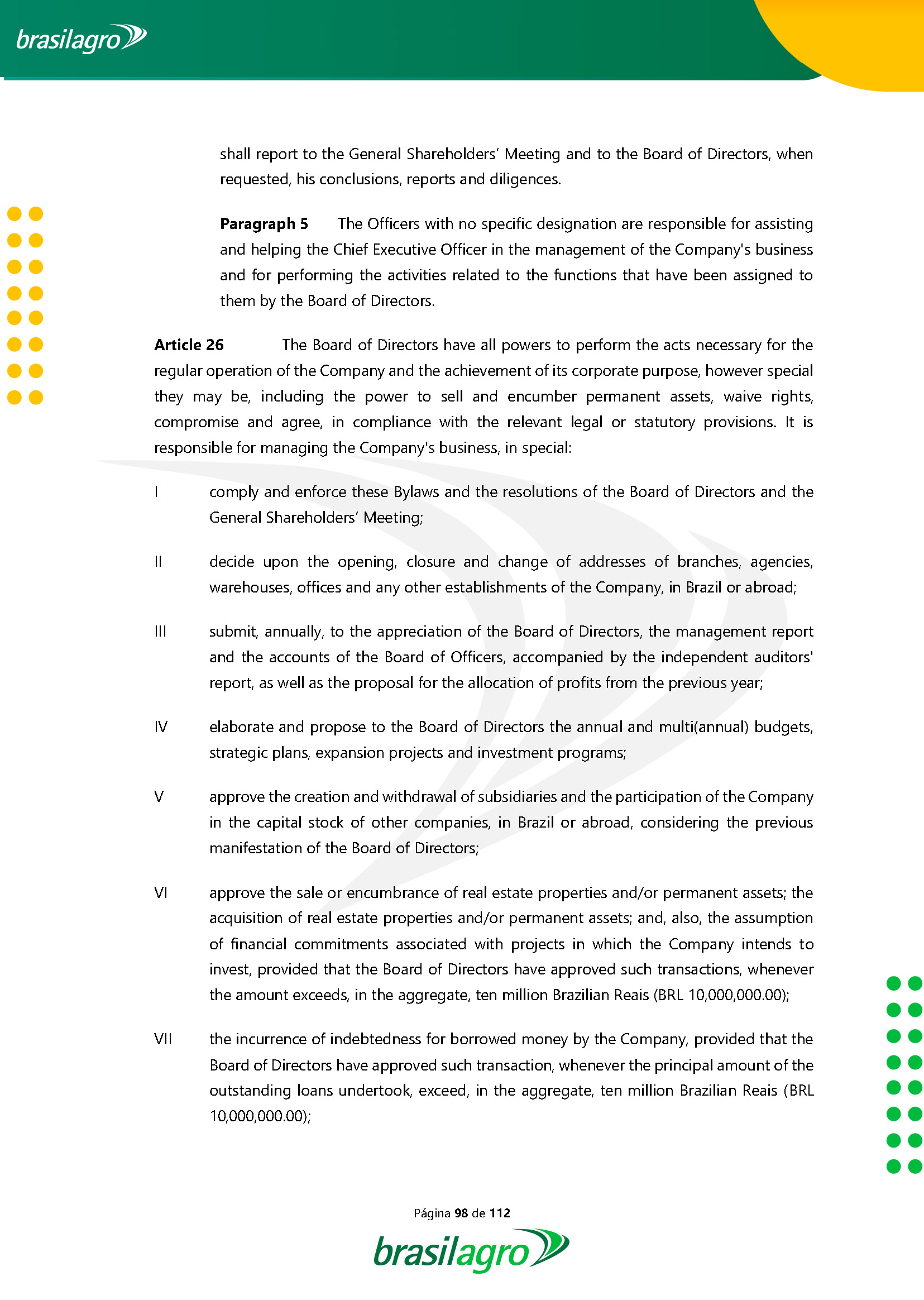 shall report to the General Shareholders’ Meeting and to the Board of Directors, when requested, his conclusions, reports and diligences . Paragraph 5 The Officers with no specific designation are responsible for assisting and helping the Chief Executive Officer in the management of the Company's business and for performing the activities related to the functions that have been assigned to them by the Board of Directors . Article 26 The Board of Directors have all powers to perform the acts necessary for the regular operation of the Company and the achievement of its corporate purpose, however special they may be, including the power to sell and encumber permanent assets, waive rights, compromise and agree, in compliance with the relevant legal or statutory provisions . It is responsible for managing the Company's business, in special : Página 98 de 112 I comply and enforce these Bylaws and the resolutions of the Board of Directors and the General Shareholders’ Meeting; II decide upon the opening, closure and change of addresses of branches, agencies, warehouses, offices and any other establishments of the Company, in Brazil or abroad; III submit, annually, to the appreciation of the Board of Directors, the management report and the accounts of the Board of Officers, accompanied by the independent auditors' report, as well as the proposal for the allocation of profits from the previous year ; IV elaborate and propose to the Board of Directors the annual and multi(annual) budgets, strategic plans, expansion projects and investment programs; V approve the creation and withdrawal of subsidiaries and the participation of the Company in the capital stock of other companies, in Brazil or abroad, considering the previous manifestation of the Board of Directors ; VI approve the sale or encumbrance of real estate properties and/or permanent assets ; the acquisition of real estate properties and/or permanent assets ; and, also, the assumption of financial commitments associated with projects in which the Company intends to invest, provided that the Board of Directors have approved such transactions, whenever the amount exceeds, in the aggregate, ten million Brazilian Reais (BRL 10 , 000 , 000 . 00 ) ; VII the incurrence of indebtedness for borrowed money by the Company, provided that the Board of Directors have approved such transaction, whenever the principal amount of the outstanding loans undertook, exceed, in the aggregate, ten million Brazilian Reais (BRL 10 , 000 , 000 . 00 ) ;