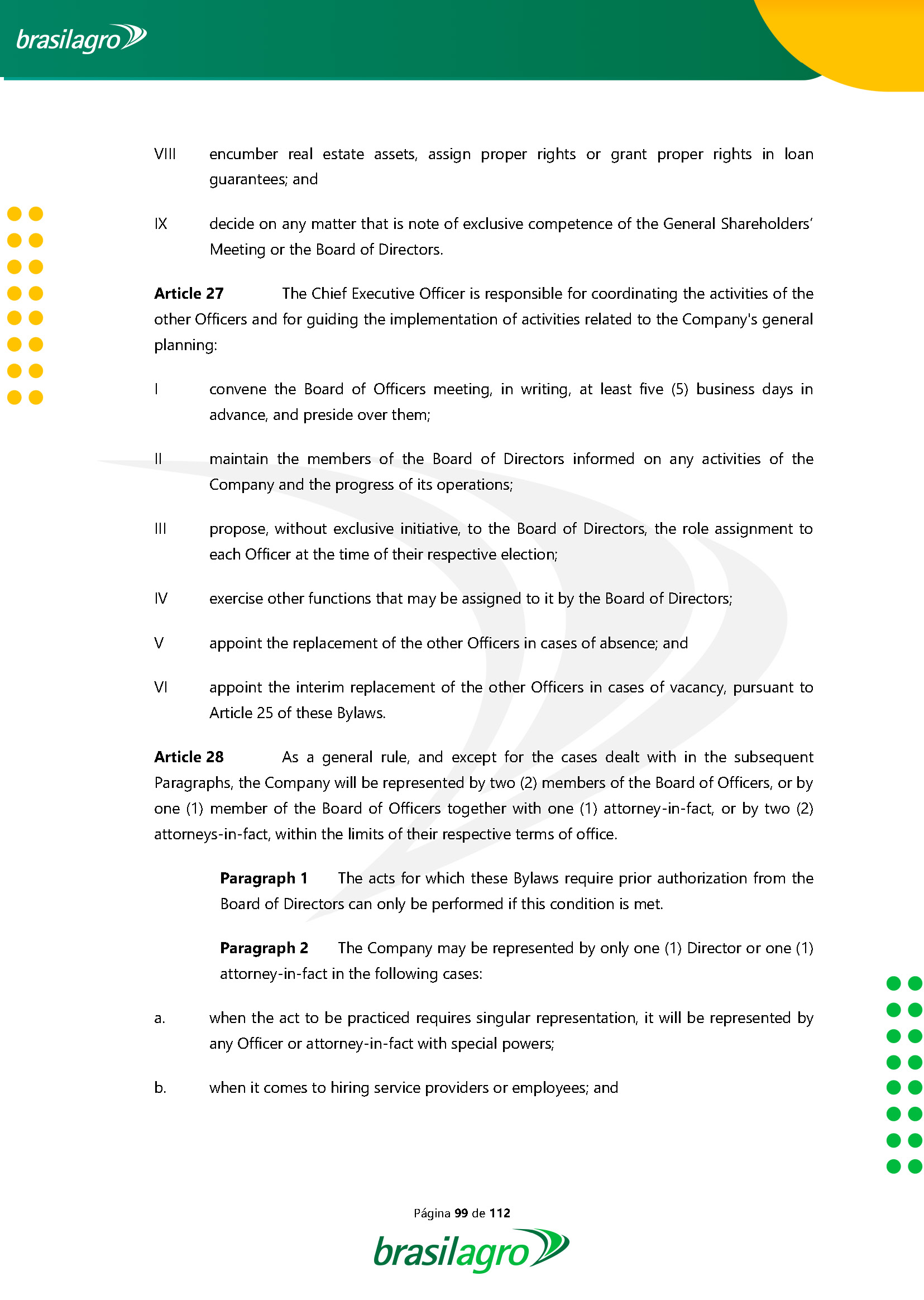 VIII Página 99 de 112 encumber real estate assets, assign proper rights or grant proper rights in loan guarantees; and IX decide on any matter that is note of exclusive competence of the General Shareholders’ Meeting or the Board of Directors. Article 27 The Chief Executive Officer is responsible for coordinating the activities of the other Officers and for guiding the implementation of activities related to the Company's general planning : I convene the Board of Officers meeting, in writing, at least five (5) business days in advance, and preside over them; II maintain the members of the Board of Directors informed on any activities of the Company and the progress of its operations; III propose, without exclusive initiative, to the Board of Directors, the role assignment to each Officer at the time of their respective election; IV exercise other functions that may be assigned to it by the Board of Directors; V appoint the replacement of the other Officers in cases of absence; and VI appoint the interim replacement of the other Officers in cases of vacancy, pursuant to Article 25 of these Bylaws. Article 28 As a general rule, and except for the cases dealt with in the subsequent Paragraphs, the Company will be represented by two ( 2 ) members of the Board of Officers, or by one ( 1 ) member of the Board of Officers together with one ( 1 ) attorney - in - fact, or by two ( 2 ) attorneys - in - fact, within the limits of their respective terms of office . Paragraph 1 The acts for which these Bylaws require prior authorization from the Board of Directors can only be performed if this condition is met. Paragraph 2 The Company may be represented by only one (1) Director or one (1) attorney - in - fact in the following cases: a. when the act to be practiced requires singular representation, it will be represented by any Officer or attorney - in - fact with special powers; b. when it comes to hiring service providers or employees; and