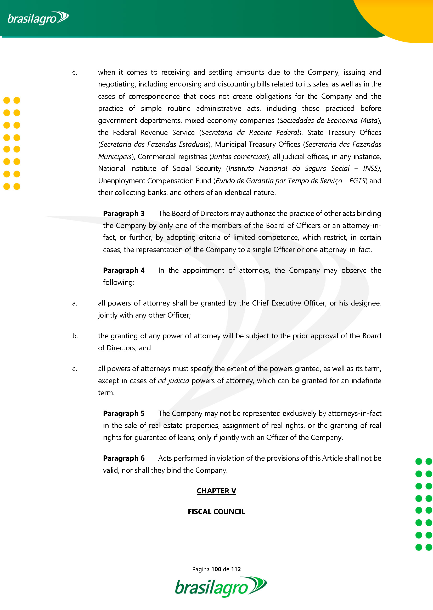 c. Página 100 de 112 when it comes to receiving and settling amounts due to the Company, issuing and negotiating, including endorsing and discounting bills related to its sales, as well as in the cases of correspondence that does not create obligations for the Company and the practice of simple routine administrative acts, including those practiced before government departments, mixed economy companies ( Sociedades de Economia Mista ), the Federal Revenue Service ( Secretaria da Receita Federal ), State Treasury Offices ( Secretaria das Fazendas Estaduais ), Municipal Treasury Offices ( Secretaria das Fazendas Municipais ), Commercial registries ( Juntas comerciais ), all judicial offices, in any instance, National Institute of Social Security ( Instituto Nacional do Seguro Social – INSS) , Unenployment Compensation Fund ( Fundo de Garantia por Tempo de Serviço – FGTS ) and their collecting banks, and others of an identical nature . Paragraph 3 The Board of Directors may authorize the practice of other acts binding the Company by only one of the members of the Board of Officers or an attorney - in - fact, or further, by adopting criteria of limited competence, which restrict, in certain cases, the representation of the Company to a single Officer or one attorney - in - fact . Paragraph 4 In the appointment of attorneys, the Company may observe the following : a. all powers of attorney shall be granted by the Chief Executive Officer, or his designee, jointly with any other Officer; b. the granting of any power of attorney will be subject to the prior approval of the Board of Directors; and c. all powers of attorneys must specify the extent of the powers granted, as well as its term, except in cases of ad judicia powers of attorney, which can be granted for an indefinite term . Paragraph 5 The Company may not be represented exclusively by attorneys - in - fact in the sale of real estate properties, assignment of real rights, or the granting of real rights for guarantee of loans, only if jointly with an Officer of the Company . Paragraph 6 Acts performed in violation of the provisions of this Article shall not be valid, nor shall they bind the Company . CHAPTER V FISCAL COUNCIL