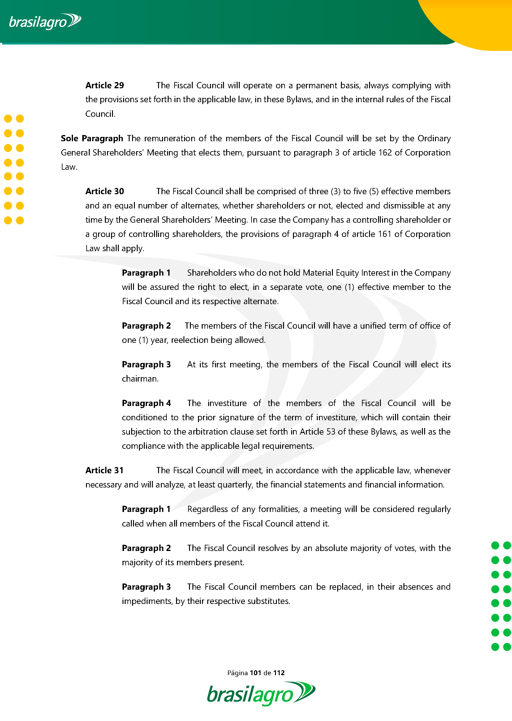 Article 29 The Fiscal Council will operate on a permanent basis, always complying with the provisions set forth in the applicable law, in these Bylaws, and in the internal rules of the Fiscal Council . Sole Paragraph The remuneration of the members of the Fiscal Council will be set by the Ordinary General Shareholders’ Meeting that elects them, pursuant to paragraph 3 of article 162 of Corporation Law . Article 30 The Fiscal Council shall be comprised of three ( 3 ) to five ( 5 ) effective members and an equal number of alternates, whether shareholders or not, elected and dismissible at any time by the General Shareholders’ Meeting . In case the Company has a controlling shareholder or a group of controlling shareholders, the provisions of paragraph 4 of article 161 of Corporation Law shall apply . Paragraph 1 Shareholders who do not hold Material Equity Interest in the Company will be assured the right to elect, in a separate vote, one ( 1 ) effective member to the Fiscal Council and its respective alternate . Paragraph 2 The members of the Fiscal Council will have a unified term of office of one ( 1 ) year, reelection being allowed . Paragraph 3 At its first meeting, the members of the Fiscal Council will elect its chairman . Paragraph 4 The investiture of the members of the Fiscal Council will be conditioned to the prior signature of the term of investiture, which will contain their subjection to the arbitration clause set forth in Article 53 of these Bylaws, as well as the compliance with the applicable legal requirements . Article 31 The Fiscal Council will meet, in accordance with the applicable law, whenever necessary and will analyze, at least quarterly, the financial statements and financial information . Paragraph 1 Regardless of any formalities, a meeting will be considered regularly called when all members of the Fiscal Council attend it . Paragraph 2 The Fiscal Council resolves by an absolute majority of votes, with the majority of its members present . Paragraph 3 The Fiscal Council members can be replaced, in their absences and impediments, by their respective substitutes . Página 101 de 112