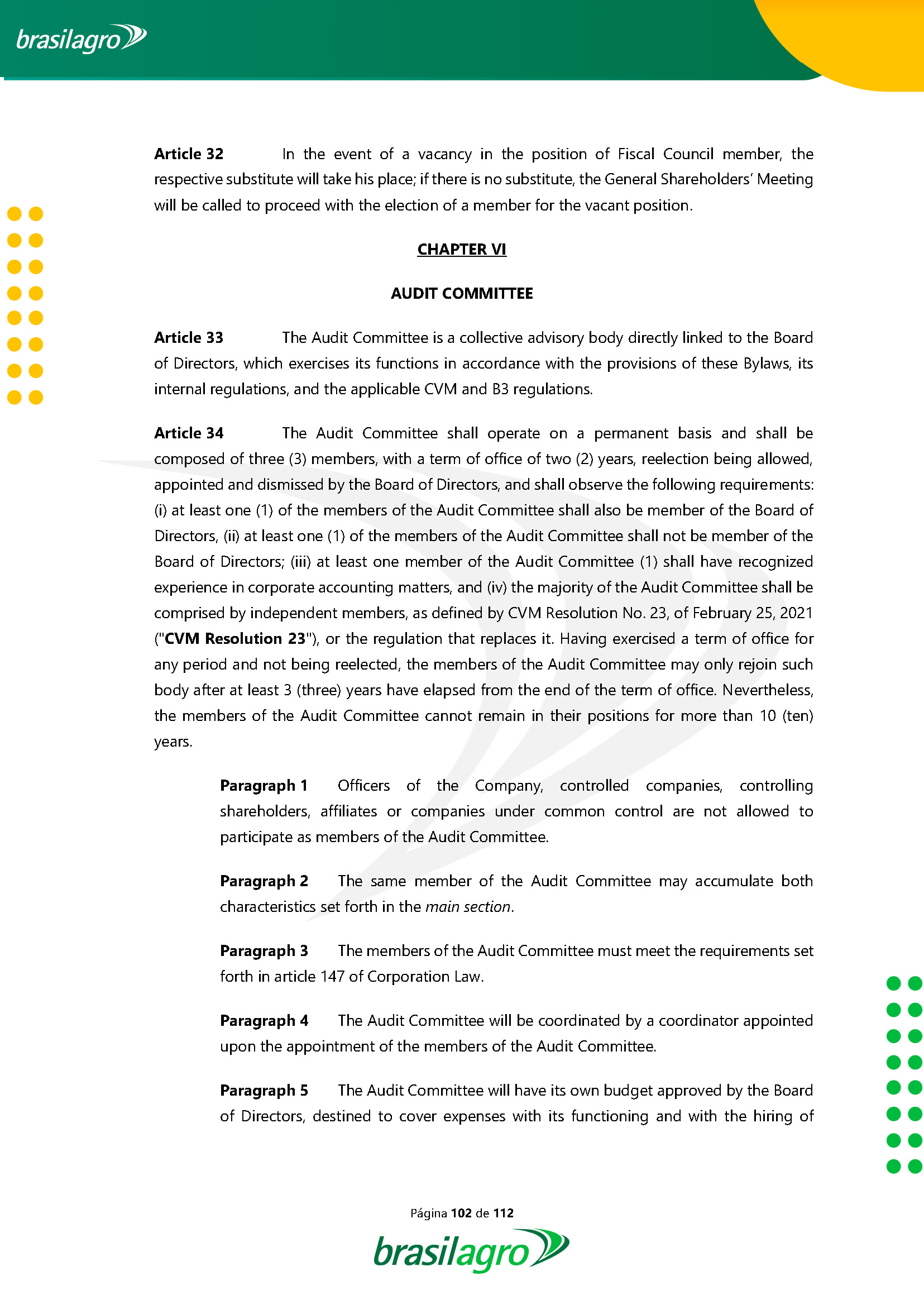 Article 32 In the event of a vacancy in the position of Fiscal Council member, the respective substitute will take his place ; if there is no substitute, the General Shareholders’ Meeting will be called to proceed with the election of a member for the vacant position . CHAPTER VI AUDIT COMMITTEE Article 33 The Audit Committee is a collective advisory body directly linked to the Board of Directors, which exercises its functions in accordance with the provisions of these Bylaws, its internal regulations, and the applicable CVM and B 3 regulations . Article 34 The Audit Committee shall operate on a permanent basis and shall be composed of three ( 3 ) members, with a term of office of two ( 2 ) years, reelection being allowed, appointed and dismissed by the Board of Directors, and shall observe the following requirements : (i) at least one ( 1 ) of the members of the Audit Committee shall also be member of the Board of Directors, (ii) at least one ( 1 ) of the members of the Audit Committee shall not be member of the Board of Directors ; (iii) at least one member of the Audit Committee ( 1 ) shall have recognized experience in corporate accounting matters, and (iv) the majority of the Audit Committee shall be comprised by independent members, as defined by CVM Resolution No . 23 , of February 25 , 2021 (" CVM Resolution 23 "), or the regulation that replaces it . Having exercised a term of office for any period and not being reelected, the members of the Audit Committee may only rejoin such body after at least 3 (three) years have elapsed from the end of the term of office . Nevertheless, the members of the Audit Committee cannot remain in their positions for more than 10 (ten) years . Paragraph 1 Officers of the Company, controlled companies, controlling shareholders, affiliates or companies under common control are not allowed to participate as members of the Audit Committee . Paragraph 2 The same member of the Audit Committee may accumulate both characteristics set forth in the main section . Paragraph 3 The members of the Audit Committee must meet the requirements set forth in article 147 of Corporation Law . Paragraph 4 The Audit Committee will be coordinated by a coordinator appointed upon the appointment of the members of the Audit Committee . Paragraph 5 The Audit Committee will have its own budget approved by the Board of Directors, destined to cover expenses with its functioning and with the hiring of Página 102 de 112