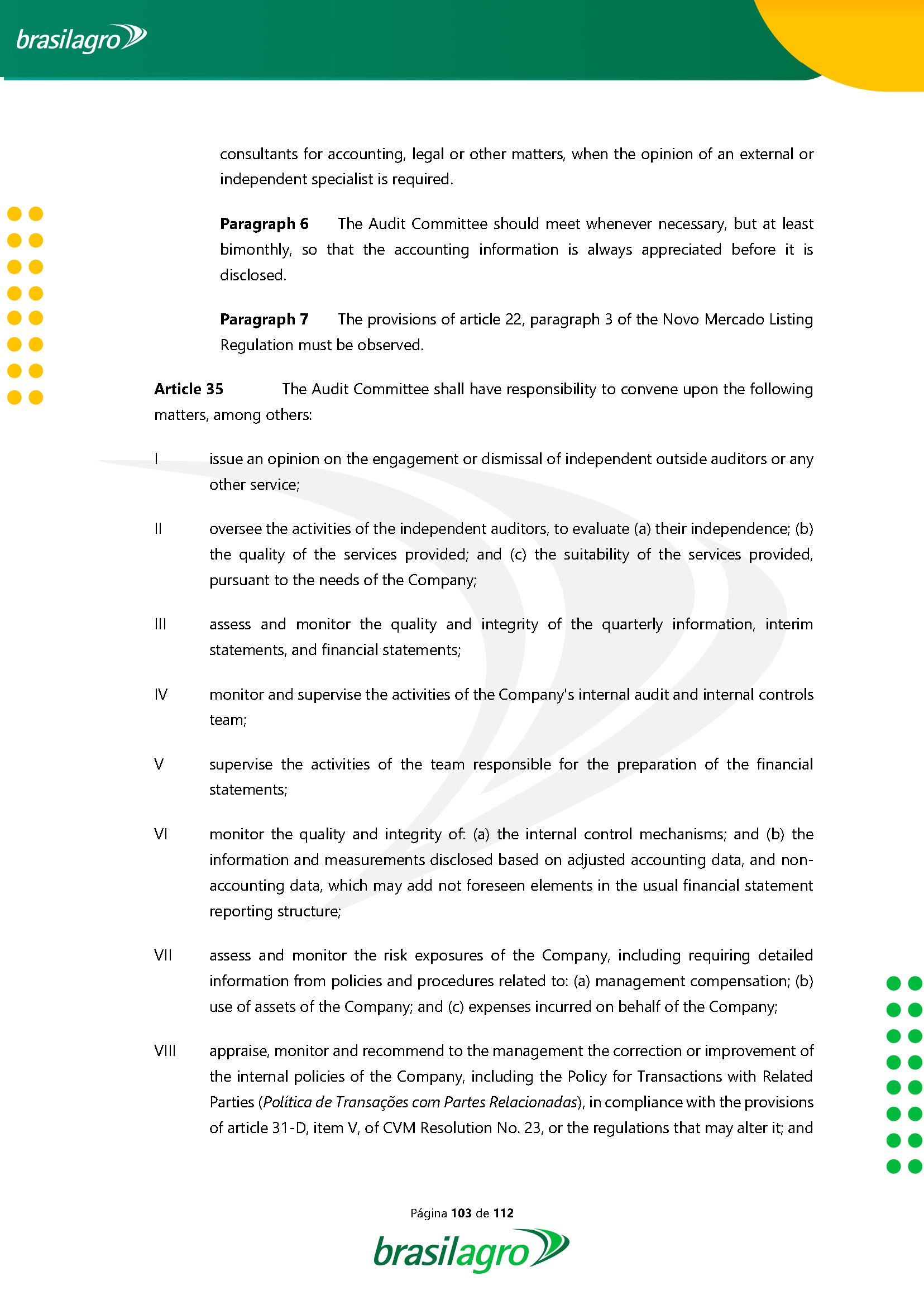consultants for accounting, legal or other matters, when the opinion of an external or independent specialist is required . Paragraph 6 The Audit Committee should meet whenever necessary, but at least bimonthly, so that the accounting information is always appreciated before it is disclosed . Paragraph 7 The provisions of article 22 , paragraph 3 of the Novo Mercado Listing Regulation must be observed . Article 35 The Audit Committee shall have responsibility to convene upon the following matters, among others: Página 103 de 112 I issue an opinion on the engagement or dismissal of independent outside auditors or any other service; II oversee the activities of the independent auditors, to evaluate (a) their independence ; (b) the quality of the services provided ; and (c) the suitability of the services provided, pursuant to the needs of the Company ; III assess and monitor the quality and integrity of the quarterly information, interim statements, and financial statements; IV monitor and supervise the activities of the Company's internal audit and internal controls team; V supervise the activities of the team responsible for the preparation of the financial statements; VI monitor the quality and integrity of : (a) the internal control mechanisms ; and (b) the information and measurements disclosed based on adjusted accounting data, and non - accounting data, which may add not foreseen elements in the usual financial statement reporting structure ; VII assess and monitor the risk exposures of the Company, including requiring detailed information from policies and procedures related to : (a) management compensation ; (b) use of assets of the Company ; and (c) expenses incurred on behalf of the Company ; VIII appraise, monitor and recommend to the management the correction or improvement of the internal policies of the Company, including the Policy for Transactions with Related Parties ( Política de Transações com Partes Relacionadas ), in compliance with the provisions of article 31 - D, item V, of CVM Resolution No . 23 , or the regulations that may alter it ; and