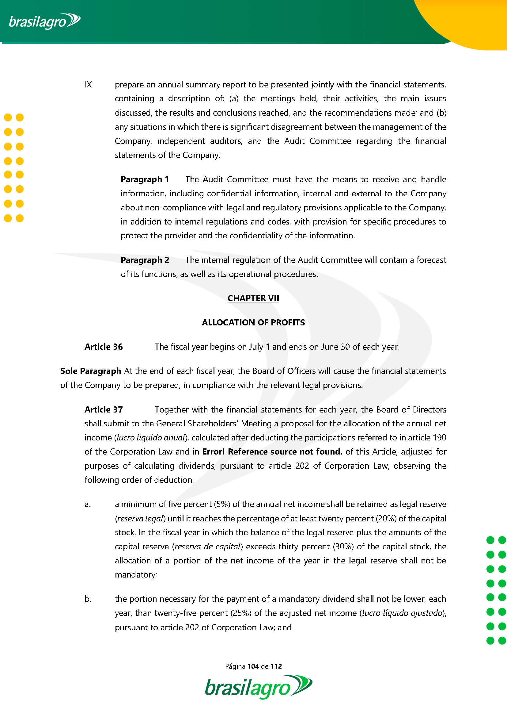 IX Página 104 de 112 prepare an annual summary report to be presented jointly with the financial statements, containing a description of : (a) the meetings held, their activities, the main issues discussed, the results and conclusions reached, and the recommendations made ; and (b) any situations in which there is significant disagreement between the management of the Company, independent auditors, and the Audit Committee regarding the financial statements of the Company . Paragraph 1 The Audit Committee must have the means to receive and handle information, including confidential information, internal and external to the Company about non - compliance with legal and regulatory provisions applicable to the Company, in addition to internal regulations and codes, with provision for specific procedures to protect the provider and the confidentiality of the information . Paragraph 2 The internal regulation of the Audit Committee will contain a forecast of its functions, as well as its operational procedures . CHAPTER VII ALLOCATION OF PROFITS Article 36 The fiscal year begins on July 1 and ends on June 30 of each year . Sole Paragraph At the end of each fiscal year, the Board of Officers will cause the financial statements of the Company to be prepared, in compliance with the relevant legal provisions. Article 37 Together with the financial statements for each year, the Board of Directors shall submit to the General Shareholders’ Meeting a proposal for the allocation of the annual net income ( lucro líquido anual ), calculated after deducting the participations referred to in article 190 of the Corporation Law and in Error! Reference source not found . of this Article, adjusted for purposes of calculating dividends, pursuant to article 202 of Corporation Law, observing the following order of deduction : a. a minimum of five percent ( 5 % ) of the annual net income shall be retained as legal reserve ( reserva legal ) until it reaches the percentage of at least twenty percent ( 20 % ) of the capital stock . In the fiscal year in which the balance of the legal reserve plus the amounts of the capital reserve ( reserva de capital ) exceeds thirty percent ( 30 % ) of the capital stock, the allocation of a portion of the net income of the year in the legal reserve shall not be mandatory ; b. the portion necessary for the payment of a mandatory dividend shall not be lower, each year, than twenty - five percent ( 25 % ) of the adjusted net income ( lucro líquido ajustado ), pursuant to article 202 of Corporation Law ; and