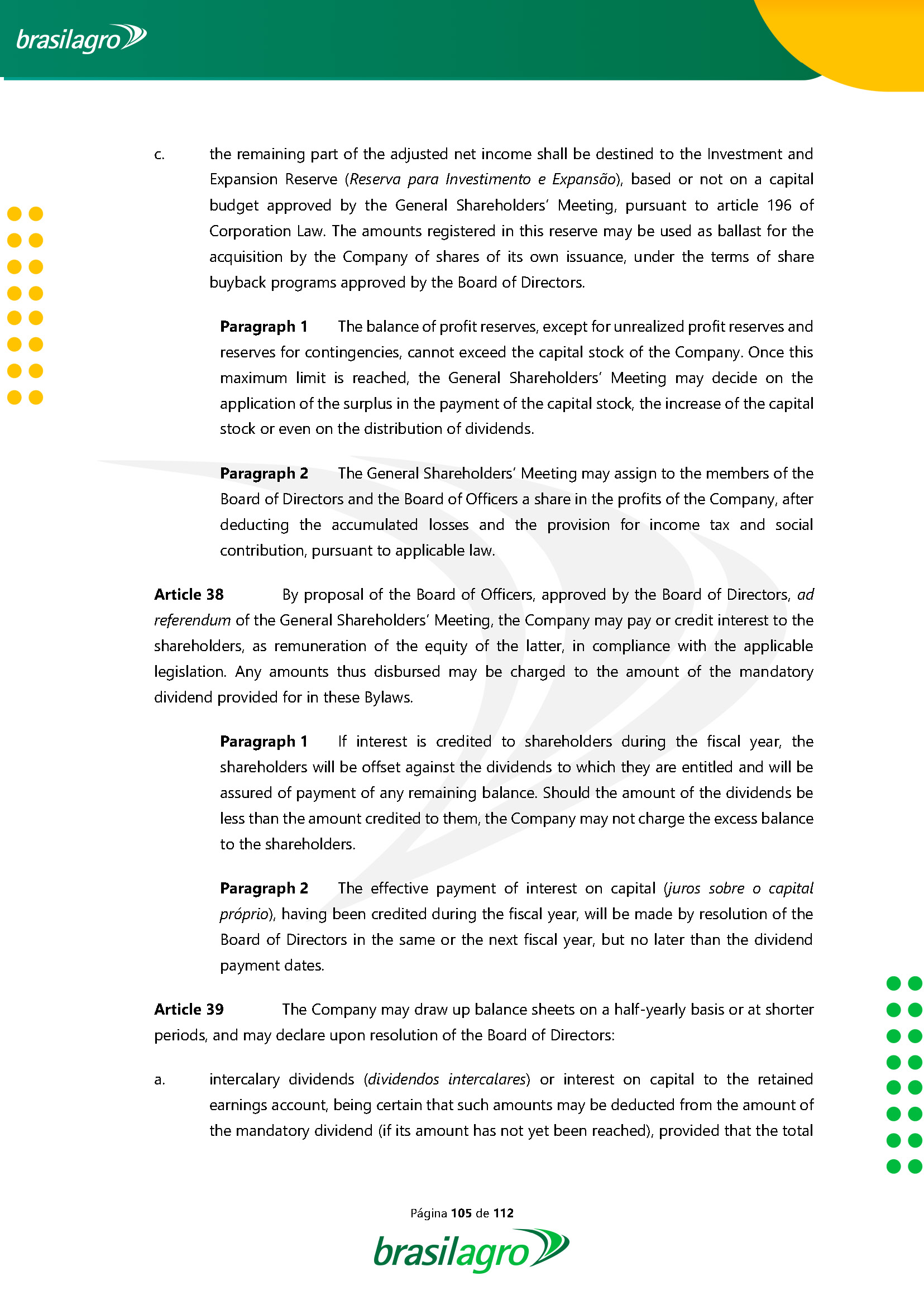 c. Página 105 de 112 the remaining part of the adjusted net income shall be destined to the Investment and Expansion Reserve ( Reserva para Investimento e Expansão ), based or not on a capital budget approved by the General Shareholders’ Meeting, pursuant to article 196 of Corporation Law . The amounts registered in this reserve may be used as ballast for the acquisition by the Company of shares of its own issuance, under the terms of share buyback programs approved by the Board of Directors . Paragraph 1 The balance of profit reserves, except for unrealized profit reserves and reserves for contingencies, cannot exceed the capital stock of the Company . Once this maximum limit is reached, the General Shareholders’ Meeting may decide on the application of the surplus in the payment of the capital stock, the increase of the capital stock or even on the distribution of dividends . Paragraph 2 The General Shareholders’ Meeting may assign to the members of the Board of Directors and the Board of Officers a share in the profits of the Company, after deducting the accumulated losses and the provision for income tax and social contribution, pursuant to applicable law . Article 38 By proposal of the Board of Officers, approved by the Board of Directors, ad referendum of the General Shareholders’ Meeting, the Company may pay or credit interest to the shareholders, as remuneration of the equity of the latter, in compliance with the applicable legislation . Any amounts thus disbursed may be charged to the amount of the mandatory dividend provided for in these Bylaws . Paragraph 1 If interest is credited to shareholders during the fiscal year, the shareholders will be offset against the dividends to which they are entitled and will be assured of payment of any remaining balance . Should the amount of the dividends be less than the amount credited to them, the Company may not charge the excess balance to the shareholders . Paragraph 2 The effective payment of interest on capital ( juros sobre o capital próprio ), having been credited during the fiscal year, will be made by resolution of the Board of Directors in the same or the next fiscal year, but no later than the dividend payment dates . Article 39 The Company may draw up balance sheets on a half - yearly basis or at shorter periods, and may declare upon resolution of the Board of Directors : a. intercalary dividends ( dividendos intercalares ) or interest on capital to the retained earnings account, being certain that such amounts may be deducted from the amount of the mandatory dividend (if its amount has not yet been reached), provided that the total
