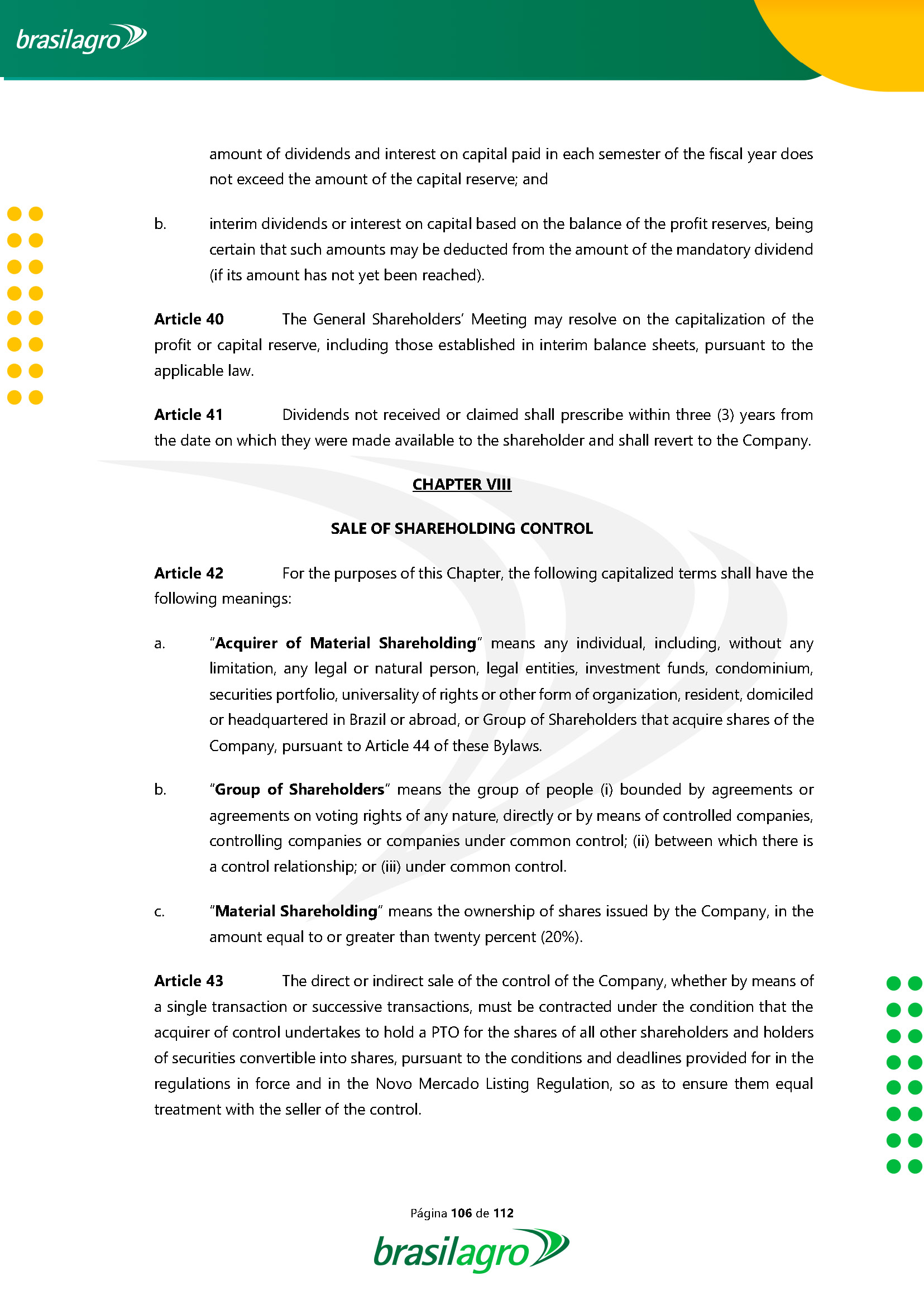 amount of dividends and interest on capital paid in each semester of the fiscal year does not exceed the amount of the capital reserve; and Página 106 de 112 b. interim dividends or interest on capital based on the balance of the profit reserves, being certain that such amounts may be deducted from the amount of the mandatory dividend (if its amount has not yet been reached) . Article 40 The General Shareholders’ Meeting may resolve on the capitalization of the profit or capital reserve, including those established in interim balance sheets, pursuant to the applicable law . Article 41 Dividends not received or claimed shall prescribe within three ( 3 ) years from the date on which they were made available to the shareholder and shall revert to the Company . CHAPTER VIII SALE OF SHAREHOLDING CONTROL Article 42 For the purposes of this Chapter, the following capitalized terms shall have the following meanings : a. “ Acquirer of Material Shareholding ” means any individual, including, without any limitation, any legal or natural person, legal entities, investment funds, condominium, securities portfolio, universality of rights or other form of organization, resident, domiciled or headquartered in Brazil or abroad, or Group of Shareholders that acquire shares of the Company, pursuant to Article 44 of these Bylaws . b. “ Group of Shareholders ” means the group of people (i) bounded by agreements or agreements on voting rights of any nature, directly or by means of controlled companies, controlling companies or companies under common control ; (ii) between which there is a control relationship ; or (iii) under common control . c. “ Material Shareholding ” means the ownership of shares issued by the Company, in the amount equal to or greater than twenty percent (20%). Article 43 The direct or indirect sale of the control of the Company, whether by means of a single transaction or successive transactions, must be contracted under the condition that the acquirer of control undertakes to hold a PTO for the shares of all other shareholders and holders of securities convertible into shares, pursuant to the conditions and deadlines provided for in the regulations in force and in the Novo Mercado Listing Regulation, so as to ensure them equal treatment with the seller of the control .