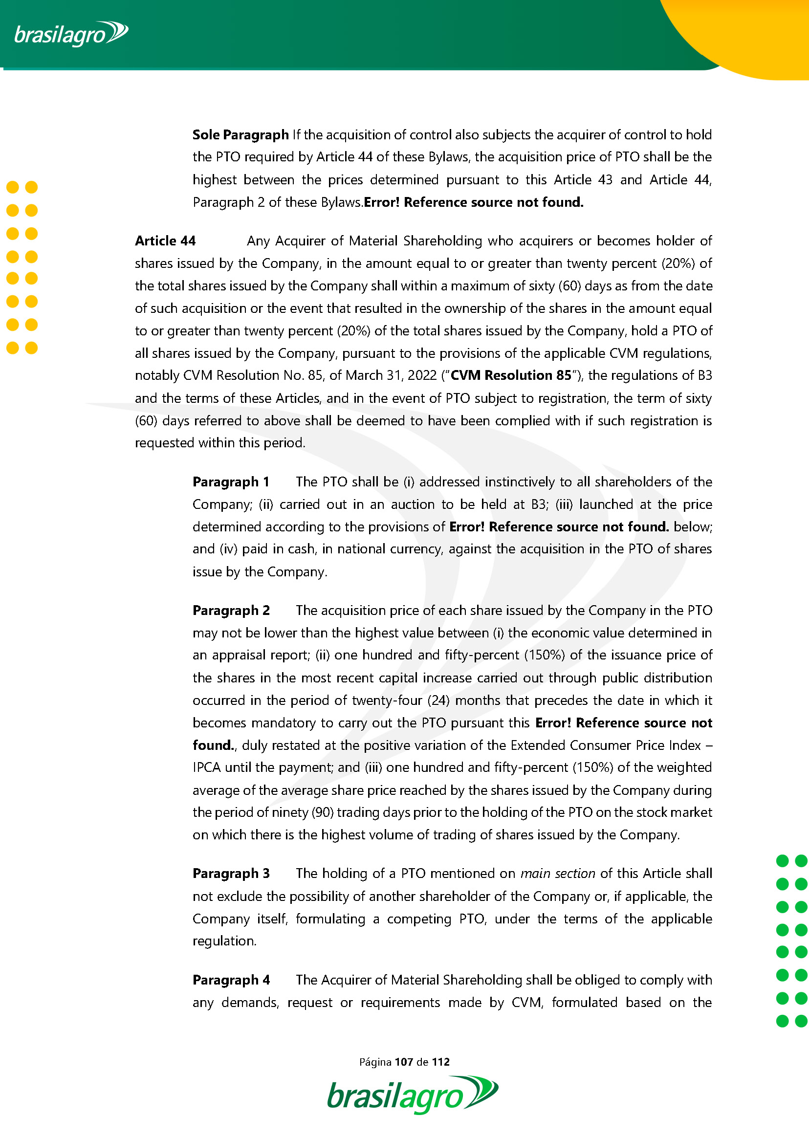 Sole Paragraph If the acquisition of control also subjects the acquirer of control to hold the PTO required by Article 44 of these Bylaws, the acquisition price of PTO shall be the highest between the prices determined pursuant to this Article 43 and Article 44 , Paragraph 2 of these Bylaws . Error! Reference source not found . Article 44 Any Acquirer of Material Shareholding who acquirers or becomes holder of shares issued by the Company, in the amount equal to or greater than twenty percent ( 20 % ) of the total shares issued by the Company shall within a maximum of sixty ( 60 ) days as from the date of such acquisition or the event that resulted in the ownership of the shares in the amount equal to or greater than twenty percent ( 20 % ) of the total shares issued by the Company, hold a PTO of all shares issued by the Company, pursuant to the provisions of the applicable CVM regulations, notably CVM Resolution No . 85 , of March 31 , 2022 (“ CVM Resolution 85 ”), the regulations of B 3 and the terms of these Articles, and in the event of PTO subject to registration, the term of sixty ( 60 ) days referred to above shall be deemed to have been complied with if such registration is requested within this period . Paragraph 1 The PTO shall be (i) addressed instinctively to all shareholders of the Company ; (ii) carried out in an auction to be held at B 3 ; (iii) launched at the price determined according to the provisions of Error! Reference source not found . below ; and (iv) paid in cash, in national currency, against the acquisition in the PTO of shares issue by the Company . Paragraph 2 The acquisition price of each share issued by the Company in the PTO may not be lower than the highest value between (i) the economic value determined in an appraisal report ; (ii) one hundred and fifty - percent ( 150 % ) of the issuance price of the shares in the most recent capital increase carried out through public distribution occurred in the period of twenty - four ( 24 ) months that precedes the date in which it becomes mandatory to carry out the PTO pursuant this Error! Reference source not found . , duly restated at the positive variation of the Extended Consumer Price Index – IPCA until the payment ; and (iii) one hundred and fifty - percent ( 150 % ) of the weighted average of the average share price reached by the shares issued by the Company during the period of ninety ( 90 ) trading days prior to the holding of the PTO on the stock market on which there is the highest volume of trading of shares issued by the Company . Paragraph 3 The holding of a PTO mentioned on main section of this Article shall not exclude the possibility of another shareholder of the Company or, if applicable, the Company itself, formulating a competing PTO, under the terms of the applicable regulation . Paragraph 4 The Acquirer of Material Shareholding shall be obliged to comply with any demands, request or requirements made by CVM, formulated based on the Página 107 de 112