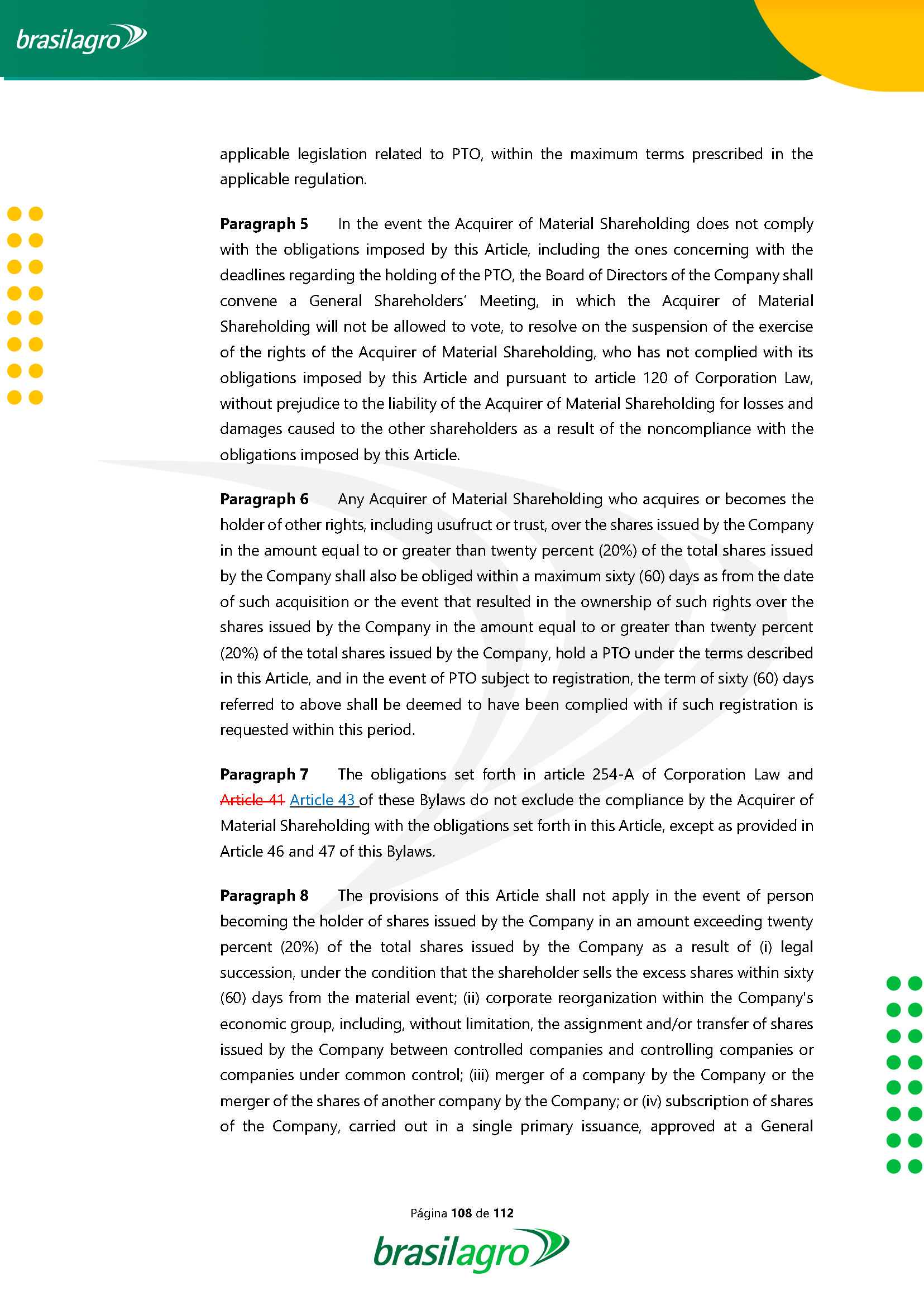 applicable legislation related to PTO, within the maximum terms prescribed in the applicable regulation . Paragraph 5 In the event the Acquirer of Material Shareholding does not comply with the obligations imposed by this Article, including the ones concerning with the deadlines regarding the holding of the PTO, the Board of Directors of the Company shall convene a General Shareholders’ Meeting, in which the Acquirer of Material Shareholding will not be allowed to vote, to resolve on the suspension of the exercise of the rights of the Acquirer of Material Shareholding, who has not complied with its obligations imposed by this Article and pursuant to article 120 of Corporation Law, without prejudice to the liability of the Acquirer of Material Shareholding for losses and damages caused to the other shareholders as a result of the noncompliance with the obligations imposed by this Article . Paragraph 6 Any Acquirer of Material Shareholding who acquires or becomes the holder of other rights, including usufruct or trust, over the shares issued by the Company in the amount equal to or greater than twenty percent ( 20 % ) of the total shares issued by the Company shall also be obliged within a maximum sixty ( 60 ) days as from the date of such acquisition or the event that resulted in the ownership of such rights over the shares issued by the Company in the amount equal to or greater than twenty percent ( 20 % ) of the total shares issued by the Company, hold a PTO under the terms described in this Article, and in the event of PTO subject to registration, the term of sixty ( 60 ) days referred to above shall be deemed to have been complied with if such registration is requested within this period . Paragraph 7 The obligations set forth in article 254 - A of Corporation Law and Article 41 Article 43 of these Bylaws do not exclude the compliance by the Acquirer of Material Shareholding with the obligations set forth in this Article, except as provided in Article 46 and 47 of this Bylaws . Paragraph 8 The provisions of this Article shall not apply in the event of person becoming the holder of shares issued by the Company in an amount exceeding twenty percent ( 20 % ) of the total shares issued by the Company as a result of (i) legal succession, under the condition that the shareholder sells the excess shares within sixty ( 60 ) days from the material event ; (ii) corporate reorganization within the Company's economic group, including, without limitation, the assignment and/or transfer of shares issued by the Company between controlled companies and controlling companies or companies under common control ; (iii) merger of a company by the Company or the merger of the shares of another company by the Company ; or (iv) subscription of shares of the Company, carried out in a single primary issuance, approved at a General Página 108 de 112