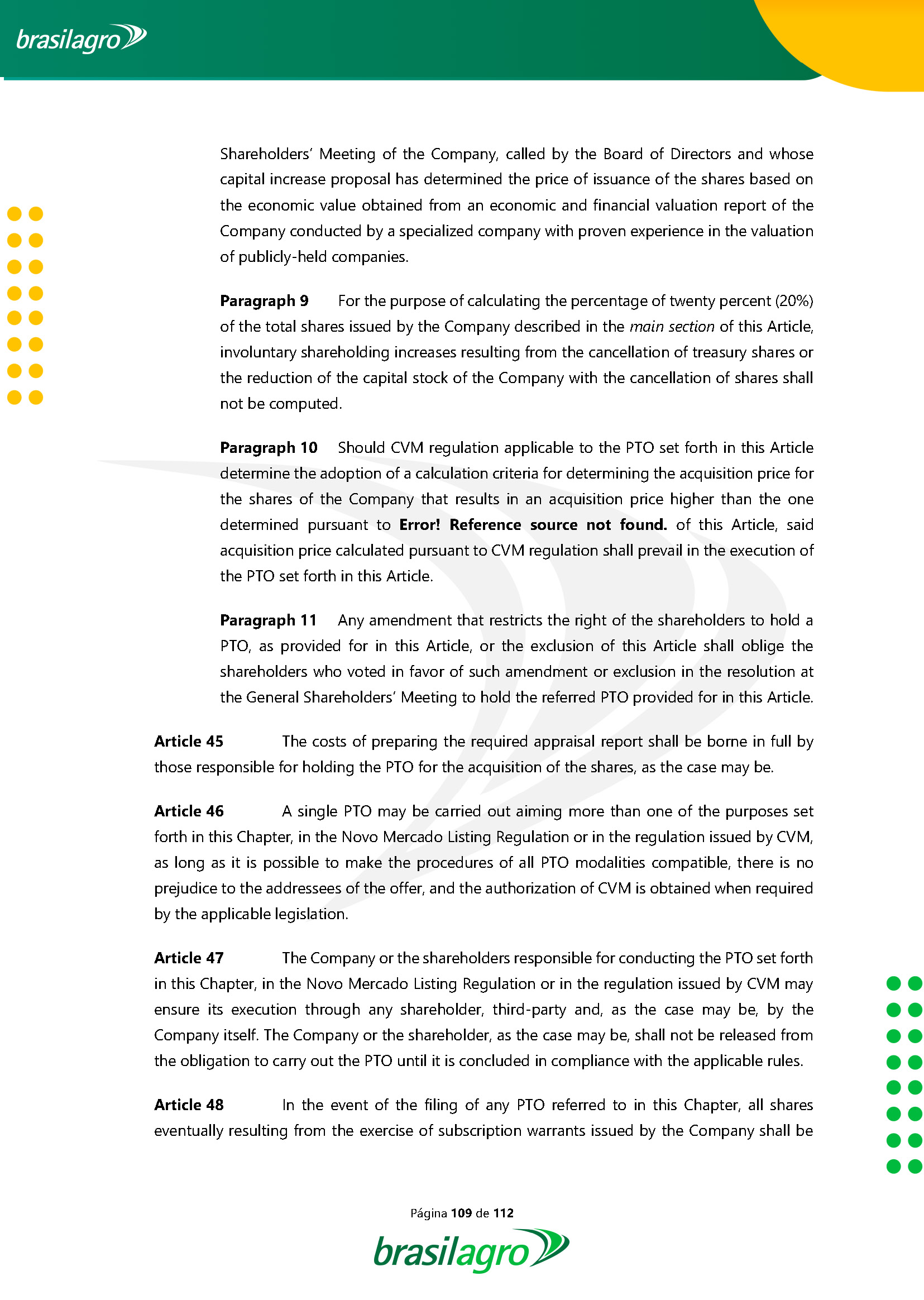 Shareholders’ Meeting of the Company, called by the Board of Directors and whose capital increase proposal has determined the price of issuance of the shares based on the economic value obtained from an economic and financial valuation report of the Company conducted by a specialized company with proven experience in the valuation of publicly - held companies . Paragraph 9 For the purpose of calculating the percentage of twenty percent ( 20 % ) of the total shares issued by the Company described in the main section of this Article, involuntary shareholding increases resulting from the cancellation of treasury shares or the reduction of the capital stock of the Company with the cancellation of shares shall not be computed . Paragraph 10 Should CVM regulation applicable to the PTO set forth in this Article determine the adoption of a calculation criteria for determining the acquisition price for the shares of the Company that results in an acquisition price higher than the one determined pursuant to Error! Reference source not found . of this Article, said acquisition price calculated pursuant to CVM regulation shall prevail in the execution of the PTO set forth in this Article . Paragraph 11 Any amendment that restricts the right of the shareholders to hold a PTO, as provided for in this Article, or the exclusion of this Article shall oblige the shareholders who voted in favor of such amendment or exclusion in the resolution at the General Shareholders’ Meeting to hold the referred PTO provided for in this Article . Article 45 The costs of preparing the required appraisal report shall be borne in full by those responsible for holding the PTO for the acquisition of the shares, as the case may be . Article 46 A single PTO may be carried out aiming more than one of the purposes set forth in this Chapter, in the Novo Mercado Listing Regulation or in the regulation issued by CVM, as long as it is possible to make the procedures of all PTO modalities compatible, there is no prejudice to the addressees of the offer, and the authorization of CVM is obtained when required by the applicable legislation . Article 47 The Company or the shareholders responsible for conducting the PTO set forth in this Chapter, in the Novo Mercado Listing Regulation or in the regulation issued by CVM may ensure its execution through any shareholder, third - party and, as the case may be, by the Company itself . The Company or the shareholder, as the case may be, shall not be released from the obligation to carry out the PTO until it is concluded in compliance with the applicable rules . Article 48 In the event of the filing of any PTO referred to in this Chapter, all shares eventually resulting from the exercise of subscription warrants issued by the Company shall be Página 109 de 112