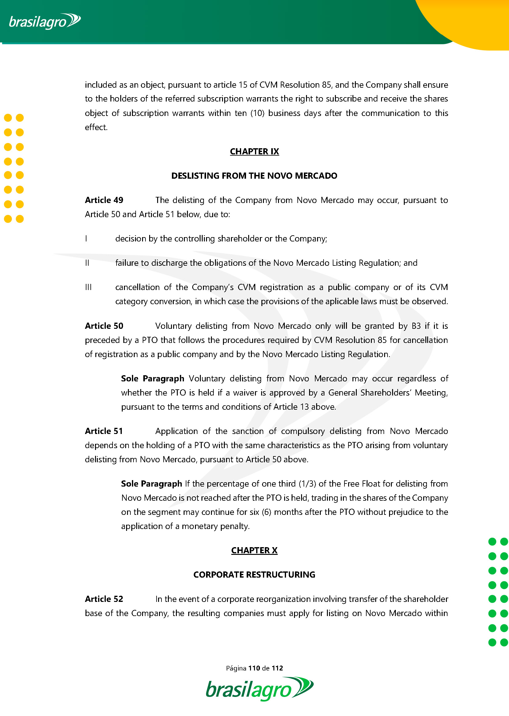 included as an object, pursuant to article 15 of CVM Resolution 85 , and the Company shall ensure to the holders of the referred subscription warrants the right to subscribe and receive the shares object of subscription warrants within ten ( 10 ) business days after the communication to this effect . CHAPTER IX DESLISTING FROM THE NOVO MERCADO Article 49 The delisting of the Company from Novo Mercado may occur, pursuant to Article 50 and Article 51 below, due to : I. decision by the controlling shareholder or the Company ; II. failure to discharge the obligations of the Novo Mercado Listing Regulation; and Página 110 de 112 III cancellation of the Company’s CVM registration as a public company or of its CVM category conversion, in which case the provisions of the aplicable laws must be observed. Article 50 Voluntary delisting from Novo Mercado only will be granted by B 3 if it is preceded by a PTO that follows the procedures required by CVM Resolution 85 for cancellation of registration as a public company and by the Novo Mercado Listing Regulation . Sole Paragraph Voluntary delisting from Novo Mercado may occur regardless of whether the PTO is held if a waiver is approved by a General Shareholders’ Meeting, pursuant to the terms and conditions of Article 13 above . Article 51 Application of the sanction of compulsory delisting from Novo Mercado depends on the holding of a PTO with the same characteristics as the PTO arising from voluntary delisting from Novo Mercado, pursuant to Article 50 above . Sole Paragraph If the percentage of one third ( 1 / 3 ) of the Free Float for delisting from Novo Mercado is not reached after the PTO is held, trading in the shares of the Company on the segment may continue for six ( 6 ) months after the PTO without prejudice to the application of a monetary penalty . CHAPTER X CORPORATE RESTRUCTURING Article 52 In the event of a corporate reorganization involving transfer of the shareholder base of the Company, the resulting companies must apply for listing on Novo Mercado within