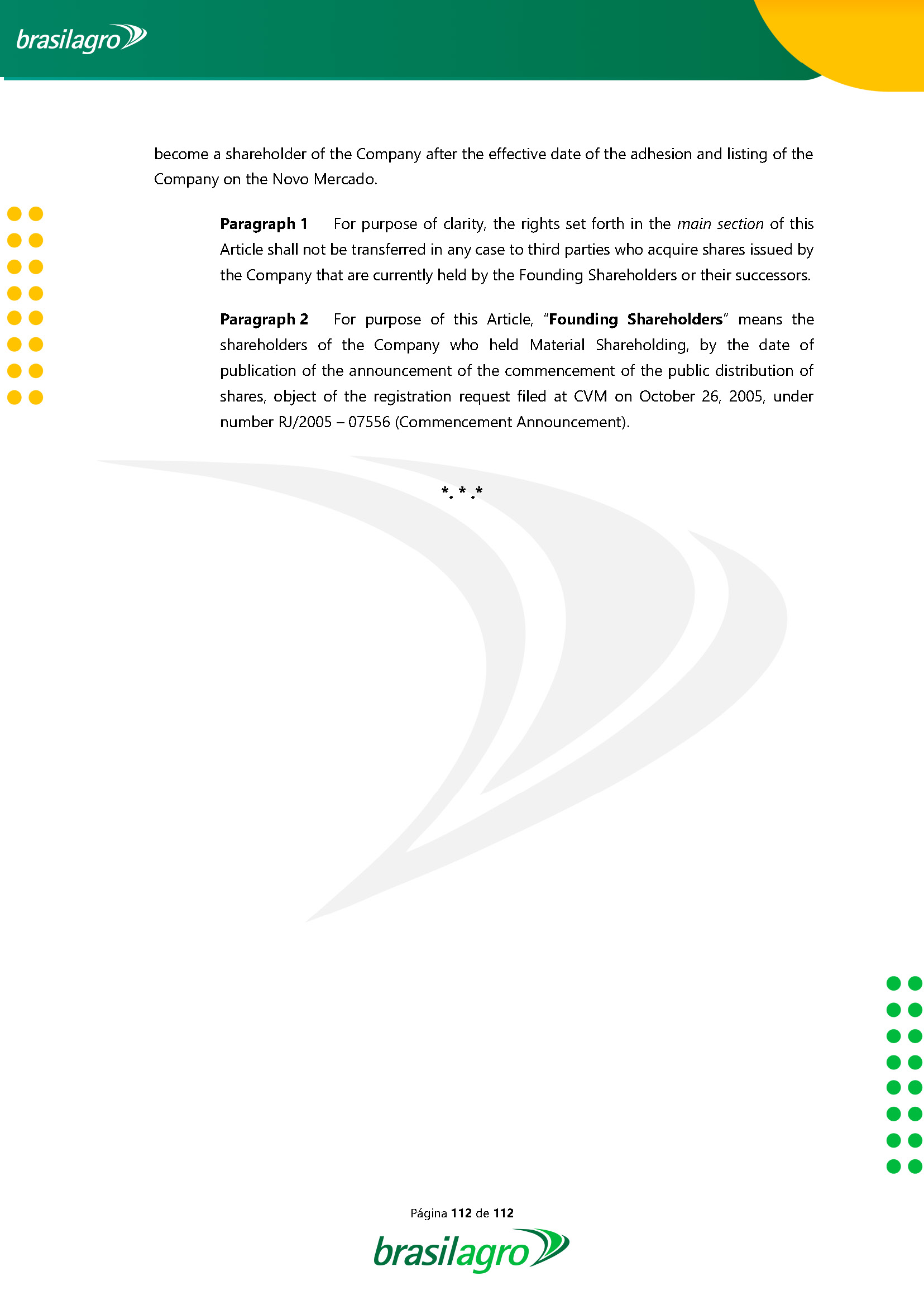 become a shareholder of the Company after the effective date of the adhesion and listing of the Company on the Novo Mercado. Paragraph 1 For purpose of clarity, the rights set forth in the main section of this Article shall not be transferred in any case to third parties who acquire shares issued by the Company that are currently held by the Founding Shareholders or their successors . Paragraph 2 For purpose of this Article, “ Founding Shareholders ” means the shareholders of the Company who held Material Shareholding, by the date of publication of the announcement of the commencement of the public distribution of shares, object of the registration request filed at CVM on October 26 , 2005 , under number RJ/ 2005 – 07556 (Commencement Announcement) . Página 112 de 112 *. * .*