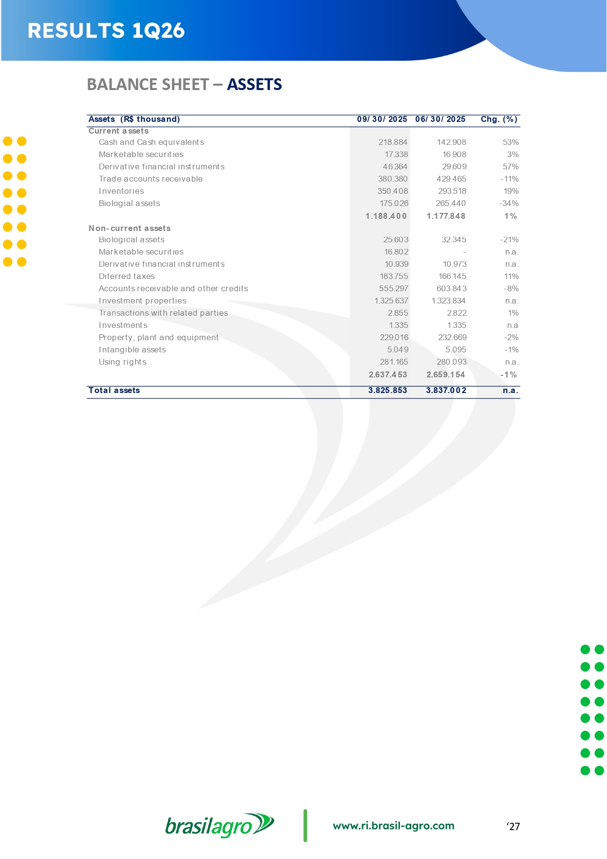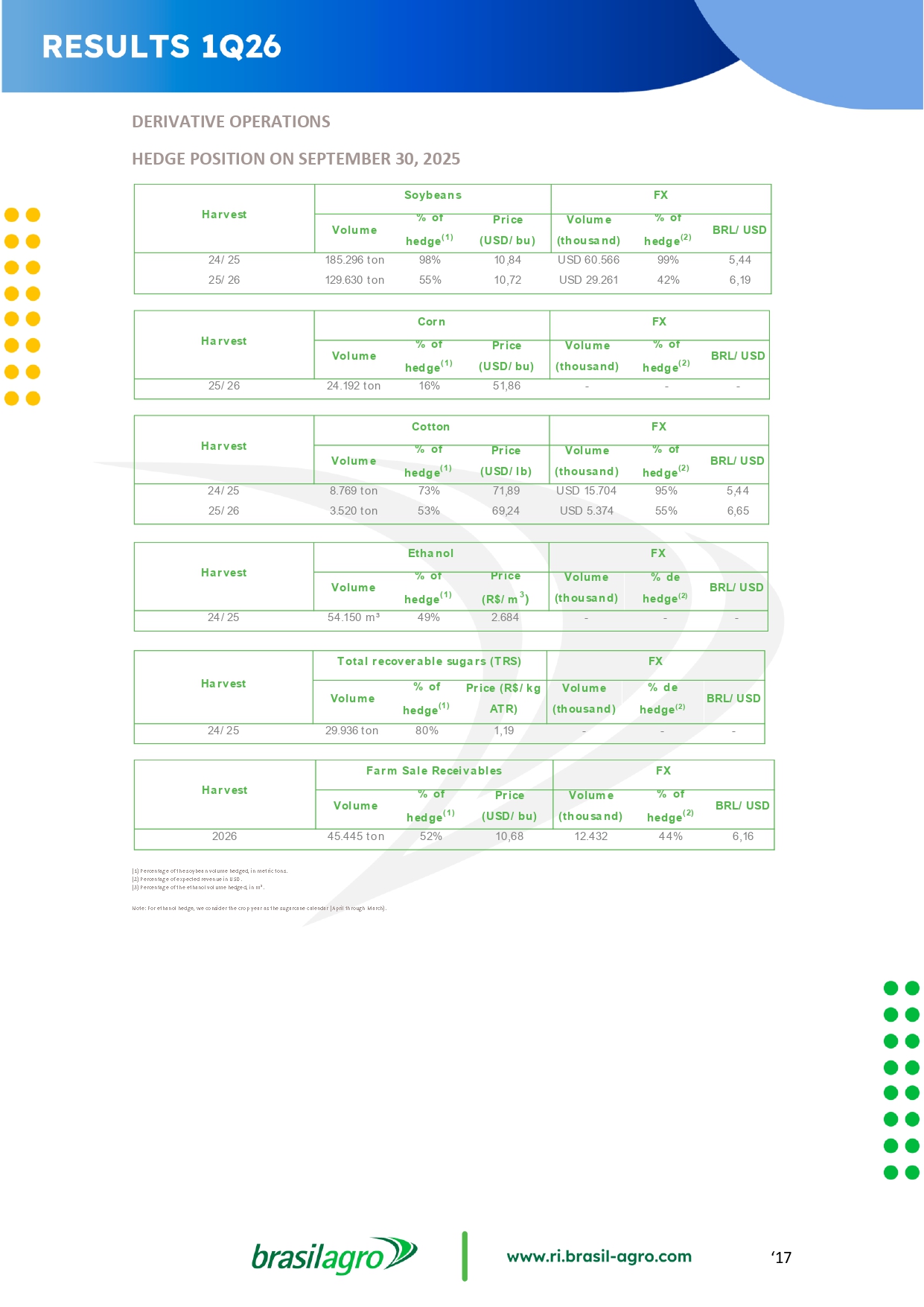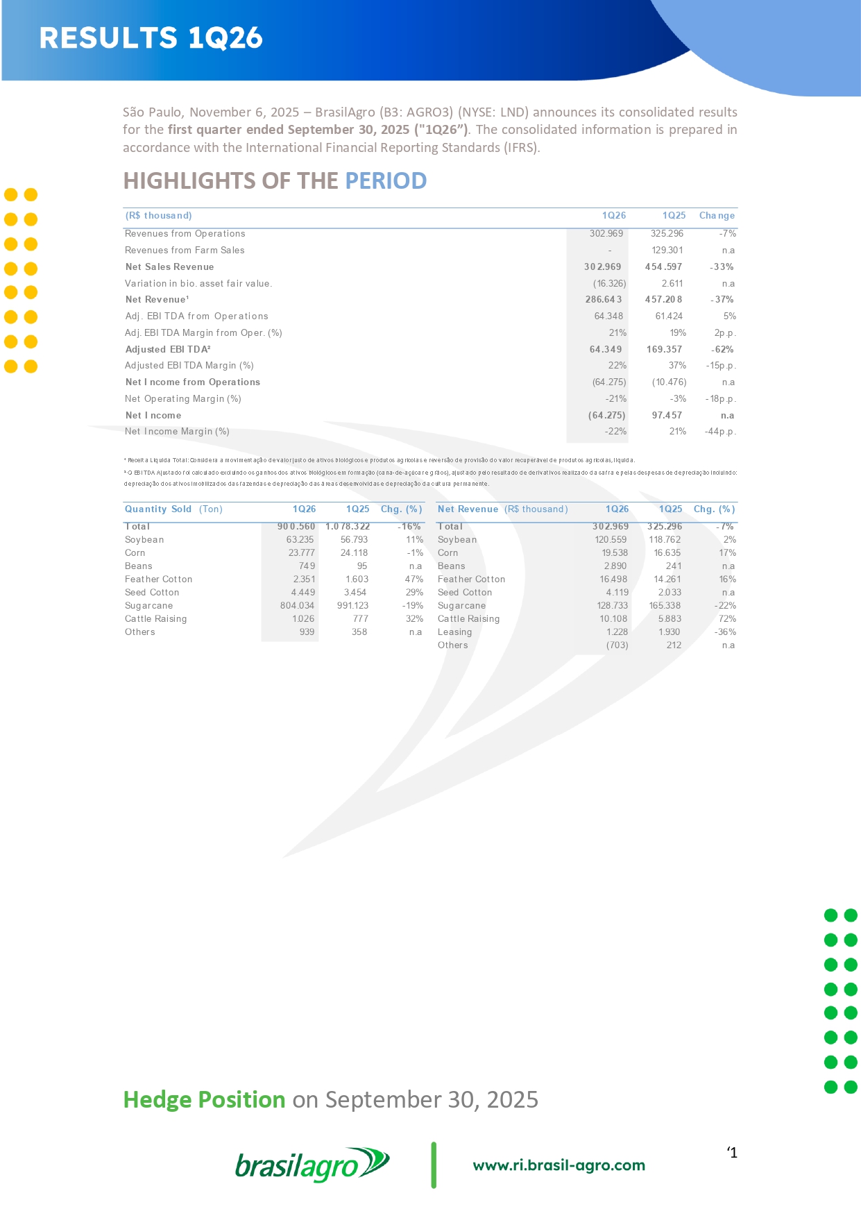 ‘1 São Paulo, November 6 , 2025 – BrasilAgro (B 3 : AGRO 3 ) (NYSE : LND) announces its consolidated results for the first quarter ended September 30 , 2025 (" 1 Q 26 ”) . The consolidated information is prepared in accordance with the International Financial Reporting Standards (IFRS) . Hedge Position on September 30, 2025 HIGHLIGHTS OF THE PERIOD Cha nge 1Q25 1Q26 (R$ thousa nd) - 7% 325.296 302.969 Revenues f rom Operations n.a 129.301 - Revenues f rom Farm Sales - 33 % 4 54 .597 30 2.969 Net Sa les Revenue n.a 2.611 (16.326) Variation in bio. a sset fair value. - 37% 4 57.20 8 286.64 3 Net Revenue¹ 5% 61.424 64.348 Adj . EBI TDA f r om Op er a t i ons 2p.p. 19% 21% Adj. EBI TDA Margin f rom Oper. (%) - 62% 169.357 64 .34 9 Adjusted EBI TDA² - 15p.p. 37% 22% Adjusted EBI TDA Margin (%) n.a (10.476) (64.275) Net I ncome from Operations - 18p.p. - 3% - 21% Net Operating Margin (%) n.a 97.4 57 (64 .275) Net I ncome - 44p.p. 21% - 22% Net I ncome Margin (%) ¹ Receit a Líquida Tot al: Consid era a moviment a çã o de valor just o de at ivos biológicos e produt os agrícola s e reversã o de provisã o do valor recup erável de produt os agrícola s, líquida. ² O EBI TDA Ajust ado f oi ca lcula do excluind o os ganhos dos at ivos biológicos em f orma çã o (ca na - de - a çúca r e grãos), ajust ado pelo result ado de derivat ivos realiza do da sa f ra e pelas desp esa s de deprecia çã o incluind o: deprecia çã o dos at ivos imobiliza dos das f a zend as e deprecia çã o das áreas desenvolvid as e deprecia çã o da cult ura permanent e. Chg. (% ) 1Q25 1Q26 Net Revenue (R$ thousand) Chg. (% ) 1Q25 1Q26 (Ton) Quantity Sold - 7% 325.296 30 2.969 Total - 16% 1.0 78.322 90 0 .560 Total 2% 118.762 120.559 Soybean 11% 56.793 63.235 Soybean 17% 16.635 19.538 Corn - 1% 24.118 23.777 Corn n.a 241 2.890 Beans n.a 95 749 Beans 16% 14.261 16.498 Feather Cotton 47% 1.603 2.351 Feather Cotton n.a 2.033 4.119 Seed Cotton 29% 3.454 4.449 Seed Cotton - 22% 165.338 128.733 Sugarcane - 19% 991.123 804.034 Sugarcane 72% 5.883 10.108 Cattle Raising 32% 777 1.026 Cattle Raising - 36% 1.930 1.228 Leasing n.a 358 939 Others n.a 212 (703) Others