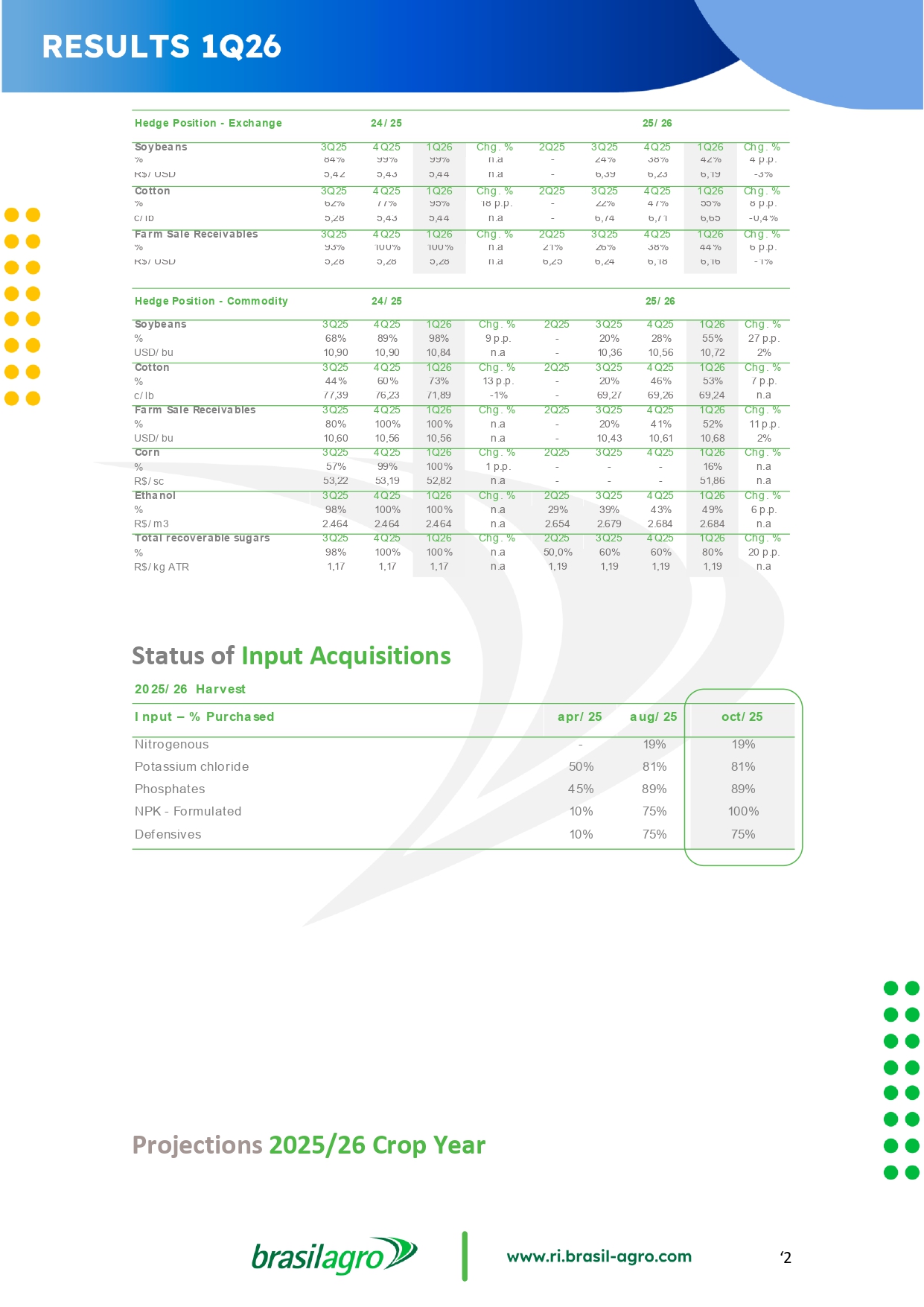 Projections 2025/26 Crop Year 25/ 26 24 / 25 Hedge Position - Excha nge Chg . % 1Q26 4 Q25 3Q25 2Q25 Chg . % 1Q26 4 Q25 3Q25 Soybeans 4 p.p. 42% 99% 38% 24% - n.a 99% 84% % - 3% 6,19 6,23 6,39 - n.a 5,44 5,43 5,42 R$/ USD Chg . % 1Q26 4 Q25 3Q25 2Q25 Chg . % 1Q26 4 Q25 3Q25 Cotton 8 p.p. 55% 95% 47% 22% - 18 p.p. 77% 62% % - 0,4% 6,65 6,71 6,74 - n.a 5,44 5,43 5,28 c/ lb Chg . % 1Q26 4 Q25 3Q25 2Q25 Chg . % 1Q26 4 Q25 3Q25 Farm Sale Receivables 6 p.p. 44% 38% 26% 100% 100% n.a 21% 93% % - 1% 6,16 6,18 6,24 n.a 6,25 5,28 5,28 5,28 R$/ USD 25/ 26 24 / 25 Hedge Position - Commodity Chg . % 1Q26 4 Q25 3Q25 2Q25 Chg . % 1Q26 4 Q25 3Q25 Soybeans 27 p.p. 55% 28% 20% - 9 p.p. 98% 89% 68% % 2% 10,72 10,56 10,36 - n.a 10,84 10,90 10,90 USD/ bu Chg . % 1Q26 4 Q25 3Q25 2Q25 Chg . % 1Q26 4 Q25 3Q25 Cotton 7 p.p. 53% 46% 20% - 13 p.p. 73% 60% 44% % n.a 69,24 69,26 69,27 - - 1% 71,89 76,23 77,39 c/ lb Chg . % 1Q26 4 Q25 3Q25 2Q25 Chg . % 1Q26 4 Q25 3Q25 Farm Sale Receivables 11 p.p. 52% 41% 20% - n.a 100% 100% 80% % 2% 10,68 10,61 10,43 - n.a 10,56 10,56 10,60 USD/ bu Chg . % 1Q26 4 Q25 3Q25 2Q25 Chg . % 1Q26 4 Q25 3Q25 Corn n.a 16% - - - 1 p.p. 100% 99% 57% % n.a 51,86 - - - n.a 52,82 53,19 53,22 R$/ sc Chg . % 1Q26 4 Q25 3Q25 2Q25 Chg . % 1Q26 4 Q25 3Q25 Etha nol 6 p.p. 49% 43% 39% 29% n.a 100% 100% 98% % n.a 2.684 2.684 2.679 2.654 n.a 2.464 2.464 2.464 R$/ m 3 Chg . % 1Q26 4 Q25 3Q25 2Q25 Chg . % 1Q26 4 Q25 3Q25 Total recoverable sugars 20 p.p. 80% 60% 60% 50,0% n.a 100% 100% 98% % n.a 1,19 1,19 1,19 1,19 n.a 1,17 1,17 1,17 R$/ kg ATR Status of Input Acquisitions 20 25/ 26 Harvest oct/ 25 aug/ 25 apr/ 25 I nput – % Purchased 19% 19% - Nitrogenous 81% 81% 50% Potassium chloride 89% 89% 45% Phosphates 100% 75% 10% NPK - Formulated 75% 75% 10% Def ensives ‘ 2