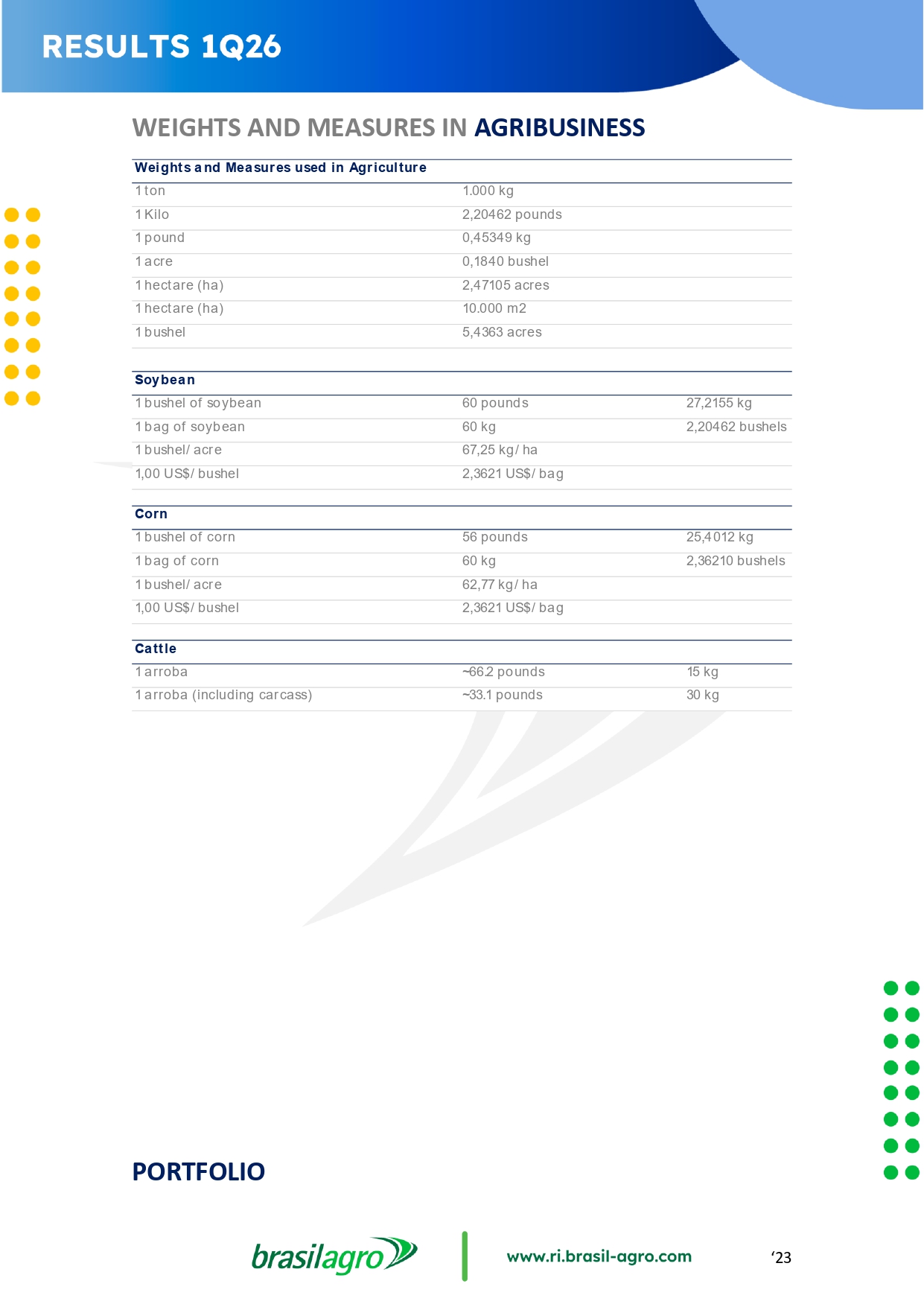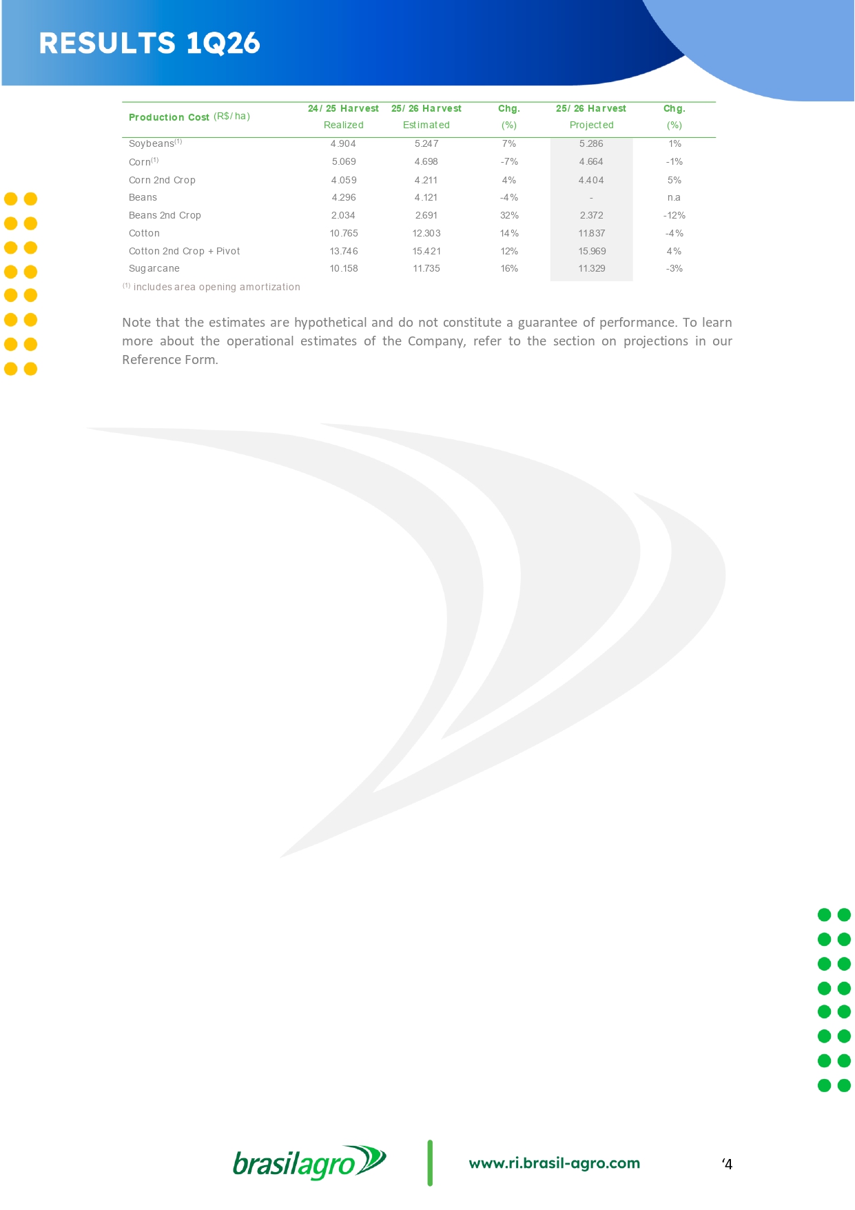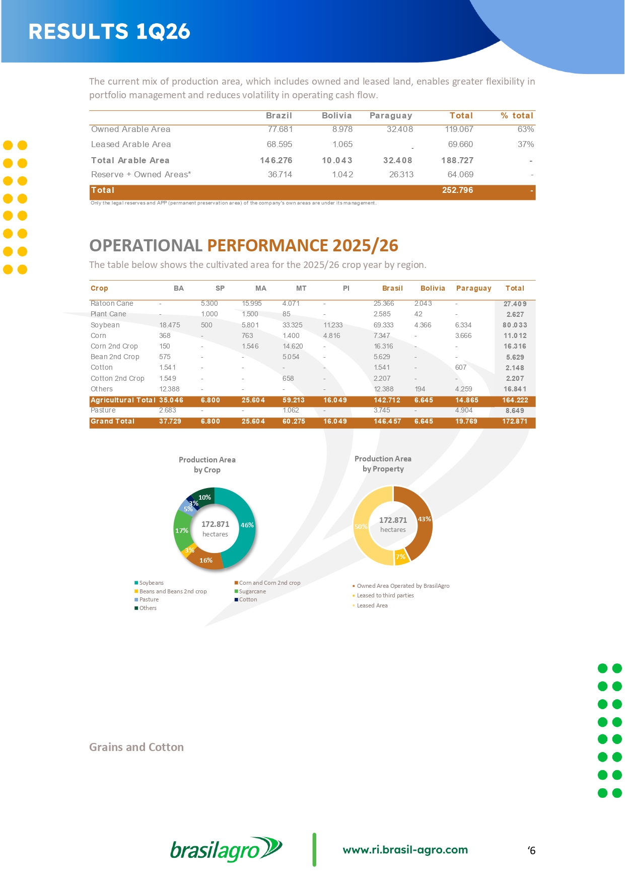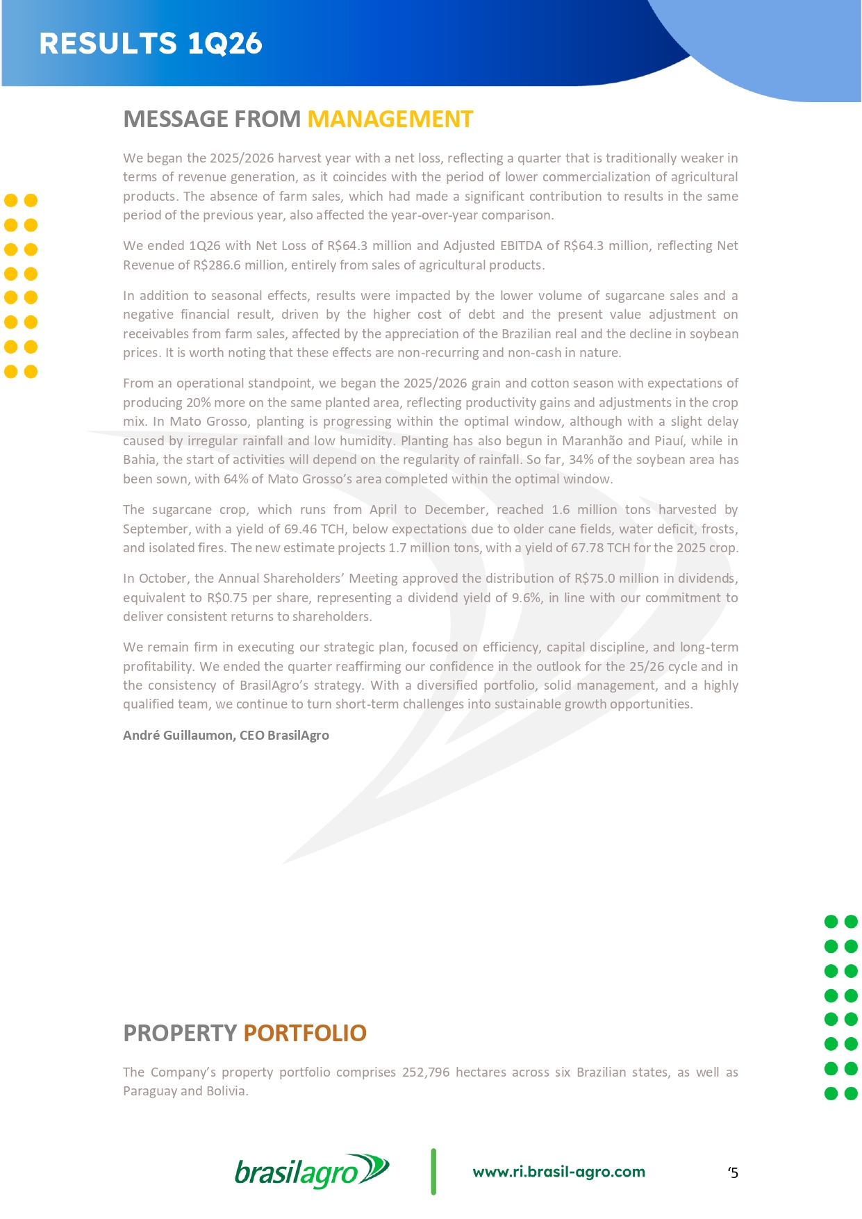 MESSAGE FROM MANAGEMENT We began the 2025 / 2026 harvest year with a net loss, reflecting a quarter that is traditionally weaker in terms of revenue generation, as it coincides with the period of lower commercialization of agricultural products . The absence of farm sales, which had made a significant contribution to results in the same period of the previous year, also affected the year - over - year comparison . We ended 1 Q 26 with Net Loss of R $ 64 . 3 million and Adjusted EBITDA of R $ 64 . 3 million, reflecting Net Revenue of R $ 286 . 6 million, entirely from sales of agricultural products . In addition to seasonal effects, results were impacted by the lower volume of sugarcane sales and a negative financial result, driven by the higher cost of debt and the present value adjustment on receivables from farm sales, affected by the appreciation of the Brazilian real and the decline in soybean prices . It is worth noting that these effects are non - recurring and non - cash in nature . From an operational standpoint, we began the 2025 / 2026 grain and cotton season with expectations of producing 20 % more on the same planted area, reflecting productivity gains and adjustments in the crop mix . In Mato Grosso, planting is progressing within the optimal window, although with a slight delay caused by irregular rainfall and low humidity . Planting has also begun in Maranhão and Piauí, while in Bahia, the start of activities will depend on the regularity of rainfall . So far, 34 % of the soybean area has been sown, with 64 % of Mato Grosso’s area completed within the optimal window . The sugarcane crop, which runs from April to December, reached 1 . 6 million tons harvested by September, with a yield of 69 . 46 TCH, below expectations due to older cane fields, water deficit, frosts, and isolated fires . The new estimate projects 1 . 7 million tons, with a yield of 67 . 78 TCH for the 2025 crop . In October, the Annual Shareholders’ Meeting approved the distribution of R $ 75 . 0 million in dividends, equivalent to R $ 0 . 75 per share, representing a dividend yield of 9 . 6 % , in line with our commitment to deliver consistent returns to shareholders . We remain firm in executing our strategic plan, focused on efficiency, capital discipline, and long - term profitability . We ended the quarter reaffirming our confidence in the outlook for the 25 / 26 cycle and in the consistency of BrasilAgro’s strategy . With a diversified portfolio, solid management, and a highly qualified team, we continue to turn short - term challenges into sustainable growth opportunities . André Guillaumon, CEO BrasilAgro ‘ 5 PROPERTY PORTFOLIO The Company’s property portfolio comprises 252,796 hectares across six Brazilian states, as well as Paraguay and Bolivia.