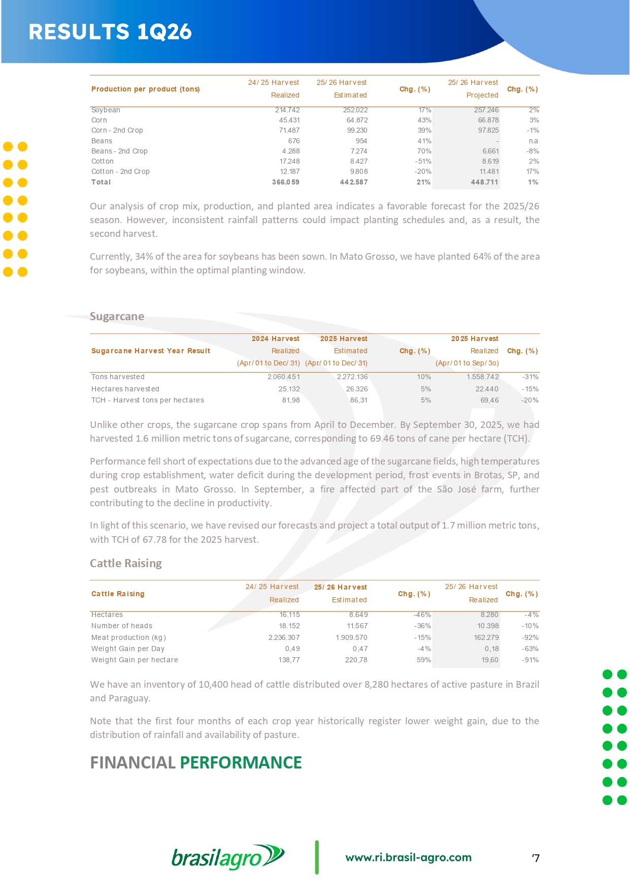 Our analysis of crop mix, production, and planted area indicates a favorable forecast for the 2025 / 26 season . However, inconsistent rainfall patterns could impact planting schedules and, as a result, the second harvest . Currently, 34 % of the area for soybeans has been sown . In Mato Grosso, we have planted 64 % of the area for soybeans, within the optimal planting window . Unlike other crops, the sugarcane crop spans from April to December . By September 30 , 2025 , we had harvested 1 . 6 million metric tons of sugarcane, corresponding to 69 . 46 tons of cane per hectare (TCH) . Performance fell short of expectations due to the advanced age of the sugarcane fields, high temperatures during crop establishment, water deficit during the development period, frost events in Brotas, SP, and pest outbreaks in Mato Grosso . In September, a fire affected part of the São José farm, further contributing to the decline in productivity . In light of this scenario, we have revised our forecasts and project a total output of 1 . 7 million metric tons, with TCH of 67 . 78 for the 2025 harvest . Cattle Raising We have an inventory of 10,400 head of cattle distributed over 8,280 hectares of active pasture in Brazil and Paraguay. Note that the first four months of each crop year historically register lower weight gain, due to the distribution of rainfall and availability of pasture. FINANCIAL PERFORMANCE 25/ 26 Har v est 25/ 26 Har v est 24 / 25 Har v est Chg. (% ) Projected Chg. (% ) Estimated Realized Production per product (tons) 2% 257.246 17% 252.022 214.742 Soybean 3% 66.878 43% 64.872 45.431 Corn - 1% 97.825 39% 99.230 71.487 Corn - 2nd Crop n.a - 41% 954 676 Beans - 8% 6.661 70% 7.274 4.288 Beans - 2nd Crop 2% 8.619 - 51% 8.427 17.248 Cotton 17% 11.481 - 20% 9.808 12.187 Cotton - 2nd Crop 1% 4 4 8.711 21% 4 4 2.587 366.0 59 Total Sugarcane 20 25 Harvest 20 25 Harvest 20 24 Harvest Chg. (% ) Realized Chg. (% ) Estimated Realized Suga rca ne Ha rvest Yea r Result (Apr/ 01 to Sep/ 3o) (Apr/ 01 to Dec/ 31) (Apr/ 01 to Dec/ 31) - 31% 1.558.742 10% 2.272.136 2.060.451 Tons harvested - 15% 22.440 5% 26.326 25.132 Hectares harvested - 20% 69,46 5% 86,31 81,98 TCH - Harvest tons per hectares Ca ttle Ra ising 24 / 25 Ha r v est 25/ 26 Ha rvest Chg. (% ) 25/ 26 Ha r v est Chg. (% ) Realized Estimated Realized - 4% 8.280 - 46% 8.649 16.115 Hectares - 10% 10.398 - 36% 11.567 18.152 Number of heads - 92% 162.279 - 15% 1.909.570 2.236.307 Meat production (kg) - 63% 0,18 - 4% 0,47 0,49 Weight Gain per Day - 91% 19,60 59% 220,78 138,77 Weight Gain per hectare ‘ 7