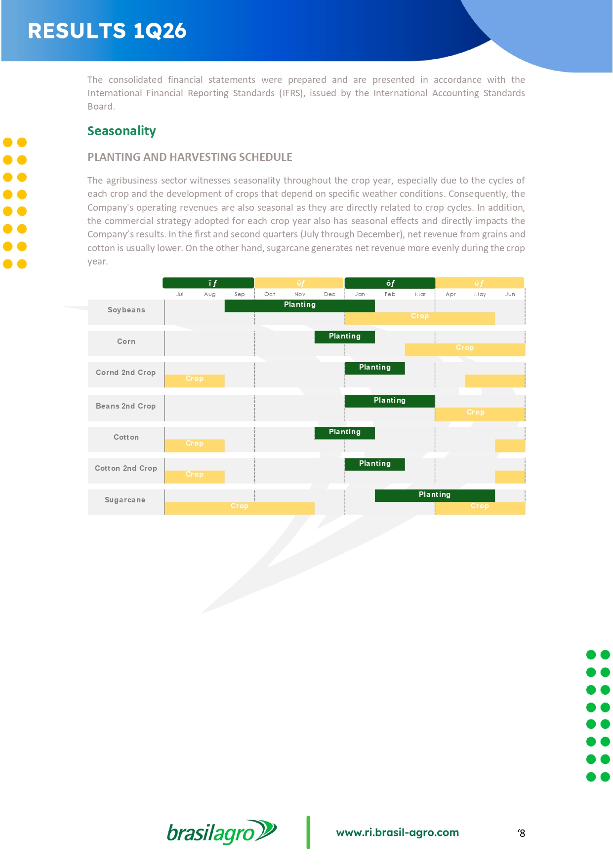 The consolidated financial statements were prepared and are presented in accordance with the International Financial Reporting Standards (IFRS), issued by the International Accounting Standards Board . Seasonality PLANTING AND HARVESTING SCHEDULE The agribusiness sector witnesses seasonality throughout the crop year, especially due to the cycles of each crop and the development of crops that depend on specific weather conditions . Consequently, the Company's operating revenues are also seasonal as they are directly related to crop cycles . In addition, the commercial strategy adopted for each crop year also has seasonal effects and directly impacts the Company’s results . In the first and second quarters (July through December), net revenue from grains and cotton is usually lower . On the other hand, sugarcane generates net revenue more evenly during the crop year . Jul Sep Oct Mar Apr Jun Planting Beans 2nd Crop Crop Planting Cotton Crop Planting Cotton 2nd Crop Crop Planting Sugarcane Crop Crop Cornd 2nd Crop Planting Crop Soybeans Planting Crop Corn Planting Crop ïf Aug ‘ 8 óf Feb üf Nov Dec Jan úf May