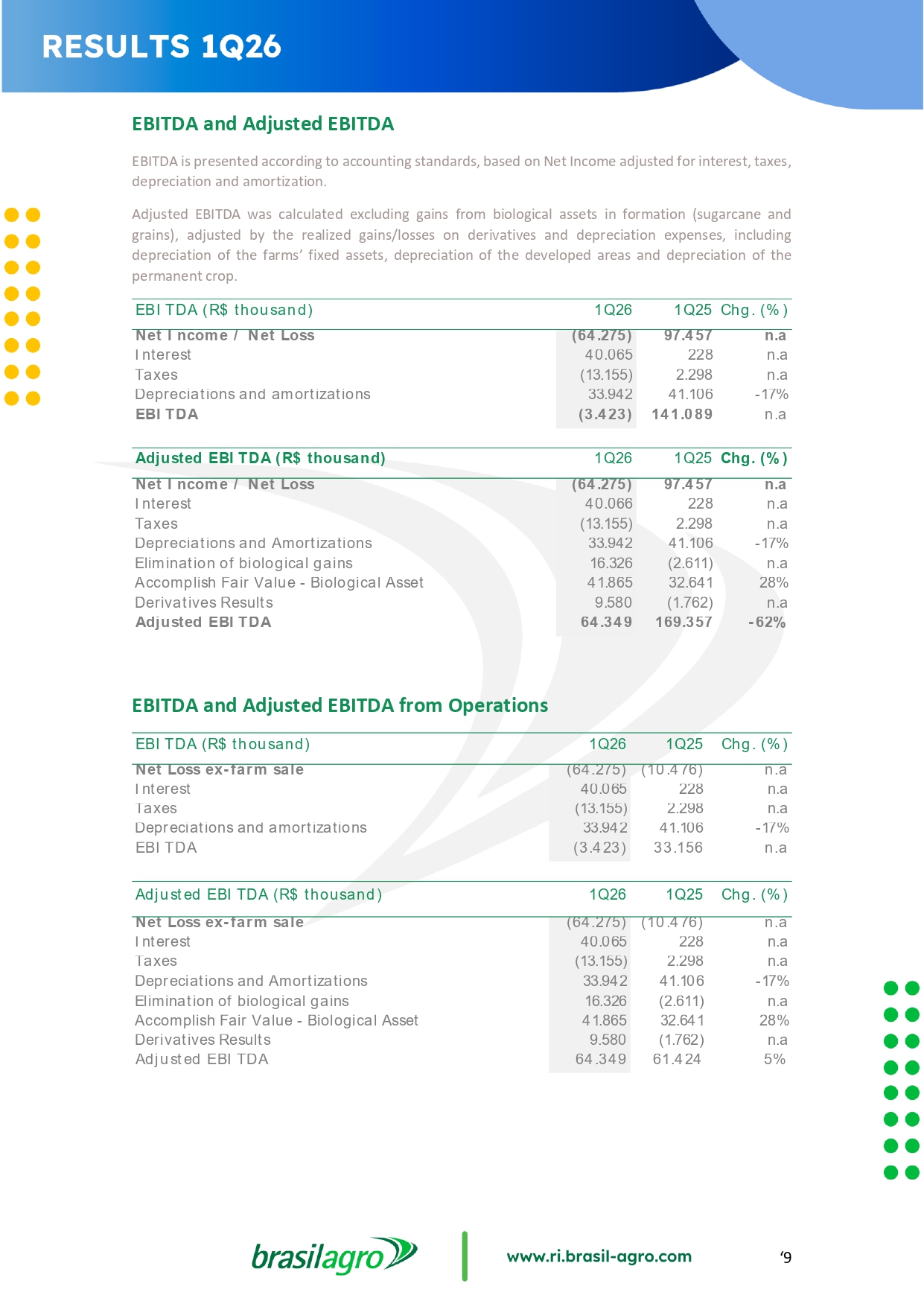 EBITDA and Adjusted EBITDA EBITDA is presented according to accounting standards, based on Net Income adjusted for interest, taxes, depreciation and amortization . Adjusted EBITDA was calculated excluding gains from biological assets in formation (sugarcane and grains), adjusted by the realized gains/losses on derivatives and depreciation expenses, including depreciation of the farms’ fixed assets, depreciation of the developed areas and depreciation of the permanent crop . Chg. (% ) 1Q25 1Q26 EBI TDA (R$ t hou sa nd) n.a 97.4 57 (64 .275) Net I ncome / Net Loss n.a 228 40.065 I nterest n.a 2.298 (13.155) Taxes - 17% 41.106 33.942 Depreciations and amortizations n.a 14 1.0 89 (3.4 23 ) EBI TDA Chg. (% ) 1Q25 1Q26 Adjusted EBI TDA (R$ thousand) n.a 97.4 57 (64 .275) Net I ncome / Net Loss n.a 228 40.066 I nterest n.a 2.298 (13.155) Taxes - 17% 41.106 33.942 Depreciations and Amortizations n.a (2.611) 16.326 Elimination of biological gains 28% 32.641 41.865 Accomplish Fair Value - Biological Asset n.a (1.762) 9.580 Derivatives Results - 62% 169.357 64 .34 9 Adjusted EBI TDA ‘ 9 EBITDA and Adjusted EBITDA from Operations Chg. (% ) 1Q25 1Q26 EBI TDA (R$ t hou sa nd) n.a (10 .4 76) (64 .275) Net Loss ex - farm sale n.a 228 40.065 I nterest n.a 2.298 (13.155) Taxes - 17% 41.106 33.942 Depreciations and amortizations n.a 33.156 (3.4 23 ) EBI TDA Chg. (% ) 1Q25 1Q26 Adj ust ed EBI TDA (R$ t hou sa nd) n.a (10 .4 76) (64 .275) Net Loss ex - farm sale n.a 228 40.065 I nterest n.a 2.298 (13.155) Taxes - 17% 41.106 33.942 Depreciations and Amortizations n.a (2.611) 16.326 Elimination of biological gains 28% 32.641 41.865 Accomplish Fair Value - Biological Asset n.a (1.762) 9.580 Derivatives Results 5% 61.4 24 64 .34 9 Adj ust ed EBI TDA