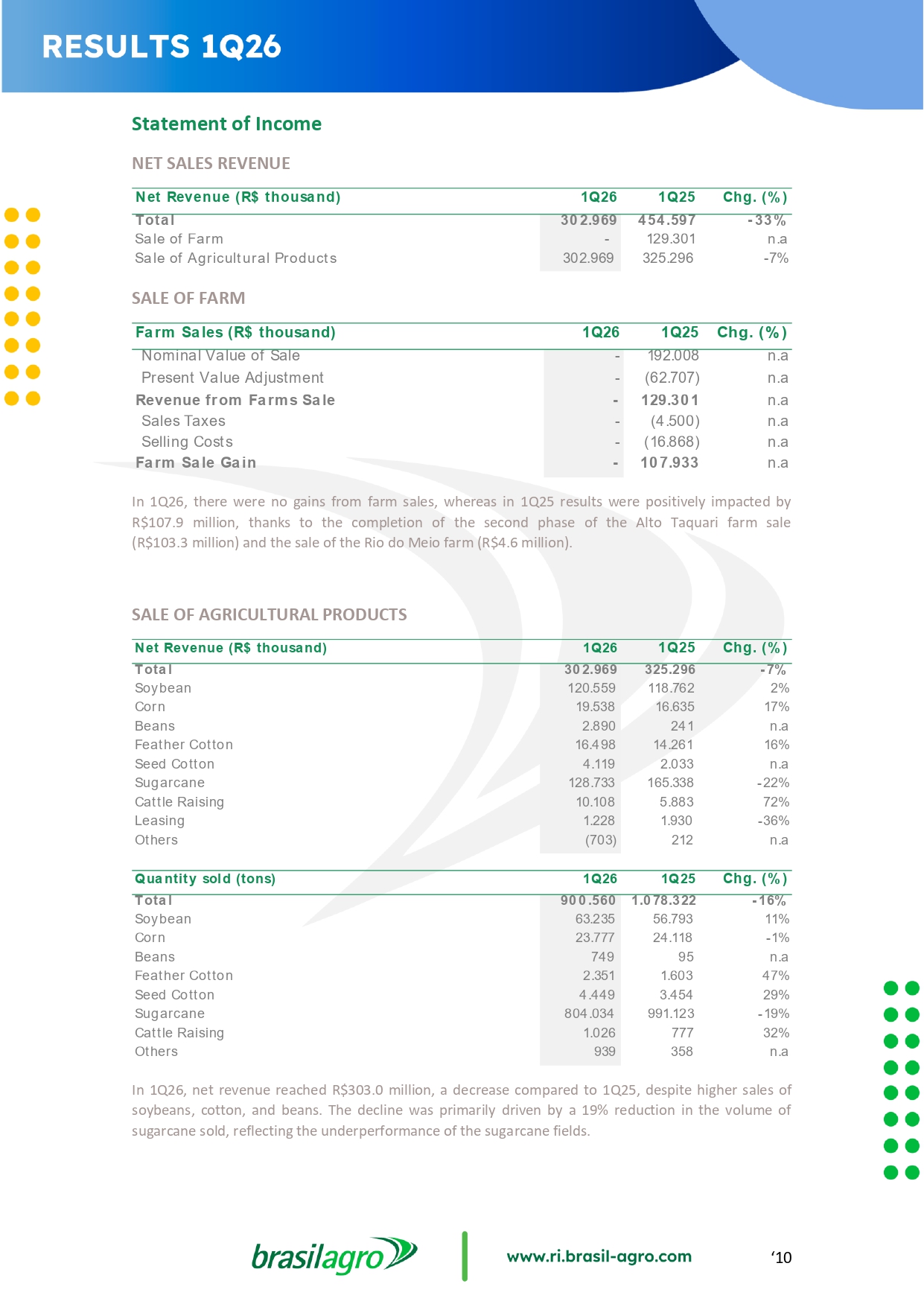 Statement of Income NET SALES REVENUE In 1 Q 26 , there were no gains from farm sales, whereas in 1 Q 25 results were positively impacted by R $ 107 . 9 million, thanks to the completion of the second phase of the Alto Taquari farm sale (R $ 103 . 3 million) and the sale of the Rio do Meio farm (R $ 4 . 6 million) . In 1 Q 26 , net revenue reached R $ 303 . 0 million, a decrease compared to 1 Q 25 , despite higher sales of soybeans, cotton, and beans . The decline was primarily driven by a 19 % reduction in the volume of sugarcane sold, reflecting the underperformance of the sugarcane fields . Net Revenue (R$ thousand) 1Q26 1Q25 Chg. (% ) - 33% 4 54 .597 30 2.969 Total n.a 129.301 - Sale of Farm - 7% 325.296 302.969 Sale of Agricultural Products SALE OF FARM Chg. (% ) 1Q25 1Q26 Fa rm Sa les (R$ thousa nd) n.a 192.008 - Nominal Value of Sale n.a (62.707) - Present Value Adjustment n.a 129.30 1 - Revenue from Fa rms Sa le n.a (4.500) - Sales Taxes n.a (16.868) - Selling Costs n.a 10 7.933 - Fa rm Sa le Ga in SALE OF AGRICULTURAL PRODUCTS Chg. (% ) 1Q25 1Q26 Net Revenue (R$ thousa nd) - 7% 325.296 30 2.969 Tota l 2% 118.762 120.559 Soybean 17% 16.635 19.538 Corn n.a 241 2.890 Beans 16% 14.261 16.498 Feather Cotton n.a 2.033 4.119 Seed Cotton - 22% 165.338 128.733 Sugarcane 72% 5.883 10.108 Cattle Raising - 36% 1.930 1.228 Leasing n.a 212 (703) Others Chg. (% ) 1Q25 1Q26 Qua ntity sold (tons) - 16% 1.0 78.322 90 0 .560 Tota l 11% 56.793 63.235 Soybean - 1% 24.118 23.777 Corn n.a 95 749 Beans 47% 1.603 2.351 Feather Cotton 29% 3.454 4.449 Seed Cotton - 19% 991.123 804.034 Sugarcane 32% 777 1.026 Cattle Raising n.a 358 939 Others ‘ 10