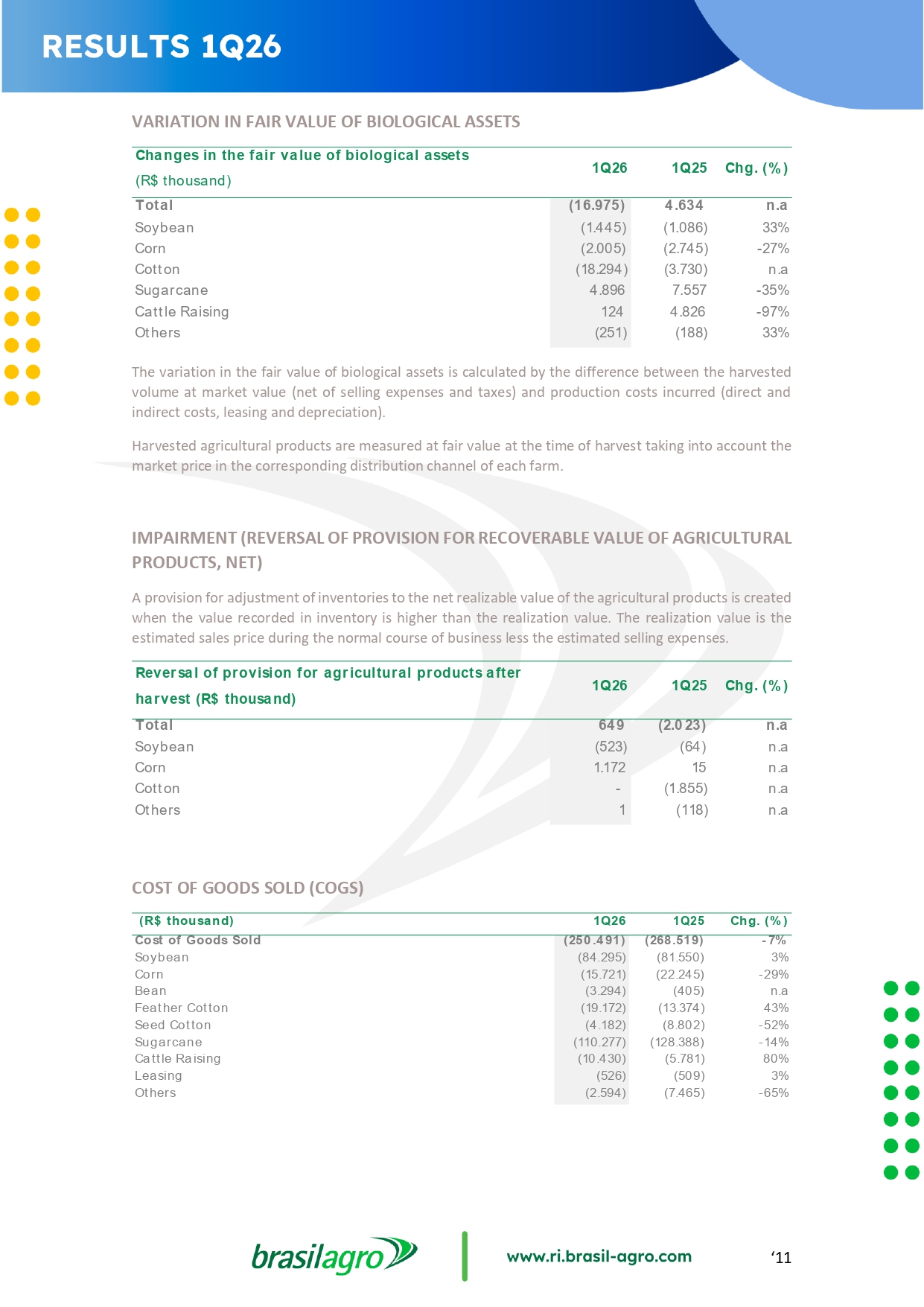 VARIATION IN FAIR VALUE OF BIOLOGICAL ASSETS The variation in the fair value of biological assets is calculated by the difference between the harvested volume at market value (net of selling expenses and taxes) and production costs incurred (direct and indirect costs, leasing and depreciation) . Harvested agricultural products are measured at fair value at the time of harvest taking into account the market price in the corresponding distribution channel of each farm . COST OF GOODS SOLD (COGS) Chg. (% ) 1Q25 Changes in the fair value of biological assets 1Q26 (R$ thousand) n.a 4 .634 (16.975) Total 33% (1.086) (1.445) Soybean - 27% (2.745) (2.005) Corn n.a (3.730) (18.294) Cotton - 35% 7.557 4.896 Sugarcane - 97% 4.826 124 Cattle Raising 33% (188) (251) Others IMPAIRMENT (REVERSAL OF PROVISION FOR RECOVERABLE VALUE OF AGRICULTURAL PRODUCTS, NET) A provision for adjustment of inventories to the net realizable value of the agricultural products is created when the value recorded in inventory is higher than the realization value . The realization value is the estimated sales price during the normal course of business less the estimated selling expenses . Reversal of provision for agricultural products after Chg. (% ) 1Q25 1Q26 harvest (R$ thousand) n.a (2.0 23) 64 9 Total n.a (64) (523) Soybean n.a 15 1.172 Corn n.a (1.855) - Cotton n.a (118) 1 Others Chg. (% ) 1Q25 1Q26 (R$ thousand) - 7% (268.519) (250 .4 91) Cost of Goods Sold 3% (81.550) (84.295) Soybean - 29% (22.245) (15.721) Corn n.a (405) (3.294) Bean 43% (13.374) (19.172) Feather Cotton - 52% (8.802) (4.182) Seed Cotton - 14% (128.388) (110.277) Sugarcane 80% (5.781) (10.430) Cattle Raising 3% (509) (526) Leasing - 65% (7.465) (2.594) Others ‘ 11