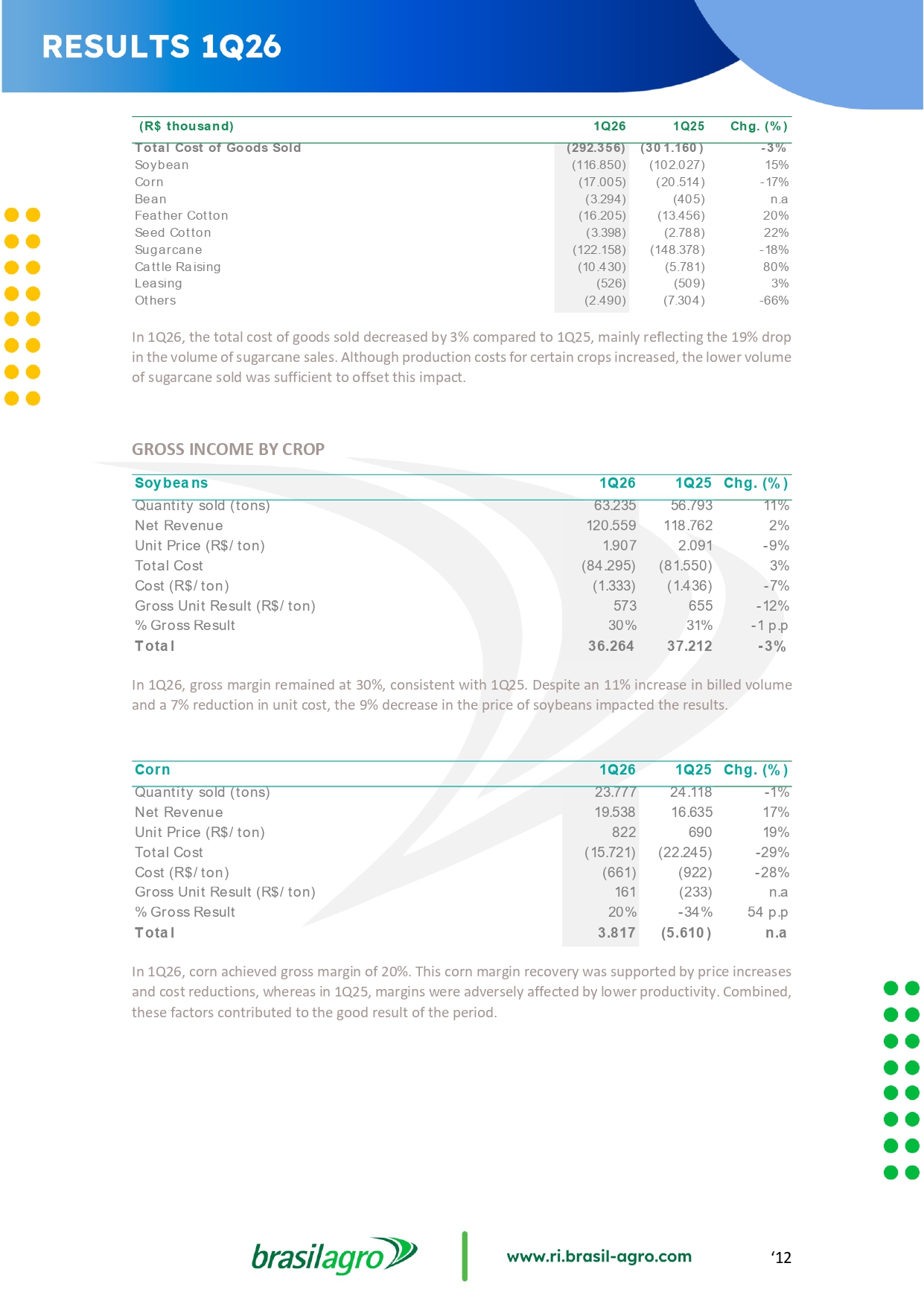In 1 Q 26 , the total cost of goods sold decreased by 3 % compared to 1 Q 25 , mainly reflecting the 19 % drop in the volume of sugarcane sales . Although production costs for certain crops increased, the lower volume of sugarcane sold was sufficient to offset this impact . ‘ 12 In 1Q26, gross margin remained at 30%, consistent with 1Q25. Despite an 11% increase in billed volume and a 7% reduction in unit cost, the 9% decrease in the price of soybeans impacted the results. In 1 Q 26 , corn achieved gross margin of 20 % . This corn margin recovery was supported by price increases and cost reductions, whereas in 1 Q 25 , margins were adversely affected by lower productivity . Combined, these factors contributed to the good result of the period . Chg. (% ) 1Q25 1Q26 (R$ thousand) - 3 % (30 1.160 ) (292.3 56) Total Cost of Goods Sold 15% (102.027) (116.850) Soybean - 17% (20.514) (17.005) Corn n.a (405) (3.294) Bean 20% (13.456) (16.205) Feather Cotton 22% (2.788) (3.398) Seed Cotton - 18% (148.378) (122.158) Sugarcane 80% (5.781) (10.430) Cattle Raising 3% (509) (526) Leasing - 66% (7.304) (2.490) Others GROSS INCOME BY CROP Chg. (% ) 1Q25 1Q26 Soybea ns 11% 56.793 63.235 Quant ity sold (tons) 2% 118.762 120.559 Net Revenue - 9% 2.091 1.907 Unit Price (R$/ ton) 3% (81.550) (84.295) Total Cost - 7% (1.436) (1.333) Cost (R$/ ton) - 12% 655 573 Gross Unit Result (R$/ ton) - 1 p.p 31% 30% % Gross Result - 3% 37.212 36.264 Tota l Chg. (% ) 1Q25 1Q26 Corn - 1% 24.118 23.777 Quant ity sold (tons) 17% 16.635 19.538 Net Revenue 19% 690 822 Unit Price (R$/ ton) - 29% (22.245) (15.721) Total Cost - 28% (922) (661) Cost (R$/ ton) n.a (233) 161 Gross Unit Result (R$/ ton) 54 p.p - 34% 20% % Gross Result n.a (5.610 ) 3.817 Tota l