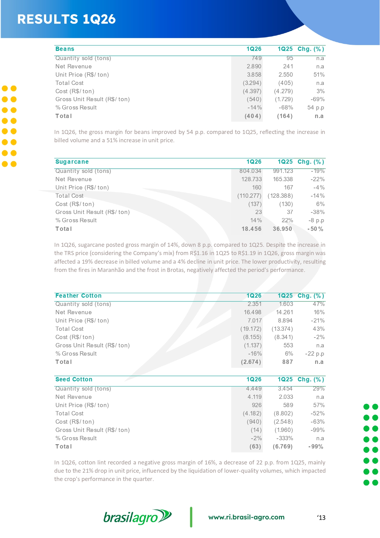In 1Q26, the gross margin for beans improved by 54 p.p. compared to 1Q25, reflecting the increase in billed volume and a 51% increase in unit price. In 1 Q 26 , sugarcane posted gross margin of 14 % , down 8 p . p . compared to 1 Q 25 . Despite the increase in the TRS price (considering the Company’s mix) from R $ 1 . 16 in 1 Q 25 to R $ 1 . 19 in 1 Q 26 , gross margin was affected a 19 % decrease in billed volume and a 4 % decline in unit price . The lower productivity, resulting from the fires in Maranhão and the frost in Brotas, negatively affected the period's performance . In 1 Q 26 , cotton lint recorded a negative gross margin of 16 % , a decrease of 22 p . p . from 1 Q 25 , mainly due to the 21 % drop in unit price, influenced by the liquidation of lower - quality volumes, which impacted the crop's performance in the quarter . Bea ns 1Q26 1Q25 Chg. (% ) 95 n.a 749 Quant ity sold (tons) 241 n.a 2.890 Net Revenue 2.550 51% 3.858 Unit Price (R$/ ton) (405) n.a (3.294) Total Cost (4.279) 3% (4.397) Cost (R$/ ton) (1.729) - 69% (540) Gross Unit Result (R$/ ton) - 68% 54 p.p - 14% % Gross Result (164 ) n.a (4 0 4 ) Tota l Chg. (% ) 1Q25 1Q26 Suga rca ne - 19% 991.123 804.034 Quant ity sold (tons) - 22% 165.338 128.733 Net Revenue - 4% 167 160 Unit Price (R$/ ton) - 14% (128.388) (110.277) Total Cost 6% (130) (137) Cost (R$/ ton) - 38% 37 23 Gross Unit Result (R$/ ton) - 8 p.p 22% 14% % Gross Result - 50 % 36.950 18.4 56 Tota l ‘ 13 Chg. (% ) 1Q25 1Q26 Fea ther Cotton 47% 1.603 2.351 Quant ity sold (tons) 16% 14.261 16.498 Net Revenue - 21% 8.894 7.017 Unit Price (R$/ ton) 43% (13.374) (19.172) Total Cost - 2% (8.341) (8.155) Cost (R$/ ton) n.a 553 (1.137) Gross Unit Result (R$/ ton) - 22 p.p 6% - 16% % Gross Result n.a 887 (2.674 ) Tota l Chg. (% ) 1Q25 1Q26 Seed Cotton 29% 3.454 4.449 Quant ity sold (tons) n.a 2.033 4.119 Net Revenue 57% 589 926 Unit Price (R$/ ton) - 52% (8.802) (4.182) Total Cost - 63% (2.548) (940) Cost (R$/ ton) - 99% (1.960) (14) Gross Unit Result (R$/ ton) n.a - 333% - 2% % Gross Result - 99% (6.769) (63) Tota l