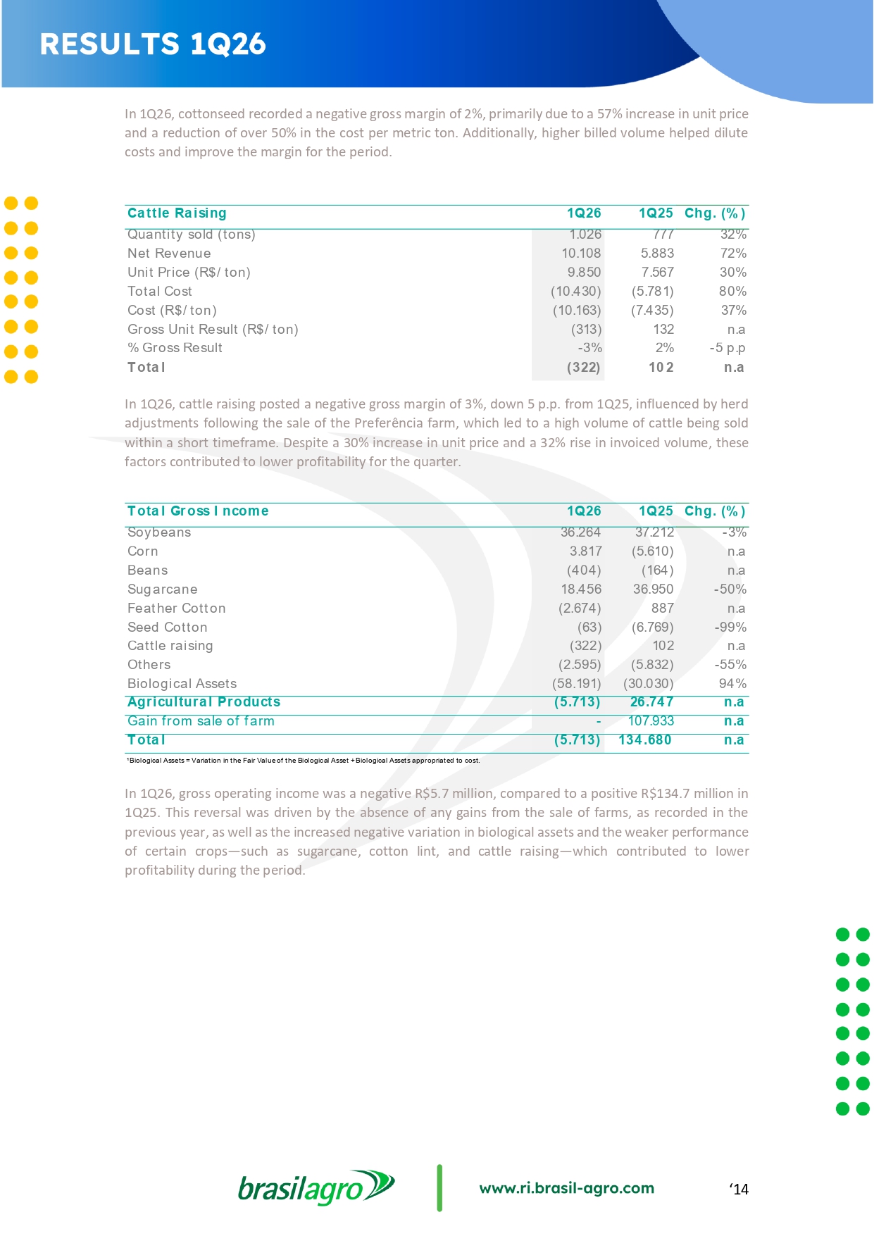 In 1 Q 26 , cottonseed recorded a negative gross margin of 2 % , primarily due to a 57 % increase in unit price and a reduction of over 50 % in the cost per metric ton . Additionally, higher billed volume helped dilute costs and improve the margin for the period . In 1 Q 26 , cattle raising posted a negative gross margin of 3 % , down 5 p . p . from 1 Q 25 , influenced by herd adjustments following the sale of the Preferência farm, which led to a high volume of cattle being sold within a short timeframe . Despite a 30 % increase in unit price and a 32 % rise in invoiced volume, these factors contributed to lower profitability for the quarter . In 1 Q 26 , gross operating income was a negative R $ 5 . 7 million, compared to a positive R $ 134 . 7 million in 1 Q 25 . This reversal was driven by the absence of any gains from the sale of farms, as recorded in the previous year, as well as the increased negative variation in biological assets and the weaker performance of certain crops — such as sugarcane, cotton lint, and cattle raising — which contributed to lower profitability during the period . Chg. (% ) 1Q25 1Q26 Ca ttle Ra ising 32% 777 1.026 Quant ity sold (tons) 72% 5.883 10.108 Net Revenue 30% 7.567 9.850 Unit Price (R$/ ton) 80% (5.781) (10.430) Total Cost 37% (7.435) (10.163) Cost (R$/ ton) n.a 132 (313) Gross Unit Result (R$/ ton) - 5 p.p 2% - 3% % Gross Result n.a 10 2 (322) Tota l Tota l Gr oss I ncome 1Q26 1Q25 Chg. (% ) 37.212 - 3% 36.264 Soybeans (5.610) n.a 3.817 Corn (164) n.a (404) Beans 36.950 - 50% 18.456 Sugarcane 887 n.a (2.674) Feather Cotton (6.769) - 99% (63) Seed Cotton 102 n.a (322) Cattle raising (5.832) - 55% (2.595) Others (30.030) 94% (58.191) Biological Assets n.a 26.74 7 (5.713) Agricultura l Products n.a 107.933 - Gain f rom sale of f arm n.a 134 .680 (5.713) Tota l ¹ Biological Asset s = Variation in the Fair Value of the Biological Asset + Biological Asset s appropriated to cost. ‘ 14