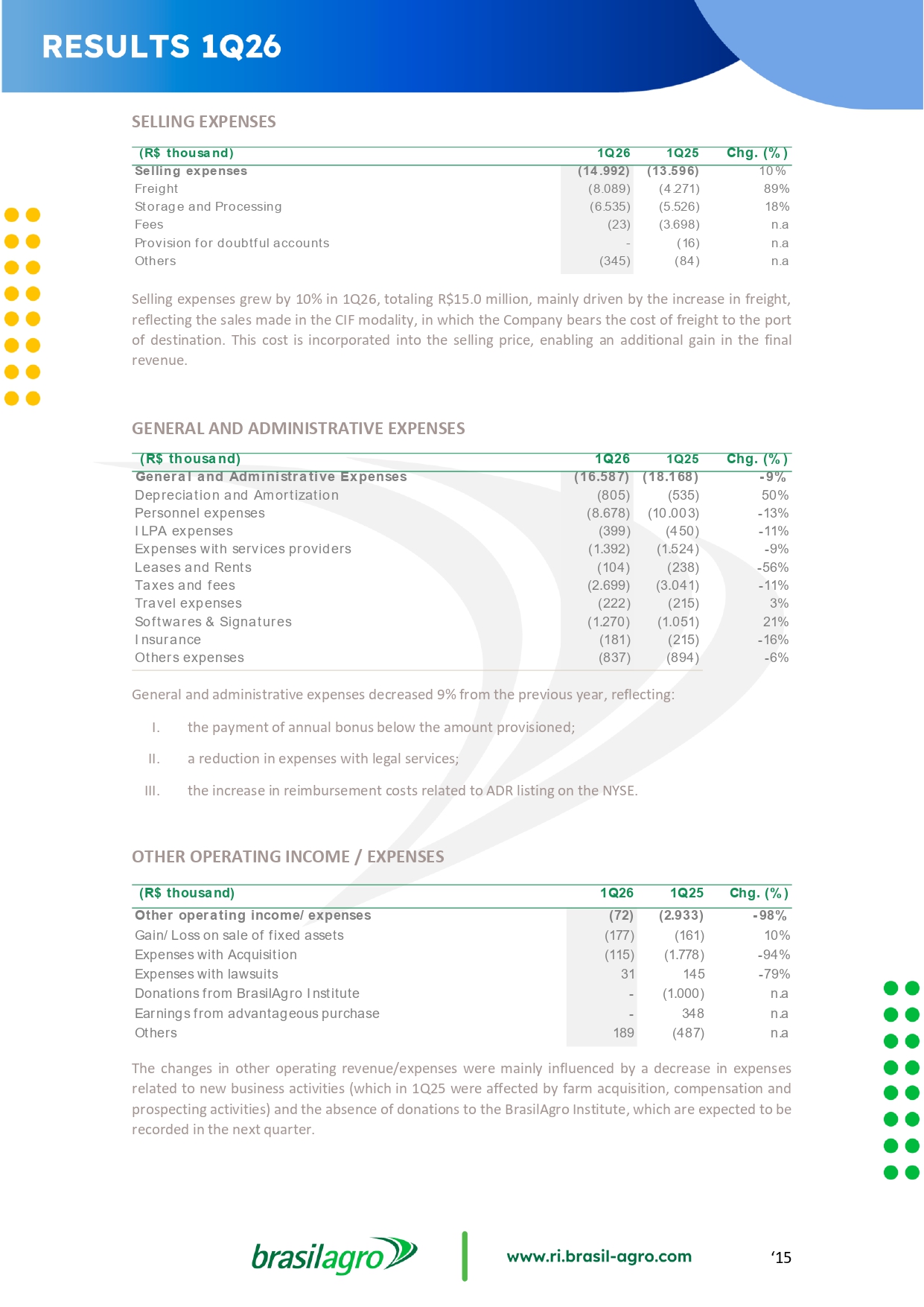 SELLING EXPENSES Selling expenses grew by 10 % in 1 Q 26 , totaling R $ 15 . 0 million, mainly driven by the increase in freight, reflecting the sales made in the CIF modality, in which the Company bears the cost of freight to the port of destination . This cost is incorporated into the selling price, enabling an additional gain in the final revenue . General and administrative expenses decreased 9% from the previous year, reflecting: I. the payment of annual bonus below the amount provisioned; II. a reduction in expenses with legal services; III. the increase in reimbursement costs related to ADR listing on the NYSE. OTHER OPERATING INCOME / EXPENSES The changes in other operating revenue/expenses were mainly influenced by a decrease in expenses related to new business activities (which in 1 Q 25 were affected by farm acquisition, compensation and prospecting activities) and the absence of donations to the BrasilAgro Institute, which are expected to be recorded in the next quarter . Chg. (% ) 1Q25 1Q26 (R$ thousa nd) 10 % (13.596) (14 .992) Selling expenses 89% (4.271) (8.089) Freight 18% (5.526) (6.535) Storage and Processing n.a (3.698) (23) Fees n.a (16) - Provision f or doubtf ul accounts n.a (84) (345) Others GENERAL AND ADMINISTRATIVE EXPENSES (R$ thousand) 1Q26 1Q25 Chg. (% ) (18.168) - 9% (16.587) General and Administrative Expenses (535) 50% (805) Depreciation and Amortization (10.003) - 13% (8.678) Personnel expenses (450) - 11% (399) I LPA expenses (1.524) - 9% (1.392) Expenses with services providers (238) - 56% (104) Leases and Rents (3.041) - 11% (2.699) Taxes and fees (215) 3% (222) Travel expenses (1.051) 21% (1.270) Softwares & Signatures (215) - 16% (181) I nsurance (894) - 6% (837) Others expenses Chg. (% ) 1Q25 1Q26 (R$ thousa nd) - 98% (2.933) (72) Other opera ting income/ expenses 10% (161) (177) Gain/ Loss on sale of f ixed assets - 94% (1.778) (115) Expenses with Acquisition - 79% 145 31 Expenses with lawsuits n.a (1.000) - Donations f rom BrasilAgro I nstitute n.a 348 - Earnings f rom advantageous purchase n.a (487) 189 Others ‘ 15