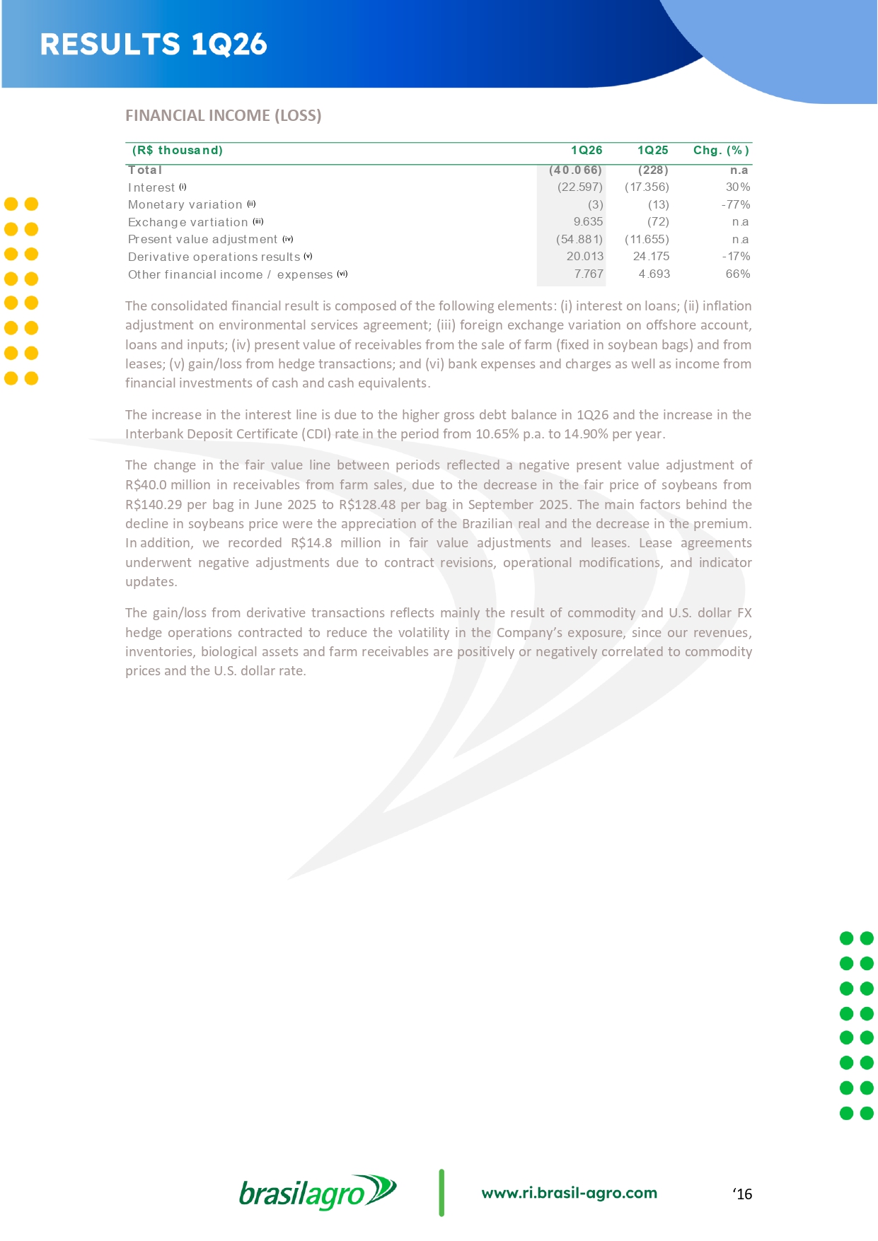 FINANCIAL INCOME (LOSS) ‘ 16 The consolidated financial result is composed of the following elements : (i) interest on loans ; (ii) inflation adjustment on environmental services agreement ; (iii) foreign exchange variation on offshore account, loans and inputs ; (iv) present value of receivables from the sale of farm (fixed in soybean bags) and from leases ; (v) gain/loss from hedge transactions ; and (vi) bank expenses and charges as well as income from financial investments of cash and cash equivalents . The increase in the interest line is due to the higher gross debt balance in 1 Q 26 and the increase in the Interbank Deposit Certificate (CDI) rate in the period from 10 . 65 % p . a . to 14 . 90 % per year . The change in the fair value line between periods reflected a negative present value adjustment of R $ 40 . 0 million in receivables from farm sales, due to the decrease in the fair price of soybeans from R $ 140 . 29 per bag in June 2025 to R $ 128 . 48 per bag in September 2025 . The main factors behind the decline in soybeans price were the appreciation of the Brazilian real and the decrease in the premium . In addition, we recorded R $ 14 . 8 million in fair value adjustments and leases . Lease agreements underwent negative adjustments due to contract revisions, operational modifications, and indicator updates . The gain/loss from derivative transactions reflects mainly the result of commodity and U . S . dollar FX hedge operations contracted to reduce the volatility in the Company’s exposure, since our revenues, inventories, biological assets and farm receivables are positively or negatively correlated to commodity prices and the U . S . dollar rate . Chg. (% ) 1Q25 1Q26 (R$ thousa nd) n.a (228) (4 0 .0 66) Tota l 30% (17.356) (22.597) I nterest (i) - 77% (13) (3) Monetary variation (ii) n.a (72) 9.635 Exchange vartiation (iii) n.a (11.655) (54.881) Present value adjustment (iv) - 17% 24.175 20.013 Derivative operations results (v) 66% 4.693 7.767 Other f inancial income / expenses (vi)