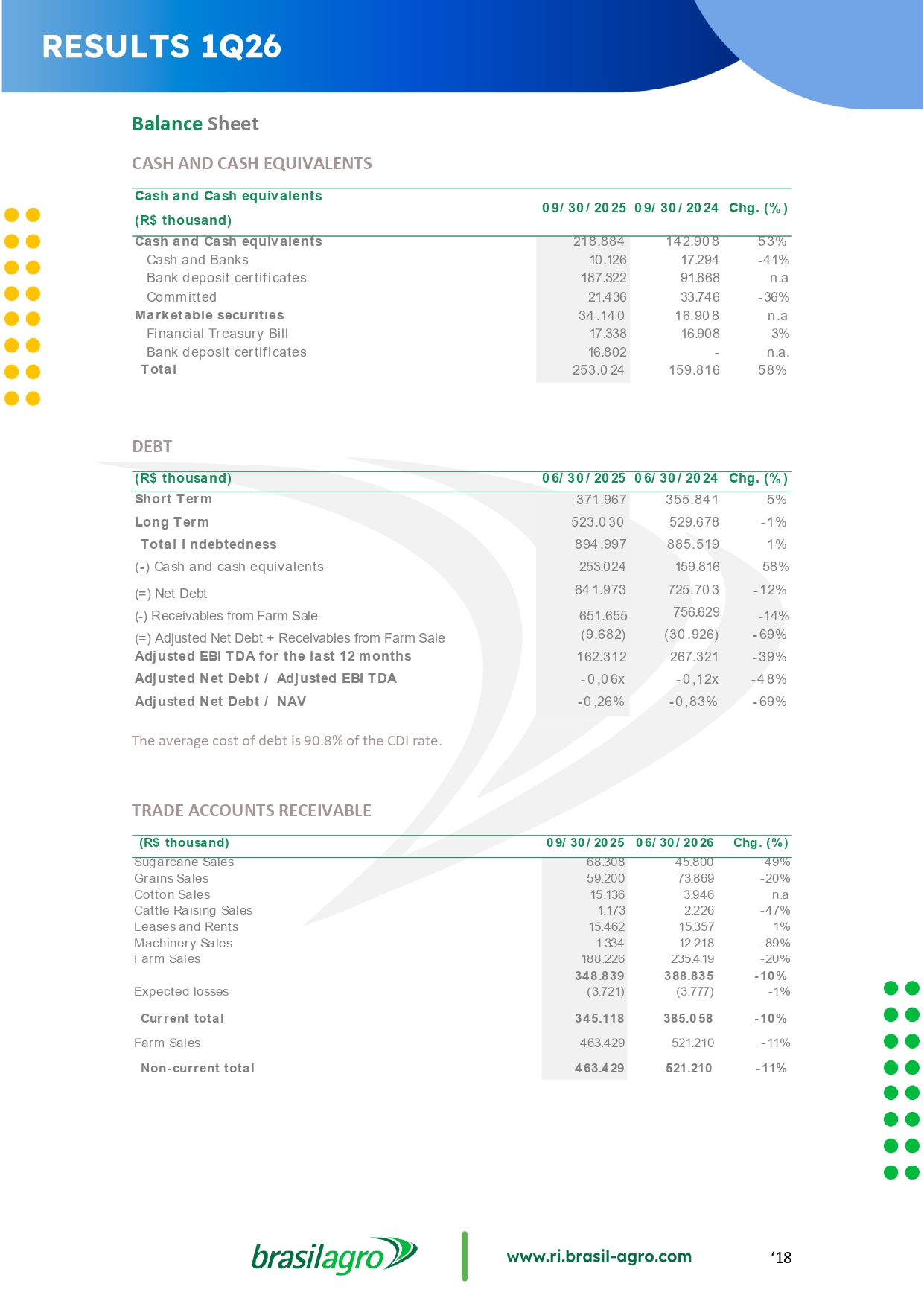 Balance Sheet CASH AND CASH EQUIVALENTS TRADE ACCOUNTS RECEIVABLE Cash and Cash equivalents (R$ thousand) 0 9/ 30 / 20 25 0 9/ 30 / 20 24 Chg. (% ) 53% 14 2.90 8 218.884 Cash and Cash equivalents - 41% 17.294 10.126 Cash and Banks n.a 91.868 187.322 Bank deposit certif icates - 36% 33.746 21.436 Committed n.a 16.90 8 34 .14 0 Marketable securities 3% 16.908 17.338 Financial Treasury Bill n.a. - 16.802 Bank deposit certif icates 58% 159.816 253.0 24 Total DEBT Chg. (% ) 30 / 20 24 0 6/ 30 / 20 25 0 6/ (R$ thousand) 5% 355.84 1 371.967 Short Term - 1% 529.678 523.0 30 Long Term 1% 885.519 894 .997 Total I ndebtedness 58% 159.816 253.024 ( - ) Cash and cash equivalents - 12% 725.70 3 64 1.973 (=) Net Debt - 14% 756.629 651.655 ( - ) Receivables from Farm Sale - 69% (30 .926) (9.682) (=) Adjusted Net Debt + Receivables from Farm Sale - 39% 267.321 162.312 Adjusted EBI TDA for the last 12 months - 4 8% - 0 ,12x - 0 ,0 6x Adjusted Net Debt / Adjusted EBI TDA - 69% - 0 ,83% - 0 ,26% Adjusted Net Debt / NAV The average cost of debt is 90.8% of the CDI rate. Chg. (% ) 0 6/ 30 / 20 26 0 9/ 30 / 20 25 (R$ thousa nd) 49% 45.800 68.308 Sugarcane Sales - 20% 73.869 59.200 Grains Sales n.a 3.946 15.136 Cotton Sales - 47% 2.226 1.173 Cattle Raising Sales 1% 15.357 15.462 Leases and Rents - 89% 12.218 1.334 Machinery Sales - 20% 235.419 188.226 Farm Sales - 10 % 388.835 34 8.839 - 1% (3.777) (3.721) Expected losses - 10 % 385.0 58 34 5.118 Current tota l - 11% 521.210 463.429 Farm Sales - 11% 521.210 4 63.4 29 Non - current tota l ‘ 18
