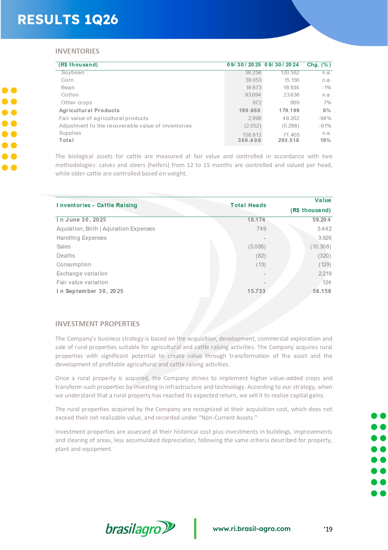 The biological assets for cattle are measured at fair value and controlled in accordance with two methodologies : calves and steers (heifers) from 12 to 15 months are controlled and valued per head, while older cattle are controlled based on weight . INVESTMENT PROPERTIES The Company’s business strategy is based on the acquisition, development, commercial exploration and sale of rural properties suitable for agricultural and cattle raising activities . The Company acquires rural properties with significant potential to create value through transformation of the asset and the development of profitable agricultural and cattle raising activities . Once a rural property is acquired, the Company strives to implement higher value - added crops and transform such properties by investing in infrastructure and technology . According to our strategy, when we understand that a rural property has reached its expected return, we sell it to realize capital gains . The rural properties acquired by the Company are recognized at their acquisition cost, which does not exceed their net realizable value, and recorded under “Non - Current Assets . " Investment properties are assessed at their historical cost plus investments in buildings, improvements and clearing of areas, less accumulated depreciation, following the same criteria described for property, plant and equipment . INVENTORIES (R$ thousand) 0 9/ 30 / 20 25 0 9/ 30 / 20 24 Chg. (% ) n.a. 120.562 38.258 Soybean n.a. 15.156 39.053 Corn - 1% 18.934 18.673 Bean n.a. 23.638 93.694 Cotton 7% 909 972 Other crops 6% 179.199 190 .650 Agricultural Products - 94% 48.202 2.998 Fair value of agricultural products - 61% (5.288) (2.052) Adjustment to the recoverable value of inventories n.a. 71.405 158.812 Supplies 19% 293.518 350 .4 0 8 Total I nventories - Ca ttle Ra ising Tota l Hea ds Va lue ( R$ thousa nd) 59.20 4 18.174 I n J une 30 , 20 25 3.442 749 Aquisition, Birth | Aquisition Expenses 3.926 - Handling Expenses (10.308) (3.095) Sales (320) (82) Deaths (129) (13) Consumption 2.219 - Exchange variation 124 - Fair value variation 58.158 15.733 I n September 30 , 20 25 ‘ 19