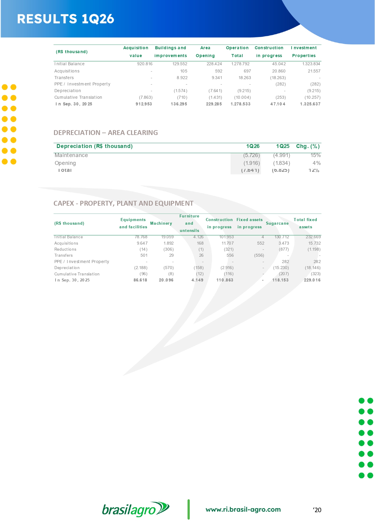 DEPRECIATION – AREA CLEARING CAPEX - PROPERTY, PLANT AND EQUIPMENT (R$ thousand) Acquisition Buildings and Area Operation Construction I nvestment Properties in progress Total Opening improvements value 1.323.834 45.042 1.278.792 228.424 129.552 920.816 I nitial Balance 21.557 20.860 697 592 105 - Acquisitions - (18.263) 18.263 9.341 8.922 - Transfers (282) (282) - - - - PPE / I nvestment Property (9.215) - (9.215) (7.641) (1.574) - Depreciation (10.257) (253) (10.004) (1.431) (710) (7.863) Cumulative Translation 1.325.637 4 7.10 4 1.278.533 229.285 136.295 912.953 I n Sep. 30 , 20 25 Chg. (% ) 1Q25 1Q26 Depreciation (R$ thousand) 15% (4.991) (5.726) Maintenance 4% (1.834) (1.916) Opening 12% (6.825) (7.64 1) Total (R$ thousand) Equipments and facilities Machinery Furniture and Construction Fixed assets in progress in progress Sugar ca ne Total fixed assets untensils 232.669 130.712 4 101.953 4.126 19.059 78.768 I nitial Balance 15.732 3.473 552 11.707 168 1.892 9.647 Acquisitions (1.198) (877) - (321) (1) (306) (14) Reductions - - (556) 556 26 29 501 Transfers 282 282 - - - - - PPE / I nvestment Property (18.146) (15.230) - (2.916) (158) (570) (2.188) Depreciation (323) (207) - (116) (12) (8) (96) Cumulative Translation 229.0 16 118.153 - 110 .863 4 .14 9 20 .0 96 86.618 I n Sep. 30 , 20 25 ‘ 20