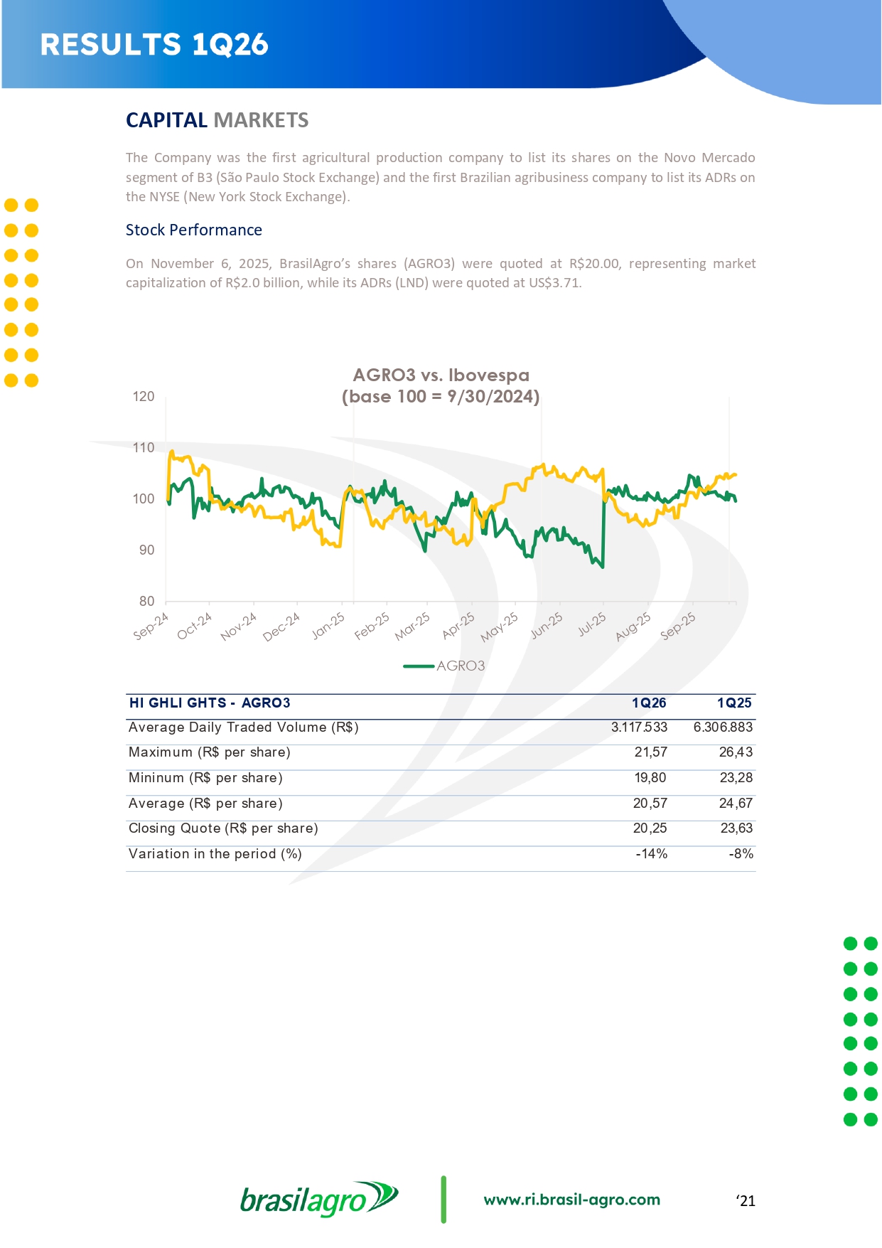 CAPITAL MARKETS The Company was the first agricultural production company to list its shares on the Novo Mercado segment of B 3 (São Paulo Stock Exchange) and the first Brazilian agribusiness company to list its ADRs on the NYSE (New York Stock Exchange) . Stock Performance On November 6 , 2025 , BrasilAgro’s shares (AGRO 3 ) were quoted at R $ 20 . 00 , representing market capitalization of R $ 2 . 0 billion, while its ADRs (LND) were quoted at US $ 3 . 71 . 110 100 90 80 120 AGRO3 vs. Ibovespa (base 100 = 9/30/2024) AGRO3 1Q25 1Q26 HI GHLI GHTS - AGRO3 6.306.883 3.117.533 Average Daily Traded Volume (R$) 26,43 21,57 Maximum (R$ per share) 23,28 19,80 Mininum (R$ per share) 24,67 20,57 Average (R$ per share) 23,63 20,25 Closing Quote (R$ per share) - 8% - 14% Variation in the period (%) ‘ 21