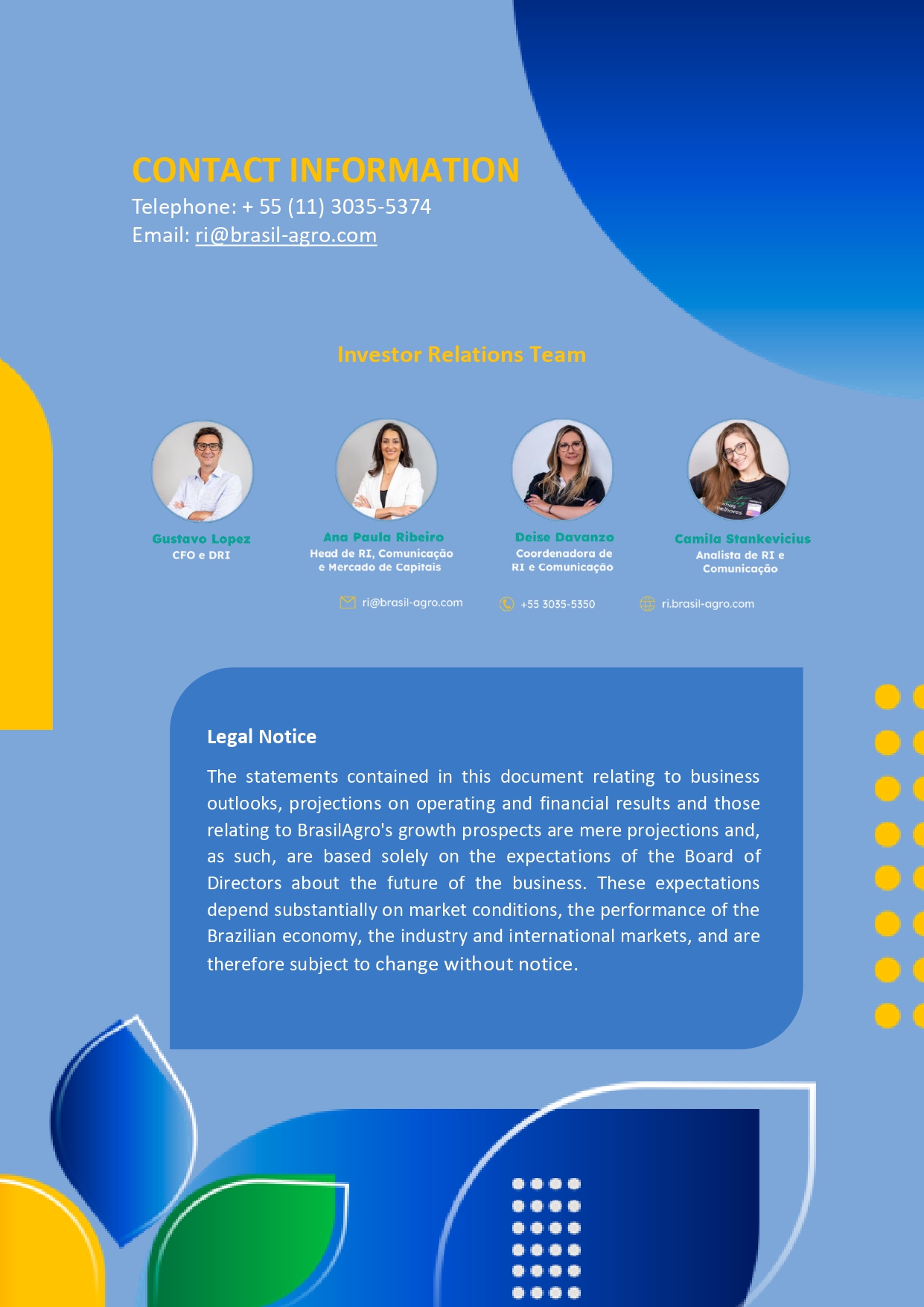 ‘22 CONTACT INFORMATION Telephone: + 55 (11) 3035 - 5374 Email: ri@brasil - agro.com Investor Relations Team Legal Notice The statements contained in this document relating to business outlooks, projections on operating and financial results and those relating to BrasilAgro's growth prospects are mere projections and, as such, are based solely on the expectations of the Board of Directors about the future of the business . These expectations depend substantially on market conditions, the performance of the Brazilian economy, the industry and international markets, and are therefore subject to change without notice .