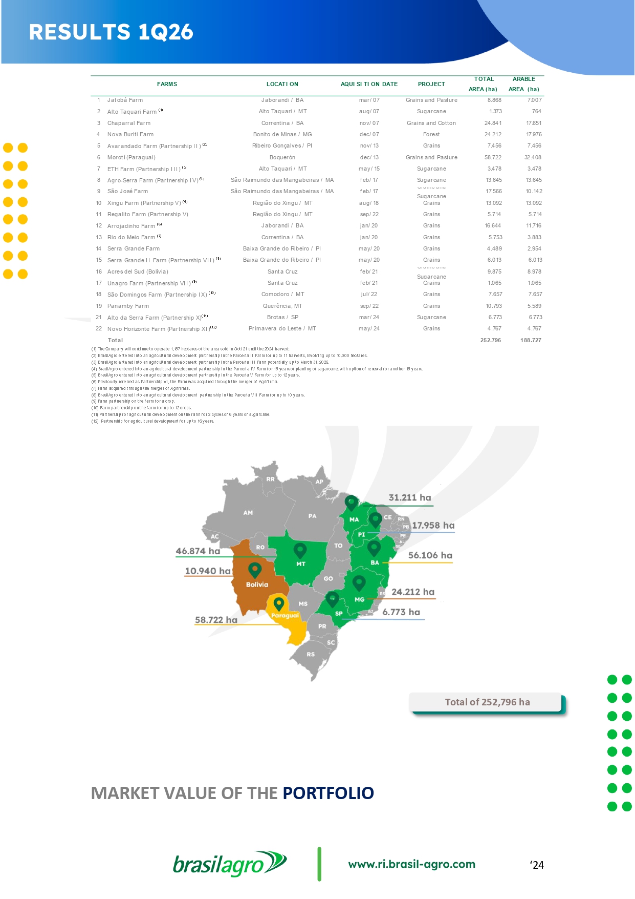 MARKET VALUE OF THE PORTFOLIO ARABLE AREA (ha) TOTAL AREA (ha) FARMS LOCATI ON AQUI SI TI ON DATE PROJECT 7.007 8.868 1 J atobá Farm J aborandi / BA mar/ 07 Grains and Pasture 764 1.373 2 Alto Taquari Farm (1) Alto Taquari / MT aug/ 07 Sugarcane 17.651 24.841 3 Chaparral Farm Correntina / BA nov/ 07 Grains and Cotton 17.976 24.212 4 Nova Buriti Farm Bonito de Minas / MG dec/ 07 Forest 7.456 7.456 5 Avarandado Farm (Partnership I I ) (2) Ribeiro Gonçalves / PI nov/ 13 Grains 32.408 58.722 6 Morotí (Paraguai) Boquerón dec/ 13 Grains and Pasture 3.478 3.478 7 ETH Farm (Partnership I I I ) (3) Alto Taquari / MT may/ 15 Sugarcane 13.645 13.645 8 Agro - Serra Farm (Partnership I V) (4) São Raimundo das Mangabeiras / MA feb/ 17 Sugarcane 10.142 17.566 9 São J osé Farm São Raimundo das Mangabeiras / MA feb/ 17 Sugarcane 13.092 13.092 10 Xingu Farm (Partnership V) (5) Região do Xingu / MT aug/ 18 Grains 5.714 5.714 11 Regalito Farm (Partnership V) Região do Xingu / MT sep/ 22 Grains 11.716 16.644 12 Arrojadinho Farm (6) J aborandi / BA jan/ 20 Grains 3.883 5.753 13 Rio do Meio Farm (7) Correntina / BA jan/ 20 Grains 2.954 4.489 14 Serra Grande Farm Baixa Grande do Ribeiro / PI may/ 20 Grains 6.013 6.013 15 Serra Grande I I Farm (Partnership VI I ) (8) Baixa Grande do Ribeiro / PI may/ 20 Grains 8.978 9.875 16 Acres del Sud (Bolívia) Santa Cruz feb/ 21 Sugarcane 1.065 1.065 17 Unagro Farm (Partnership VI I ) (9) Santa Cruz feb/ 21 Grains 7.657 7.657 18 São Domingos Farm (Partnership I X) (10) Comodoro / MT jul/ 22 Grains 5.589 10.793 19 Panamby Farm Querência, MT sep/ 22 Grains 6.773 6.773 21 Alto da Serra Farm (Partnership X) (11) Brotas / SP mar/ 24 Sugarcane 4.767 4.767 22 Novo Horizonte Farm (Partnership XI ) (12) Primavera do Leste / MT may/ 24 Grains 188.727 252.796 Total (1) The Company will continue to operate 1,157 hectares of the area sold in Oct/ 21 until the 2024 harvest. (2) BrasilAg ro entered into an agricultural development partnership in the Parceria I I Farm for up to 11 harvests, involving up to 10,000 hectares. (3) BrasilAg ro entered into an agricultural development partnership in the Parceria I I I Farm potentially up to March 31, 2026. (4) BrasilAg ro entered into an agricultural development partnership in the Parceria I V Farm for 15 years of planting of sugarcane, with option of renewal for another 15 years. (5) BrasilAg ro entered into an agricultural development partnership in the Parceria V Farm for up to 12 years. (6) Previously referred as Partnership VI , the Farm was acquired through the merger of Agrifirma. (7) Farm acquired through the merger of Agrifirma. (8) BrasilAg ro entered into an agricultural development partnership in the Parceria VI I Farm for up to 10 years. (9) Farm partnership on the farm for a crop. (10) Farm partnership on the farm for up to 12 crops. (11) Partnership for agricultural development on the farm for 2 cycles of 6 years of sugarcane. (12) Partnership for agricultural development for up to 16 years. Total of 252,796 ha ‘ 24