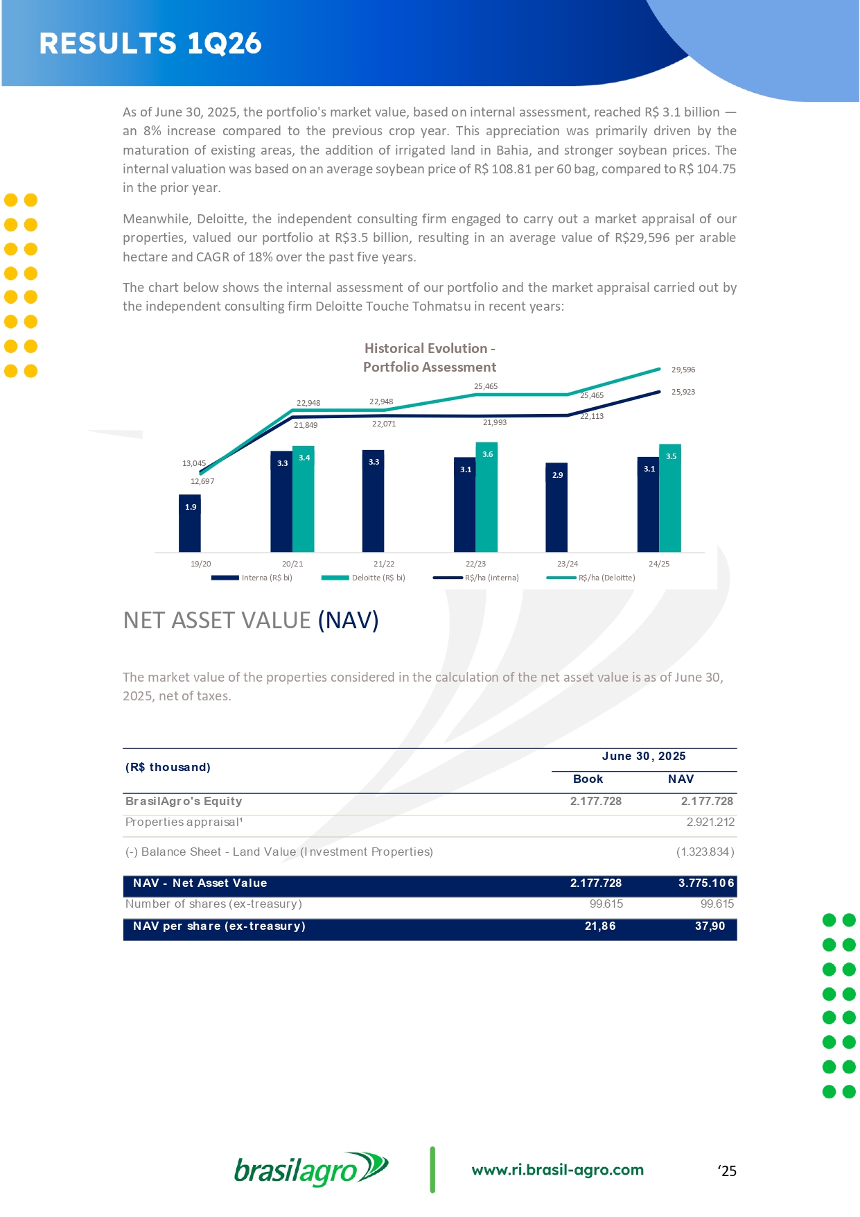 As of June 30 , 2025 , the portfolio's market value, based on internal assessment, reached R $ 3 . 1 billion — an 8 % increase compared to the previous crop year . This appreciation was primarily driven by the maturation of existing areas, the addition of irrigated land in Bahia, and stronger soybean prices . The internal valuation was based on an average soybean price of R $ 108 . 81 per 60 bag, compared to R $ 104 . 75 in the prior year . Meanwhile, Deloitte, the independent consulting firm engaged to carry out a market appraisal of our properties, valued our portfolio at R $ 3 . 5 billion, resulting in an average value of R $ 29 , 596 per arable hectare and CAGR of 18 % over the past five years . The chart below shows the internal assessment of our portfolio and the market appraisal carried out by the independent consulting firm Deloitte Touche Tohmatsu in recent years : NET ASSET VALUE (NAV) The market value of the properties considered in the calculation of the net asset value is as of June 30, 2025, net of taxes. 3.3 3.3 3.1 2.9 3.1 3.4 3.5 13,045 21,849 22,071 21,993 3.6 22,113 25,923 12,697 1.9 22,948 22,948 25,465 29,596 19/20 23/24 24/25 Historical Evolution - Portfolio Assessment 25,465 20/21 Interna (R$ bi) 21/22 Deloitte (R$ bi) 22/23 R$/ha (interna) R$/ha (Deloitte) ‘ 25 June 30 , 20 25 (R$ thousand) NAV Book 2.177.728 2.177.728 BrasilAgro's Equity 2.921.212 Properties appraisal¹ (1.323.834) ( - ) Balance Sheet - Land Value (I nvestment Properties) 3.775.10 6 2.177.728 NAV - Net Asset Value 99.615 99.615 Number of shares (ex - treasury) 37,90 21,86 NAV per share (ex - treasury)