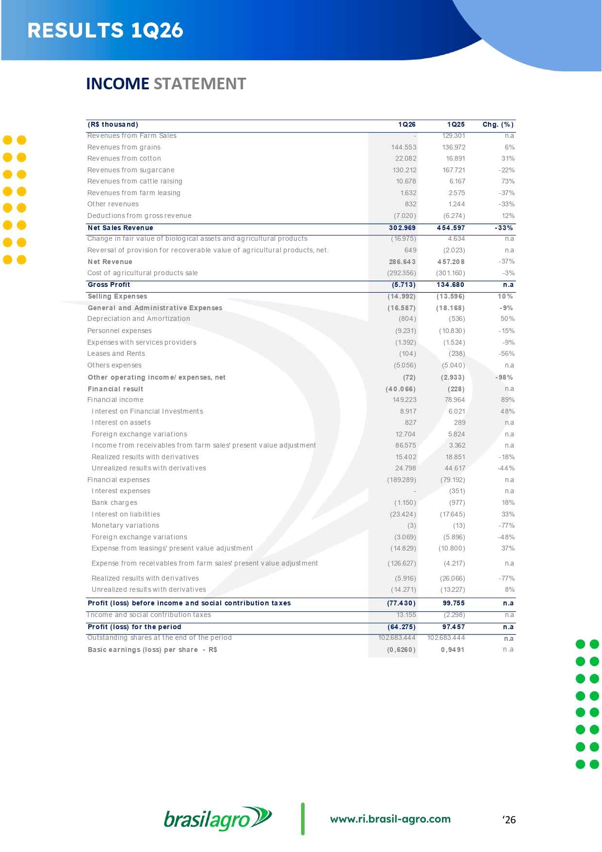 INCOME STATEMENT (R$ thousand) 1Q26 1Q25 Chg. (% ) 129.301 n.a - Revenues from Farm Sales 136.972 6% 144.553 Revenues from grains 16.891 31% 22.082 Revenues from cotton 167.721 - 22% 130.212 Revenues from sugarcane 6.167 73% 10.678 Revenues from cattle raising 2.575 - 37% 1.632 Revenues from farm leasing 1.244 - 33% 832 Other revenues (6.274) 12% (7.020) Deductions from gross revenue - 33% 4 54 .597 30 2.969 Net Sales Revenue n.a 4.634 (16.975) Change in fair value of biological assets and agricultural products n.a (2.023) 649 Reversal of provision for recoverable value of agricultural products, net. - 37% 4 57.20 8 286.64 3 Net Revenue - 3% (301.160) (292.356) Cost of agricultural products sale n.a 134 .680 (5.713) Gross Pr ofit (13.596) 10 % (14 .992) Selling Expenses (18.168) - 9% (16.587) General and Administrative Expenses (536) 50% (804) Depreciation and Amortizat ion (10.830) - 15% (9.231) Personnel expenses (1.524) - 9% (1.392) Expenses with services providers (238) - 56% (104) Leases and Rents (5.040) n.a (5.056) Others expenses (2.933) - 98% (72) Other operating income/ expenses, net (228) n.a (4 0 .0 66) Financial result 78.964 89% 149.223 Financial income 6.021 48% 8.917 I nterest on Financial I nvestments 289 n.a 827 I nterest on assets 5.824 n.a 12.704 Foreign exchange variations 3.362 n.a 86.575 I ncome from receivables from farm sales' present value adjustment 18.851 - 18% 15.402 Realized results with derivatives 44.617 - 44% 24.798 Unrealized results with derivatives (79.192) n.a (189.289) Financial expenses (351) n.a - I nterest expenses (977) 18% (1.150) Bank charges (17.645) 33% (23.424) I nterest on liabilities (13) - 77% (3) Monetary variations (5.896) - 48% (3.069) Foreign exchange variations (10.800) 37% (14.829) Expense from leasings' present value adjustment (4.217) n.a (126.627) Expense from receivables from farm sales' present value adjustment (26.066) - 77% (5.916) Realized results with derivatives (13.227) 8% (14.271) Unrealized results with derivatives n.a 99.755 (77.4 30 ) Pr ofit (loss) before income and social contribution taxes n.a (2.298) 13.155 I ncome and social contribution taxes n.a 97.4 57 (64 .275) Pr ofit (loss) for the period n.a 102.683.444 102.683.444 Outstanding shares at the end of the period n.a 0 ,94 91 (0 ,6260 ) Basic earnings (loss) per share - R$ ‘ 26
