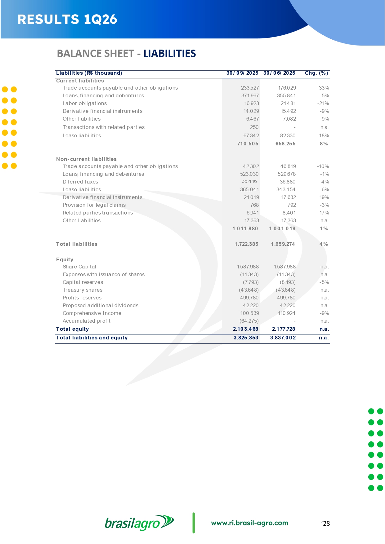BALANCE SHEET - LIABILITIES Liabilities (R$ thousand) 30 / 0 9/ 20 25 30 / 0 6/ 20 25 Chg. (% ) Current liabilities 176.029 33% 233.527 Trade accounts payable and other obligations 355.841 5% 371.967 Loans, f inancing and debentures 21.481 - 21% 16.923 Labor obligations 15.492 - 9% 14.029 Derivative f inancial instruments 7.082 - 9% 6.467 Other liabilities - n.a. 250 Transactions with related parties 82.330 - 18% 67.342 Lease liabilities 658.255 8% 710 .50 5 Non - current liabilities 46.819 - 10% 42.302 Trade accounts payable and other obligations 529.678 - 1% 523.030 Loans, f inancing and debentures 36.880 - 4% 35.416 Diferred taxes 343.454 6% 365.041 Lease liabilities 17.632 19% 21.019 Derivative f inancial instruments 792 - 3% 768 Provision for legal claims 8.401 - 17% 6.941 Related parties t ransactions 17.363 n.a. 17.363 Other liabilities 1.0 0 1.0 19 1% 1.0 11.880 1.659.274 4% 1.722.385 Total liabilities Equity 1.587.988 n.a. 1.587.988 Share Capital (11.343) n.a. (11.343) Expenses with issuance of shares (8.193) - 5% (7.793) Capital reserves (43.648) n.a. (43.648) Treasury shares 499.780 n.a. 499.780 Profits reserves 42.220 n.a. 42.220 Proposed additional dividends 110.924 - 9% 100.539 Comprehensive I ncome - n.a. (64.275) Accumulated profit 2.177.728 n.a. 2.10 3.4 68 Total equity 3.837.0 0 2 n.a. 3.825.853 Total liabilities and equity ‘ 28