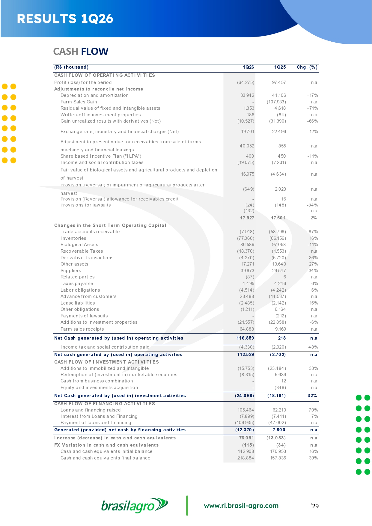 CASH FLOW (R$ thousand) 1Q26 1Q25 Chg. (% ) CASH FLOW OF OPERATI NG ACTI VI TI ES 97.457 n.a (64.275) Prof it (loss) f or the period Adjustments to reconcile net income 41.106 - 17% 33.942 Depreciation and amortization (107.933) n.a - Farm Sales Gain 4.618 - 71% 1.353 Residual value of f ixed and intangible assets (84) n.a 186 Written - of f in investment properties (31.390) - 66% (10.527) Gain unrealized results with derivatives (Net) 22.496 - 12% 19.701 Exchange rate, monetary and f inancial charges (Net) 855 n.a 40.052 Adjustment to present value f or receivables f rom sale of f arms, machinery and f inancial leasings 450 - 11% 400 Share based I ncentive Plan ("I LPA") (7.231) n.a (19.075) I ncome and social contribution taxes (4.634) n.a 16.975 Fair value of biological assets and agricultural products and depletion of harvest 2.023 n.a (649) Provision (Reversal) of impairment of agricultural products af ter harvest 16 n.a - Provision (Reversal) allowance f or receivables credit (148) - 84% (24) Provisions f or law suits - n.a (132) 17.60 1 2% 17.927 Changes in the Short Term Operating Capital (58.796) - 87% (7.918) Trade accounts receivable (66.156) 16% (77.060) I nventories 97.058 - 11% 86.589 Biological Assets (1.553) n.a (18.370) Recoverable Taxes (6.720) - 36% (4.270) Derivative Transactions 13.643 27% 17.271 Other assets 29.547 34% 39.673 Suppliers 6 n.a (87) Related parties 4.246 6% 4.495 Taxes payable (4.242) 6% (4.514) Labor obligations (14.537) n.a 23.488 Advance f rom customers (2.142) 16% (2.485) Lease liabilities 6.164 n.a (1.211) Other obligations (212) n.a - Payments of law suits (22.858) - 6% (21.557) Additions to investment properties 9.169 n.a 64.888 Farm sales receipts n.a 218 116.859 Net Cash generated by (used in) operating activities 48% (2.920) (4.330) I ncome tax and social contribution paid n.a (2.70 2) 112.529 Net cash generated by (used in) operating activities CASH FLOW OF I NVESTMENT ACTI VI TI ES (23.484) - 33% (15.753) Additions to immobilized and intangible 5.639 n.a (8.315) Redemption of (investment in) marketable securities 12 n.a - Cash f rom business combination (348) n.a - Equity and investments acquisition 32% (18.181) (24 .0 68) Net Cash generated by (used in) investment activities CASH FLOW OF FI NANCI NG ACTI VI TI ES 70% 62.213 105.464 Loans and f inancing raised 7% (7.411) (7.899) I nterest f rom Loans and Financing n.a (47.002) (109.935) Payment of loans and f inancing n.a 7.80 0 (12.370 ) Generated (provided) net cash by financing activities n.a (13.0 83) 76.0 91 I ncrease (decrease) in cash and cash equivalents n.a (34 ) (115) FX Variation in cash and cash equivalents - 16% 170.953 142.908 Cash and cash equivalents initial balance 39% 157.836 218.884 Cash and cash equivalents f inal balance ‘ 29